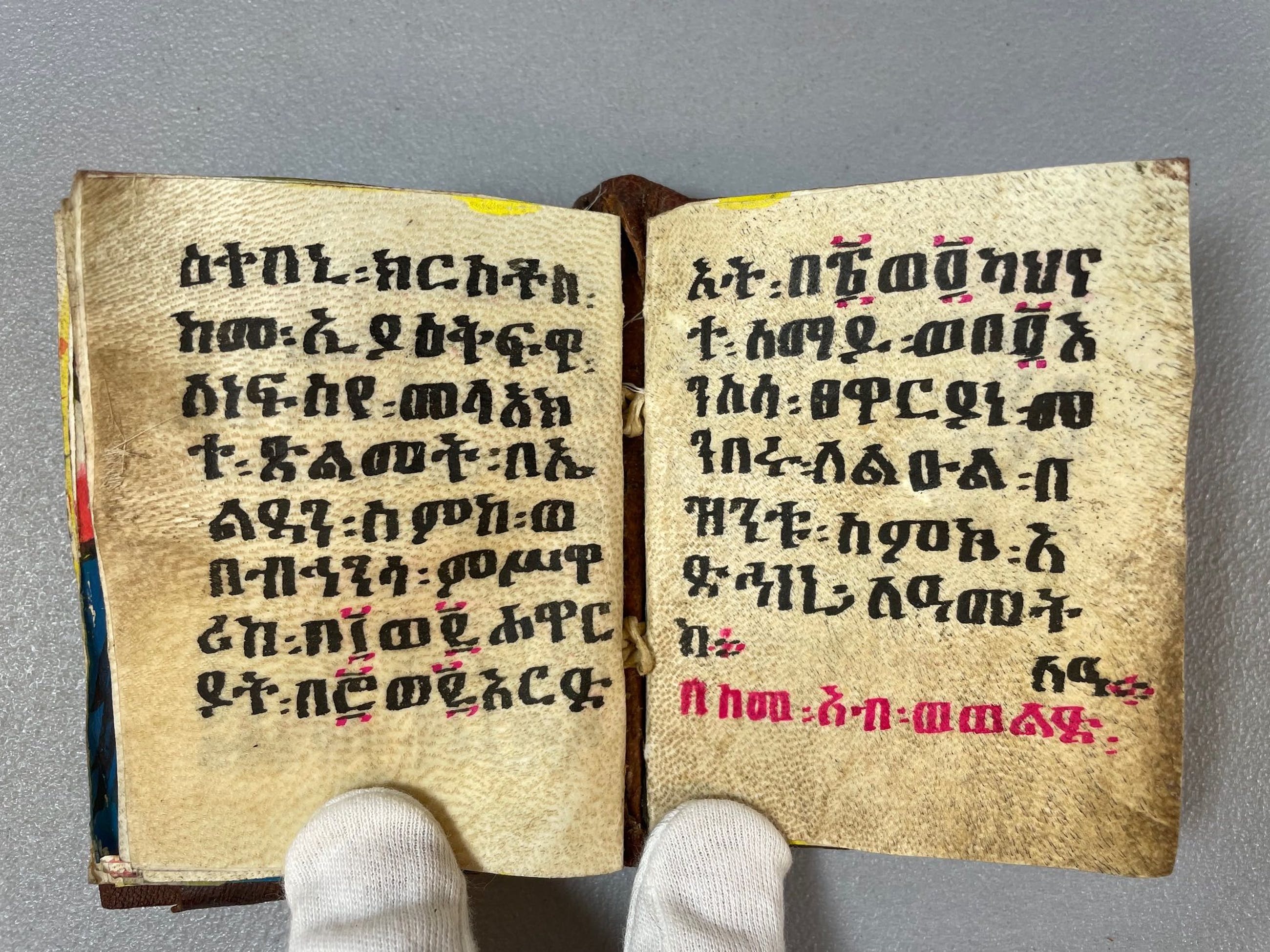 Each page written by hand in Ge'ez on using red and black ink and bound in a cover - there are vellum pages and the velum is fine parchment from a calf or goat skin - the red ink is used for religious saints or names of holy figures - see photographs for condition.