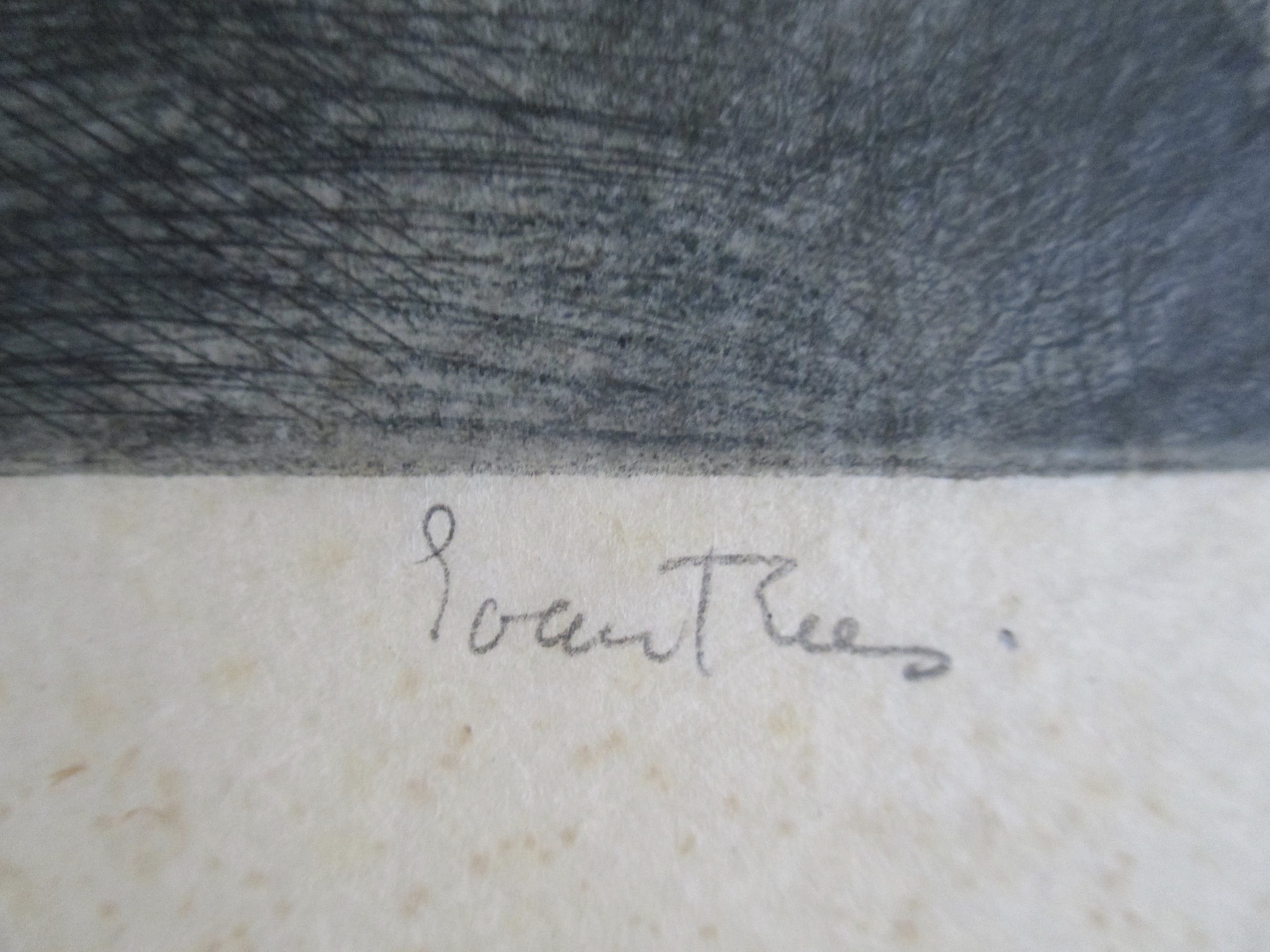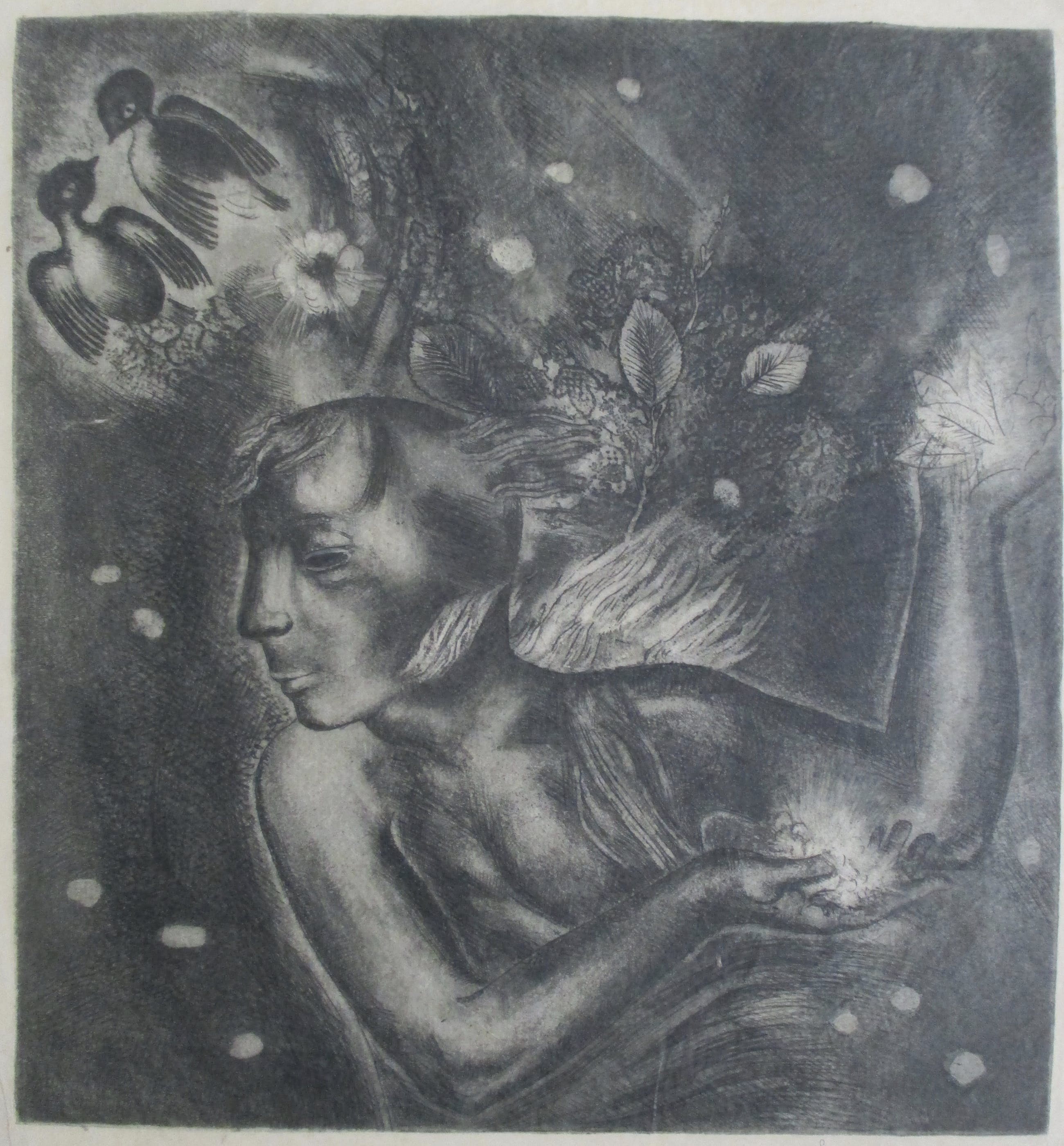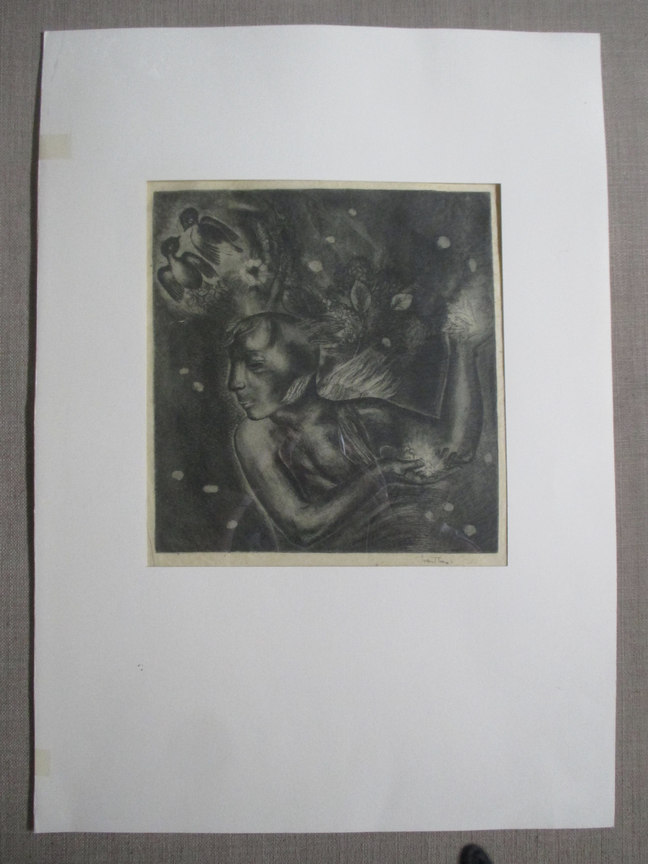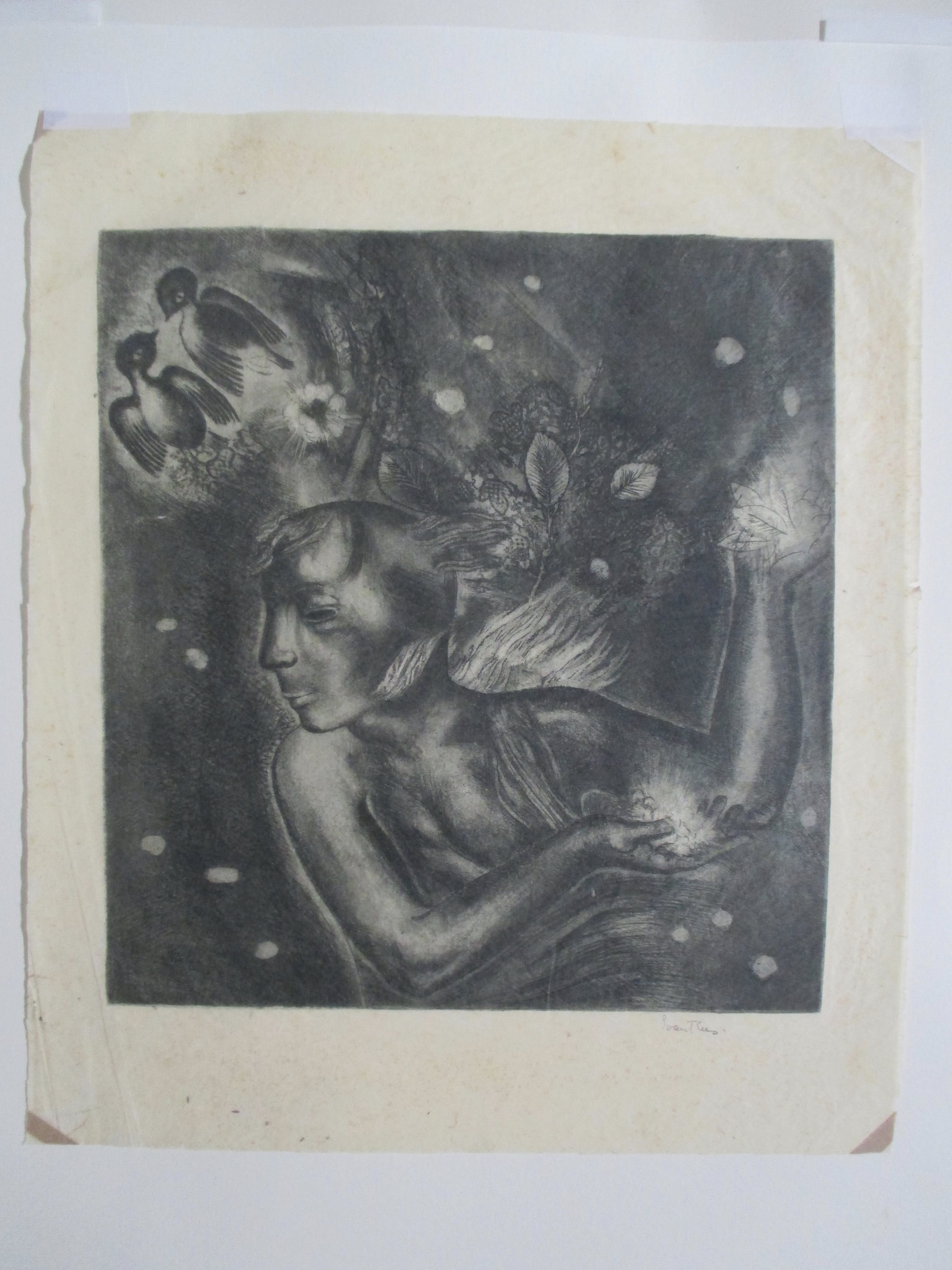 Ets op dun geschept papier van Etie van Rees, gesigneerd in potlood. geplaatst (bovenin getipt) in eenvoudig slap papieren passe-partout. verzending tussen twee platen, 8,25, aangetekend 9,95
