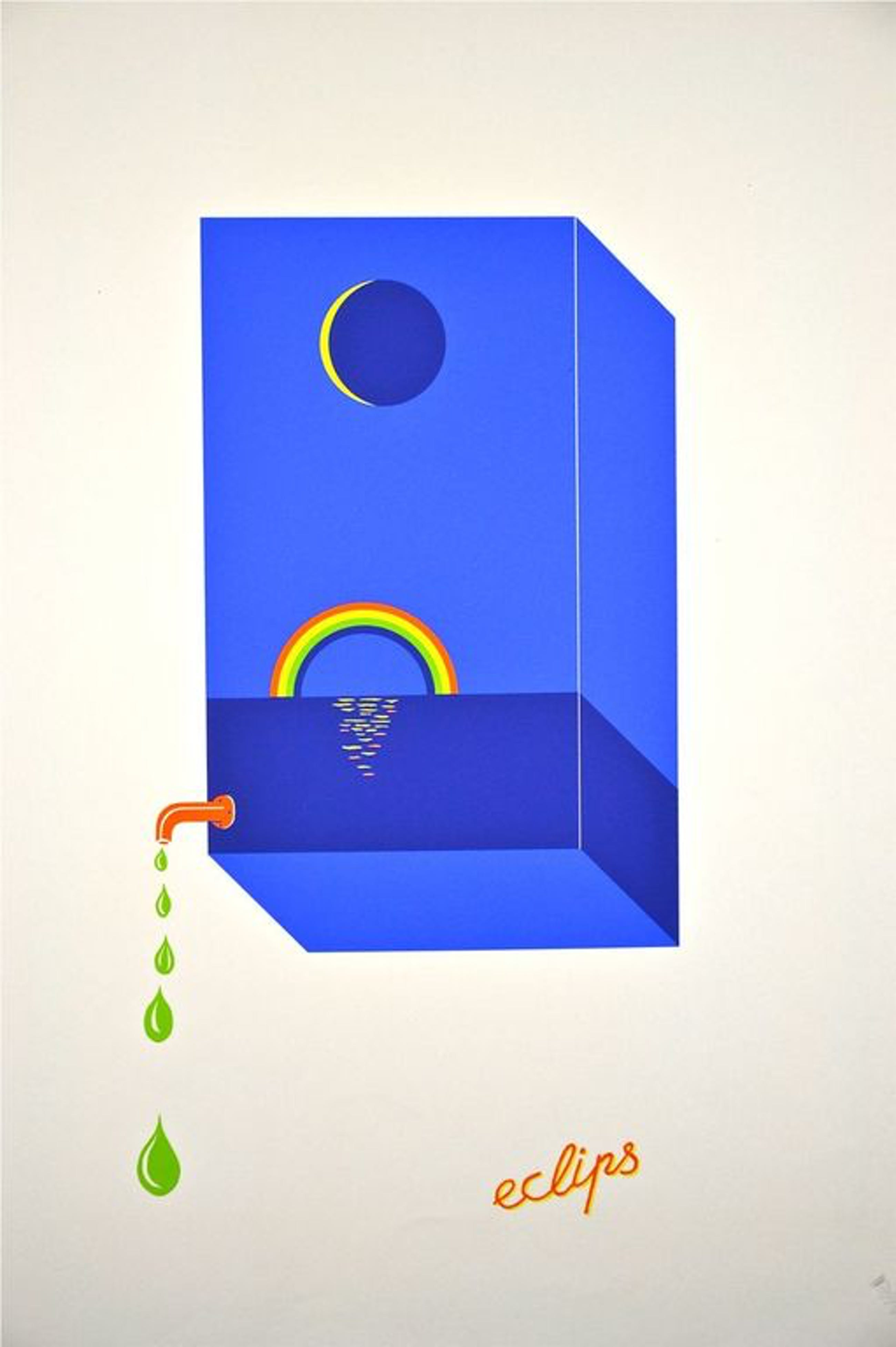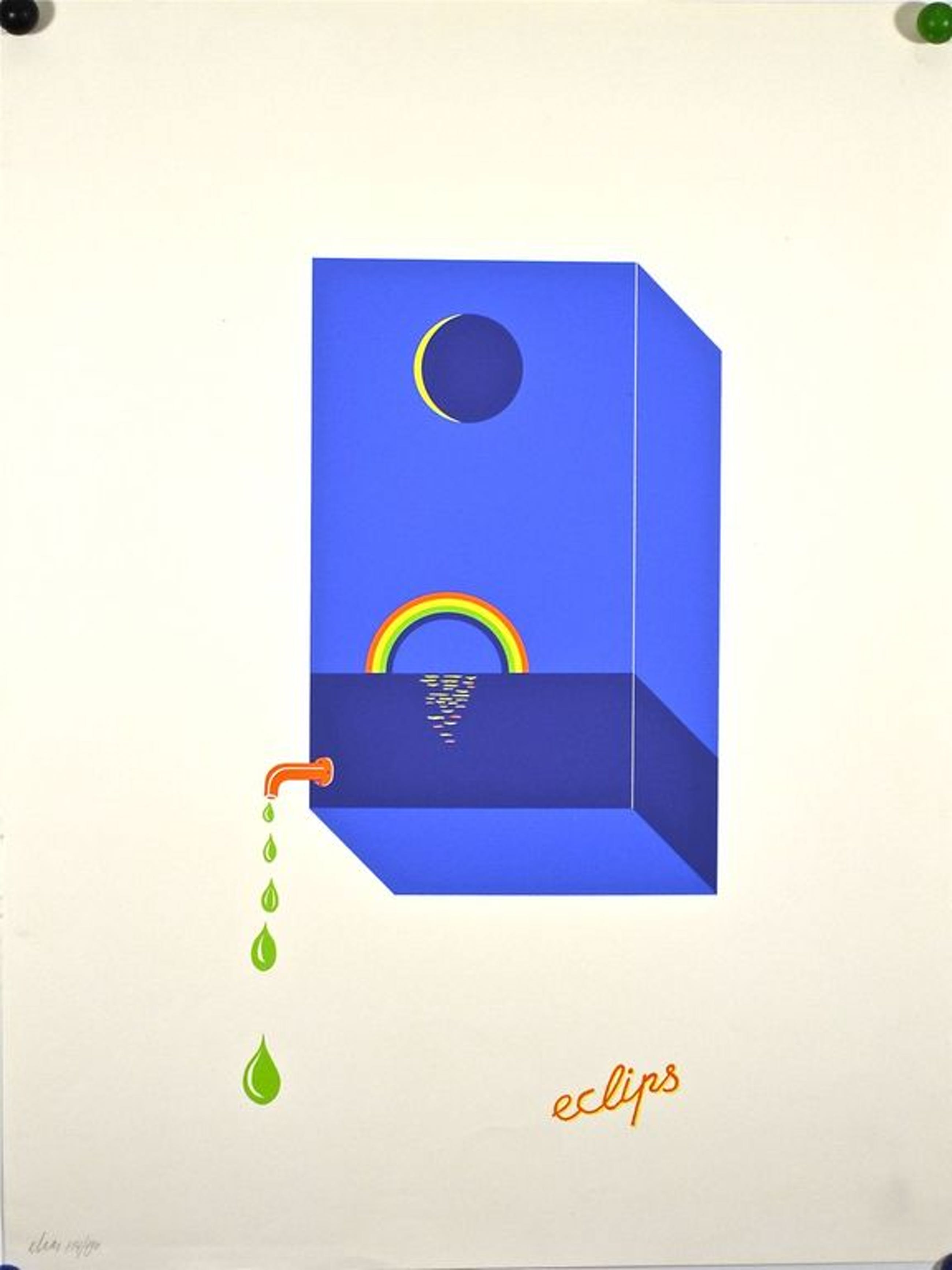 Binnen het beeld in zeer goede staat. De bovenhoeken hebben wat hele lichte kreukjes. Ook is er een heel licht kreuklijntje te zien onder het woord “eclips”. Natuurlijk is de achtergrond gewoon wit. Dit vertekent wat op de foto.