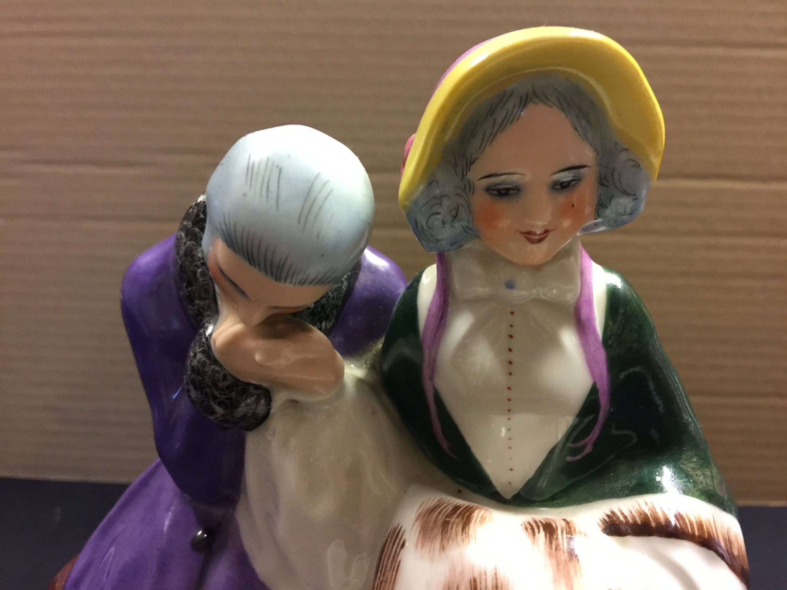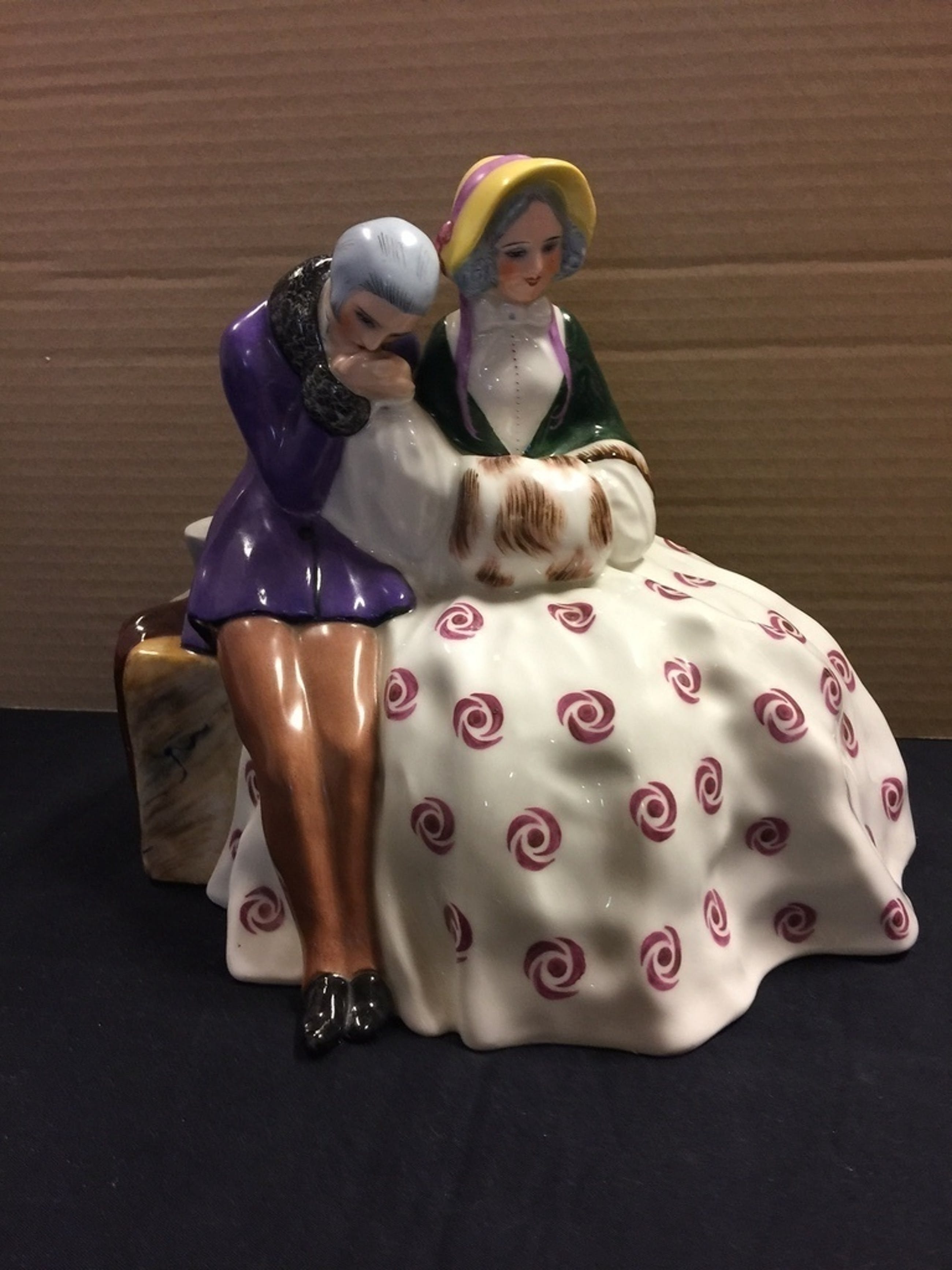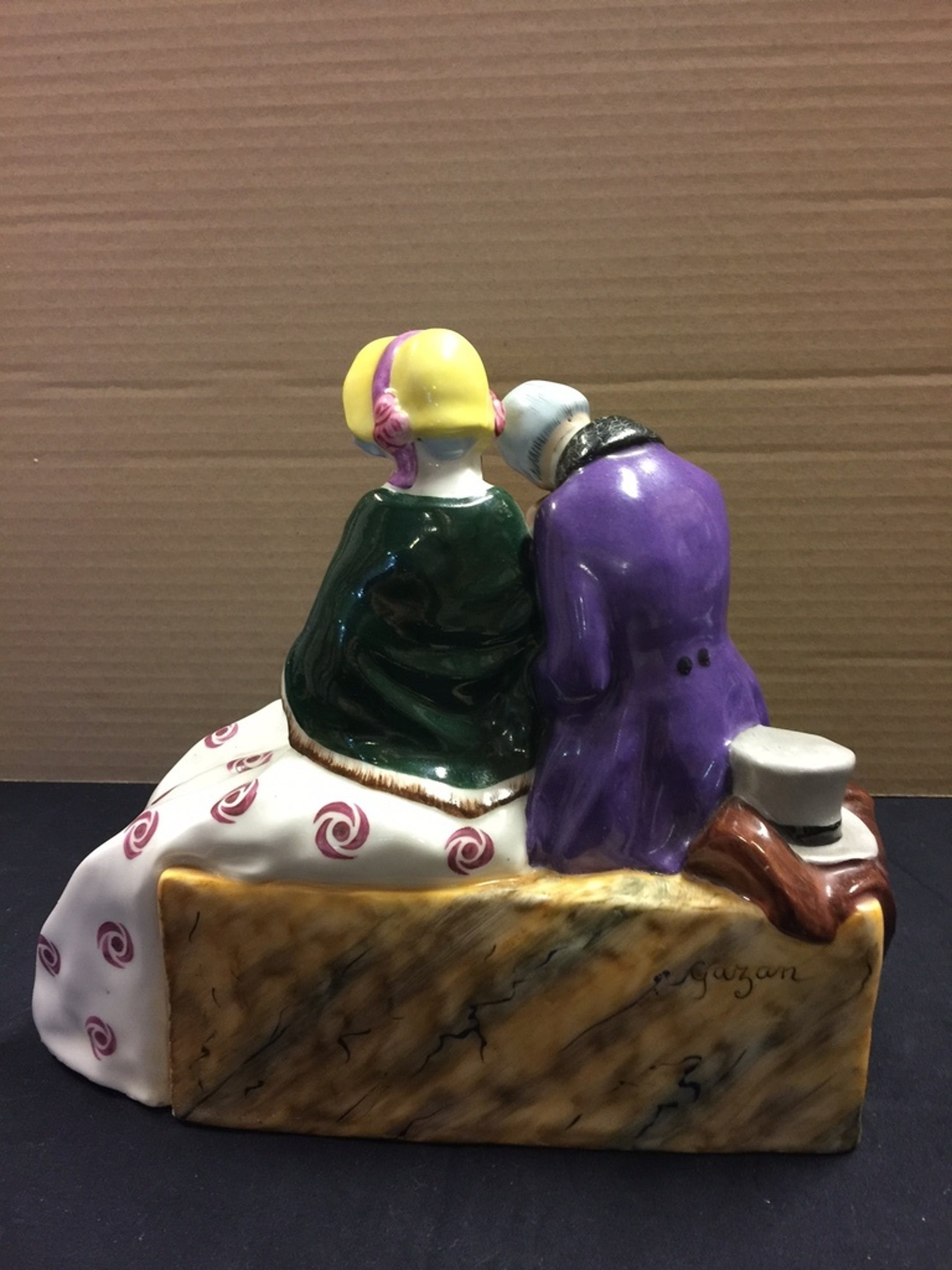 Het is een beeld met prachtige details: de gemarmerde steen waarop het liefdespaar zit, de fijnzinnig geschilderde gezichtjes, kleding van de vrouw en man. De detaillering is te zien op de foto's die onderdeel zijn van dit kavel.