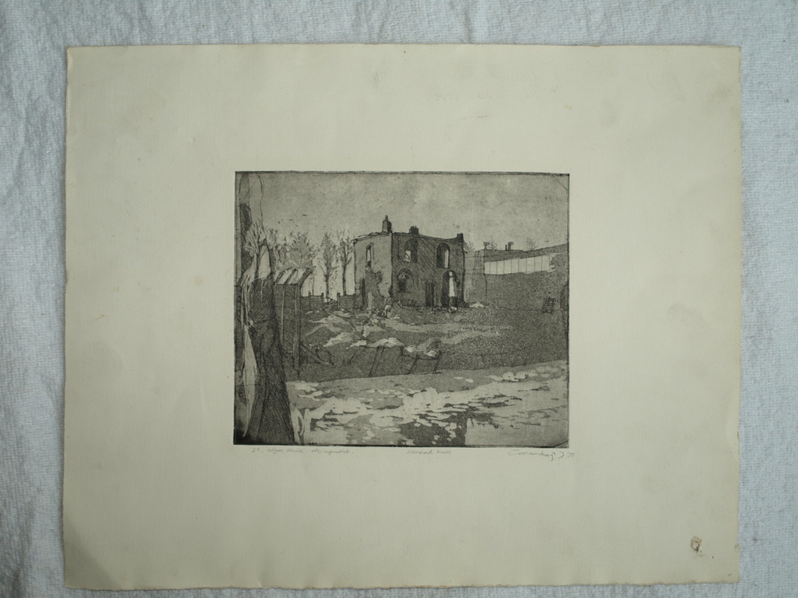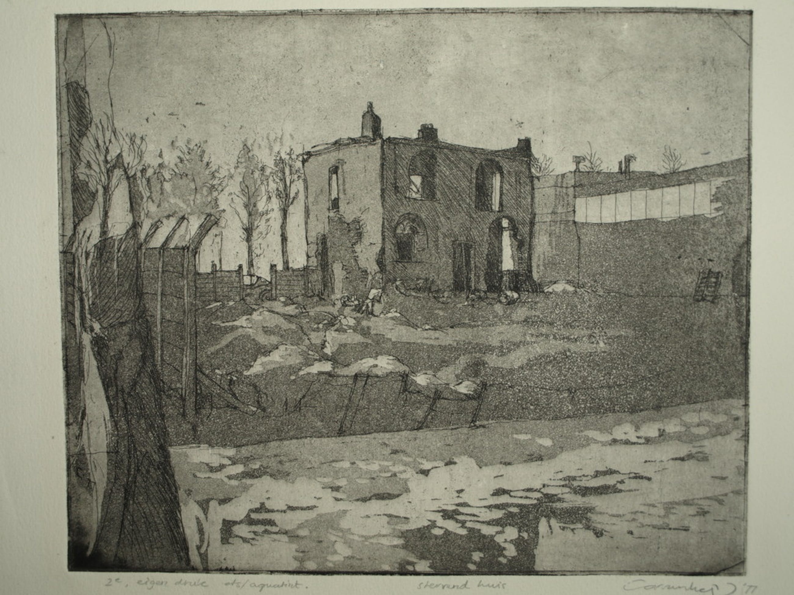 Een ets met aquatint van een ‘ruïne’ (“Stervend huis”) uit 1977. Handgesigneerd met potlood. Helaas hebben wij de naam van de kunstenaar niet kunnen achterhalen.
