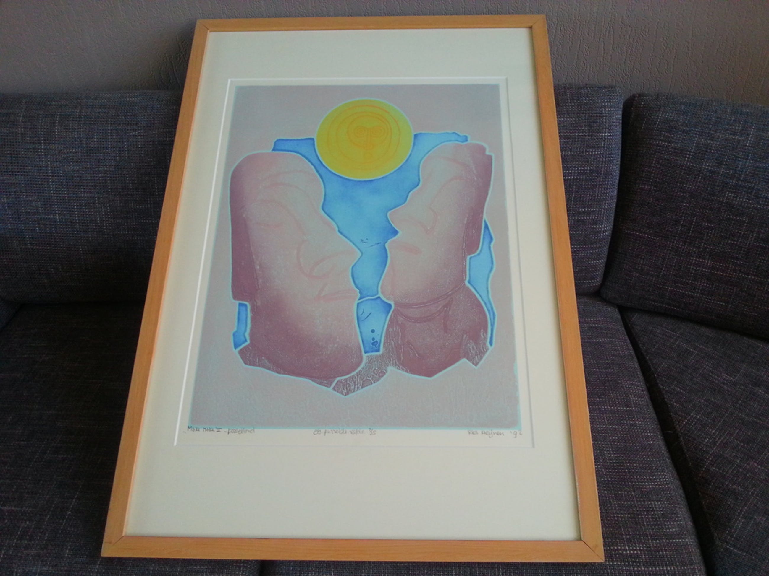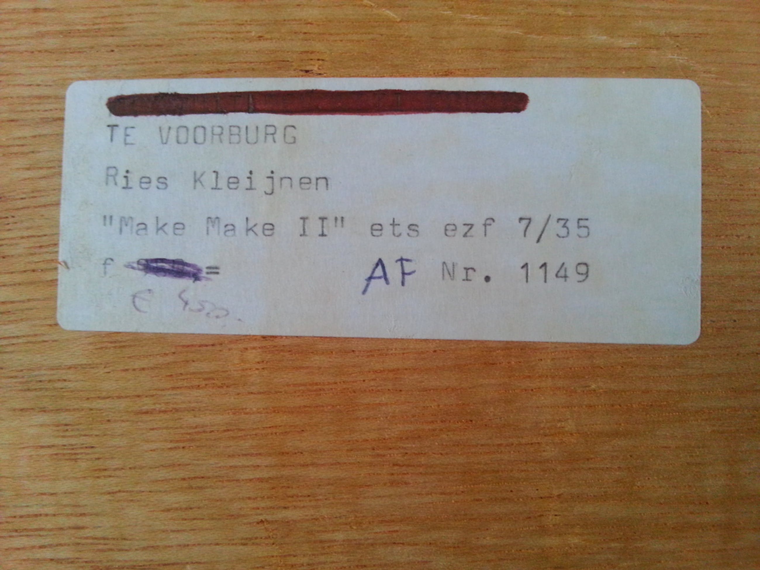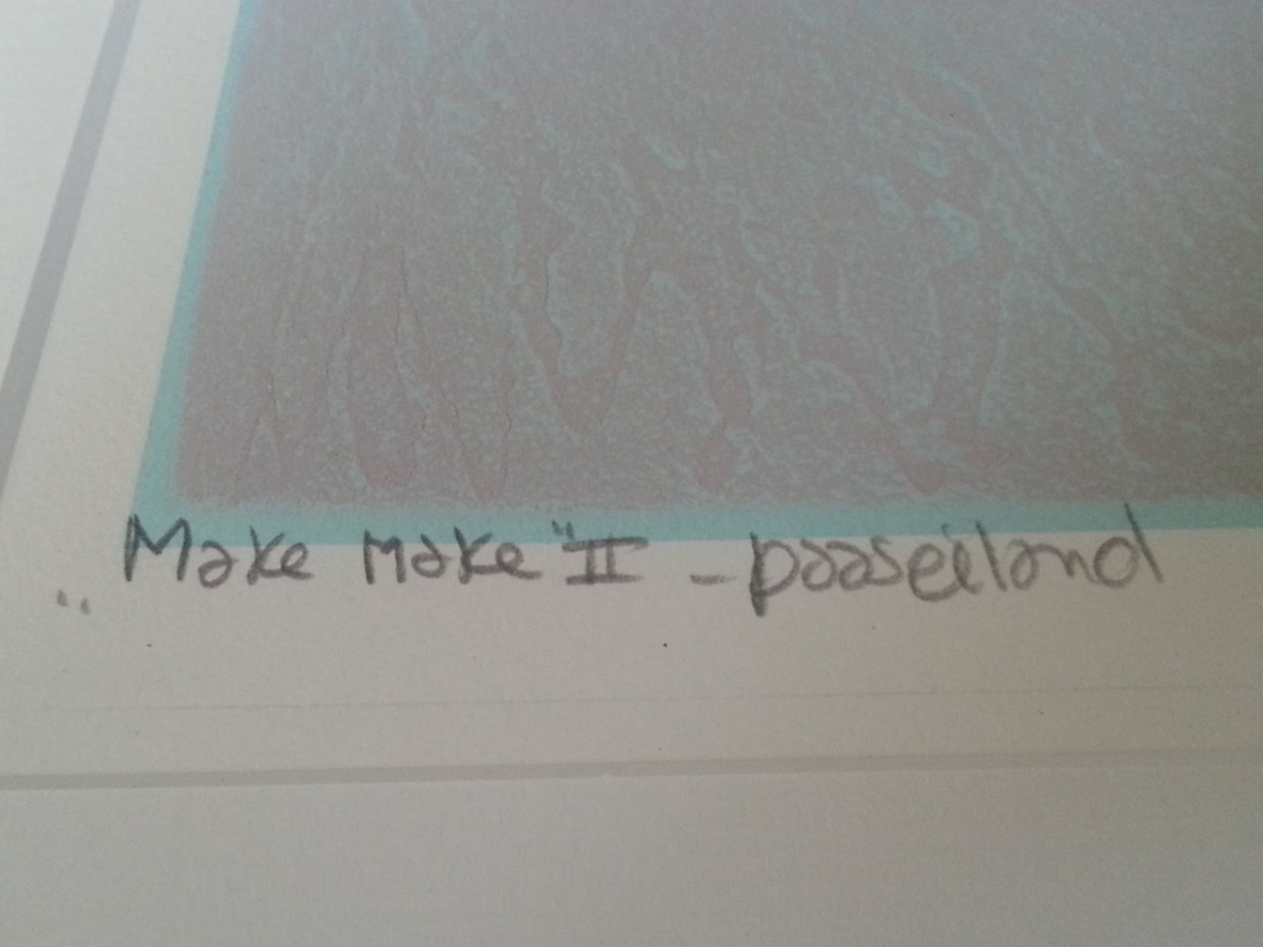 Ets, Puzzeldruk, Zeefdruk. Ries Kleijnen, 92. Titel: Make, Make-Paaseiland. Het schilderij verkeert in perfecte staat zonder enige mankementen, (Geen verkleuringen of plekken) afm totaal: 69 cm bij 99 cm. beeldformaat: 52 cm bij 68 cm. Oplage: 7/35. Met ophangmogelijkheid. Wegens gewicht en afmeting kan het schilderij alleen opgehaald worden. Locatie, Rotterdam.