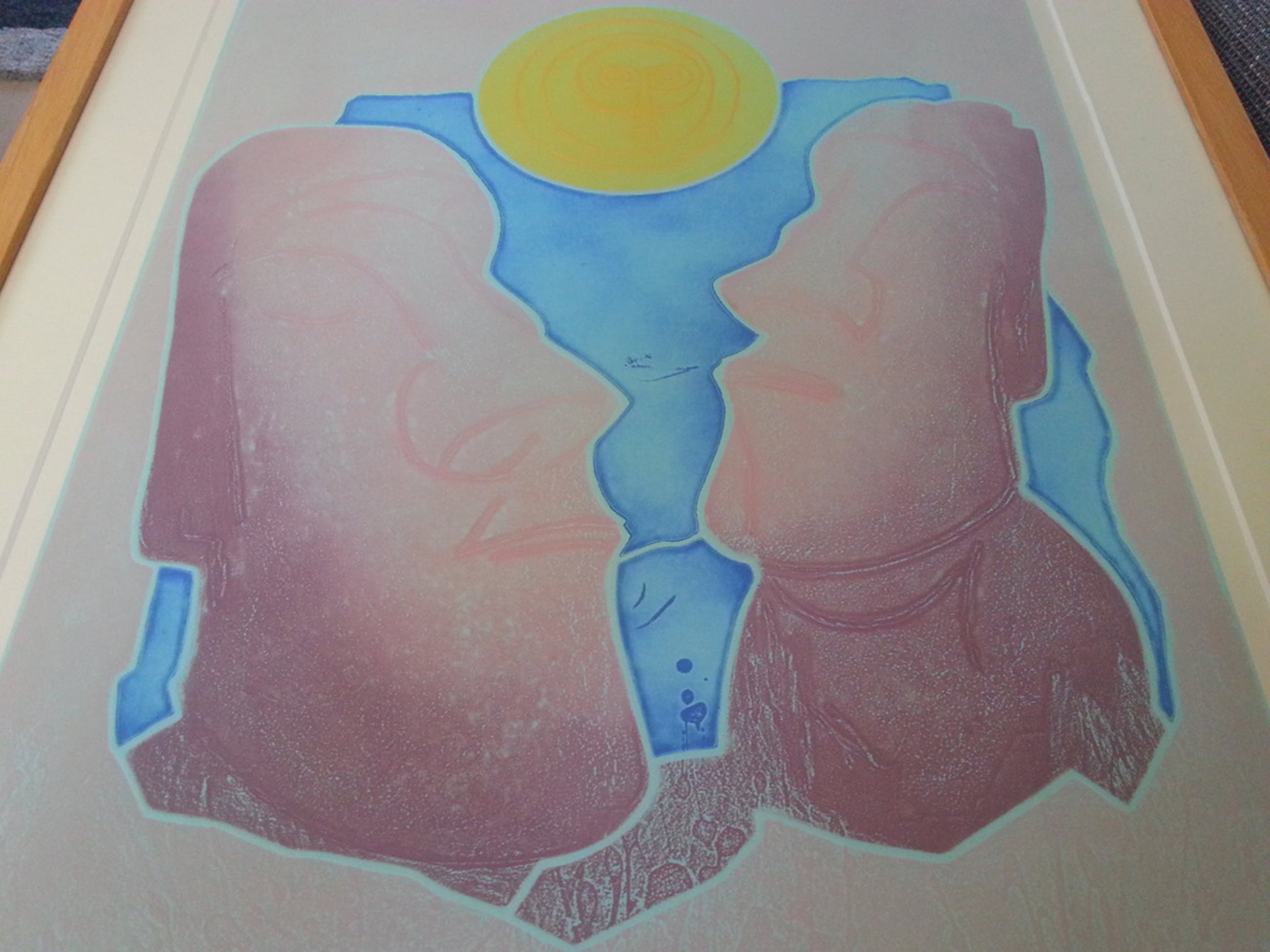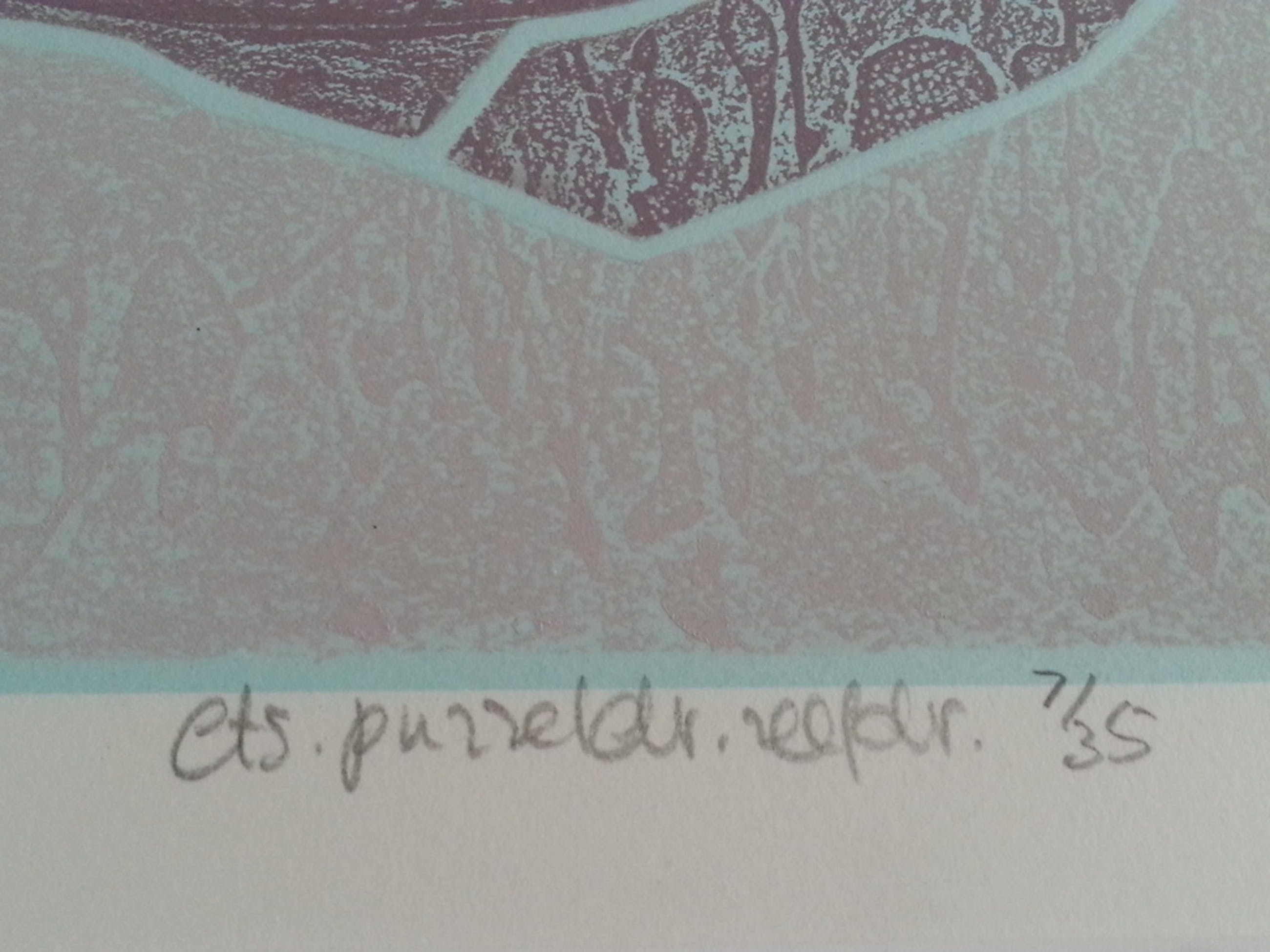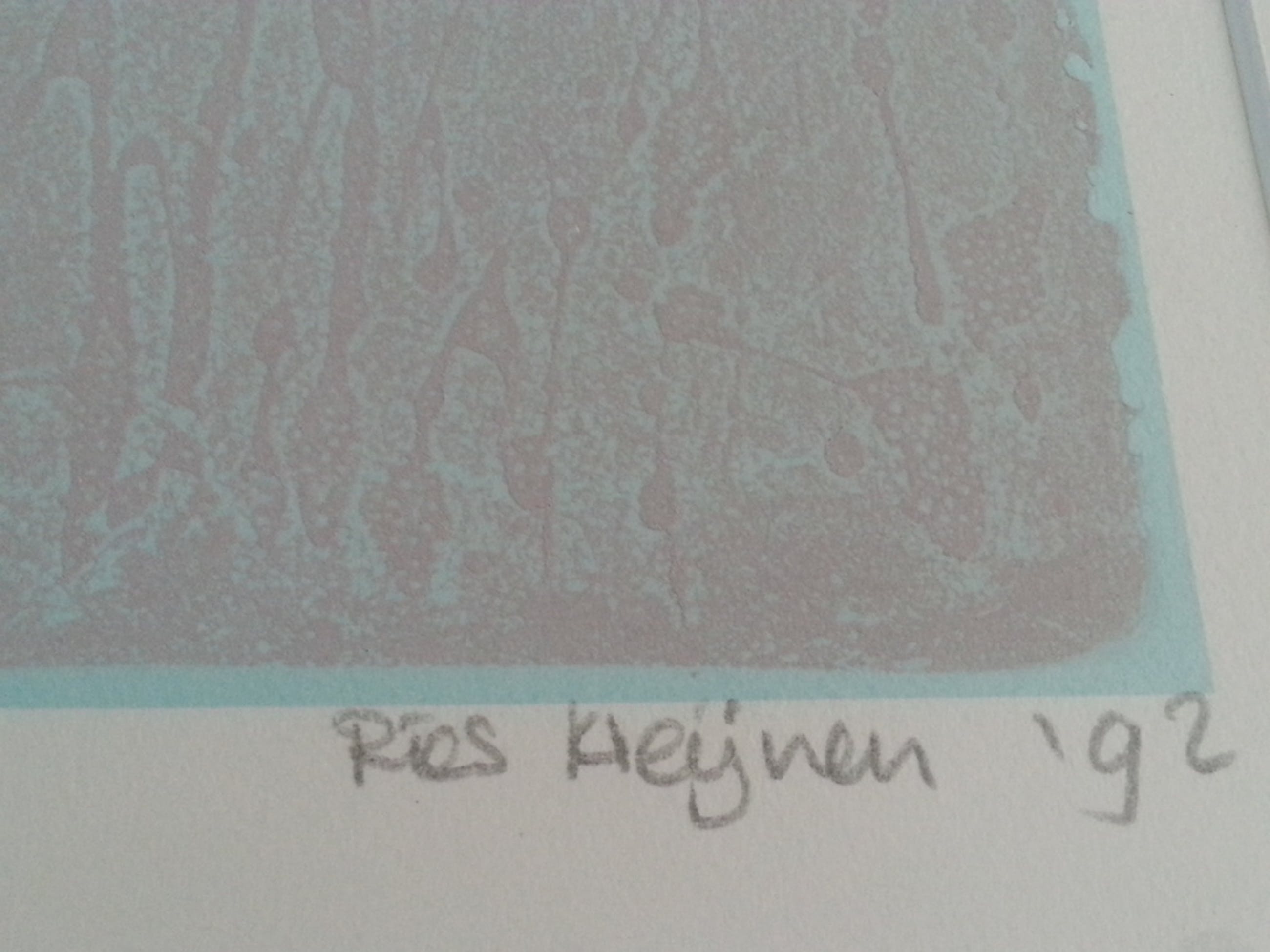 Ets, Puzzeldruk, Zeefdruk. Ries Kleijnen, 92. Titel: Make, Make-Paaseiland. Het schilderij verkeert in perfecte staat zonder enige mankementen, (Geen verkleuringen of plekken) afm totaal: 69 cm bij 99 cm. beeldformaat: 52 cm bij 68 cm. Oplage: 7/35. Met ophangmogelijkheid. Wegens gewicht en afmeting kan het schilderij alleen opgehaald worden. Locatie, Rotterdam.