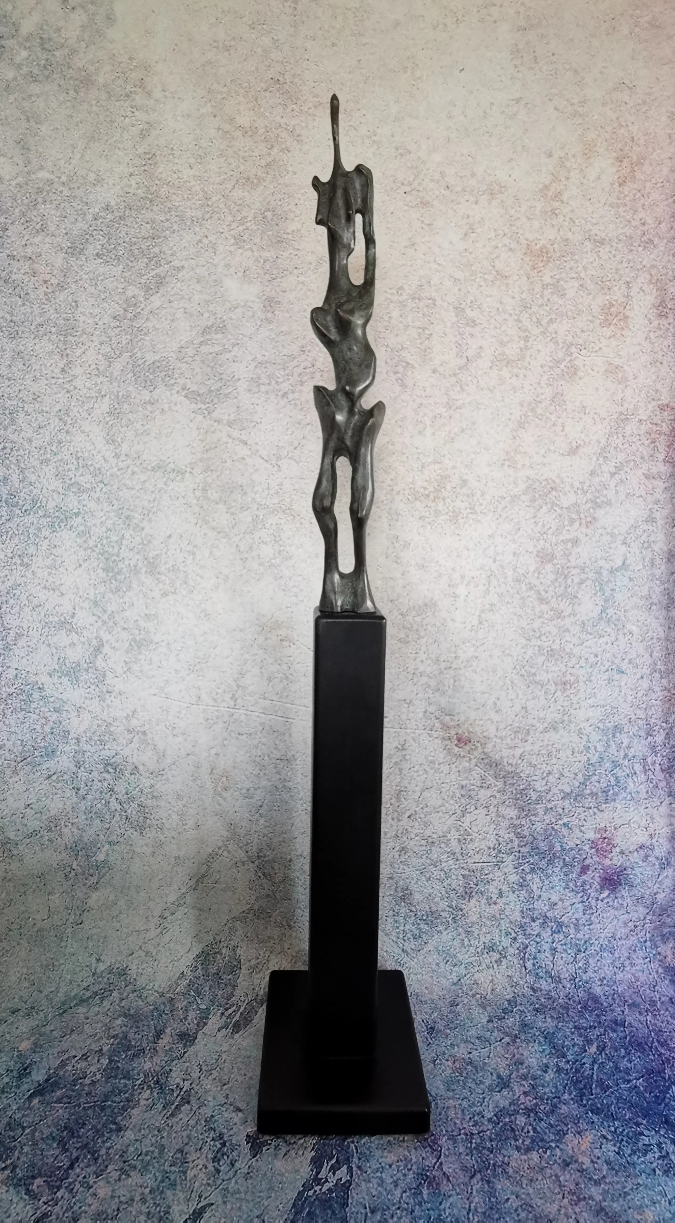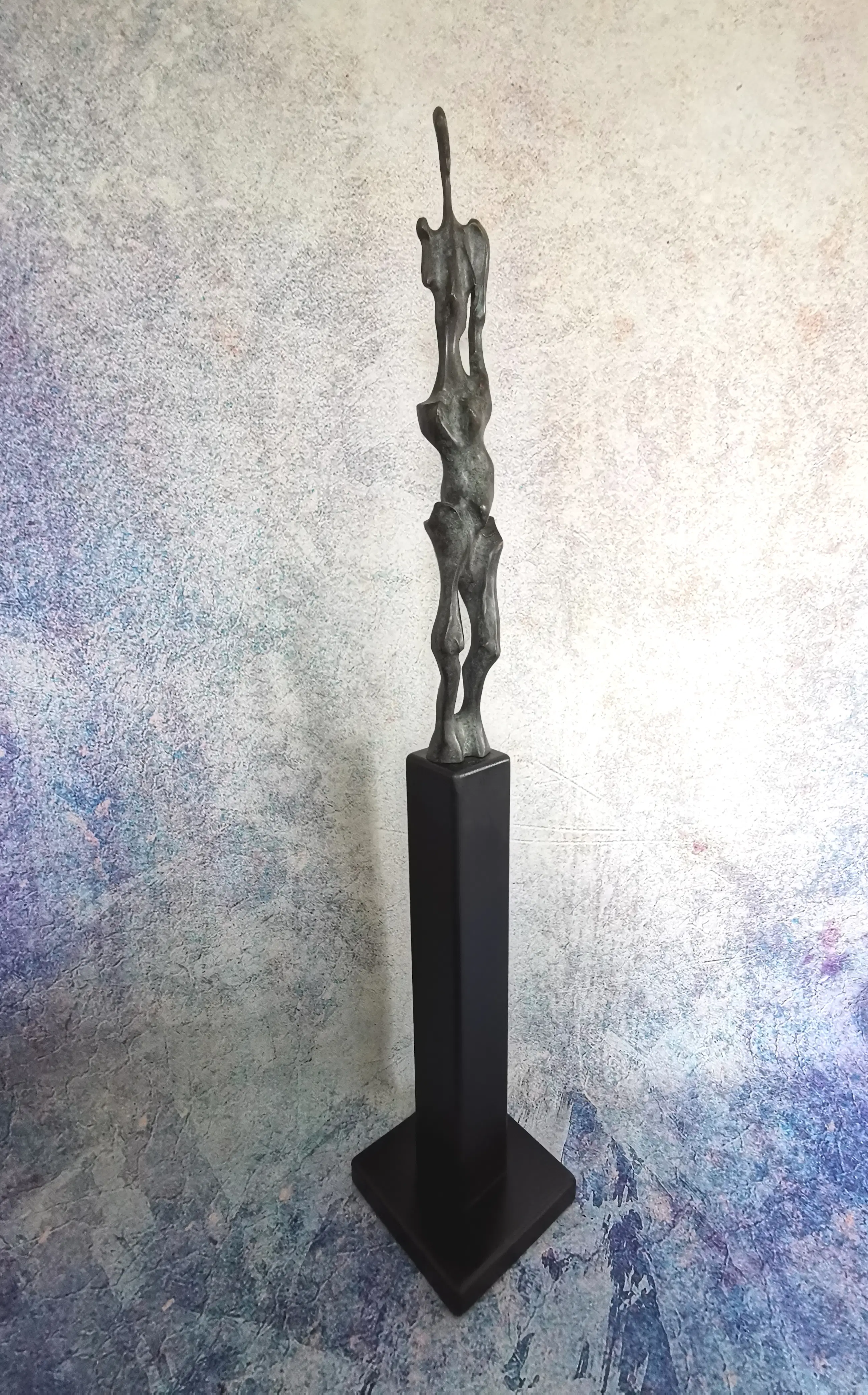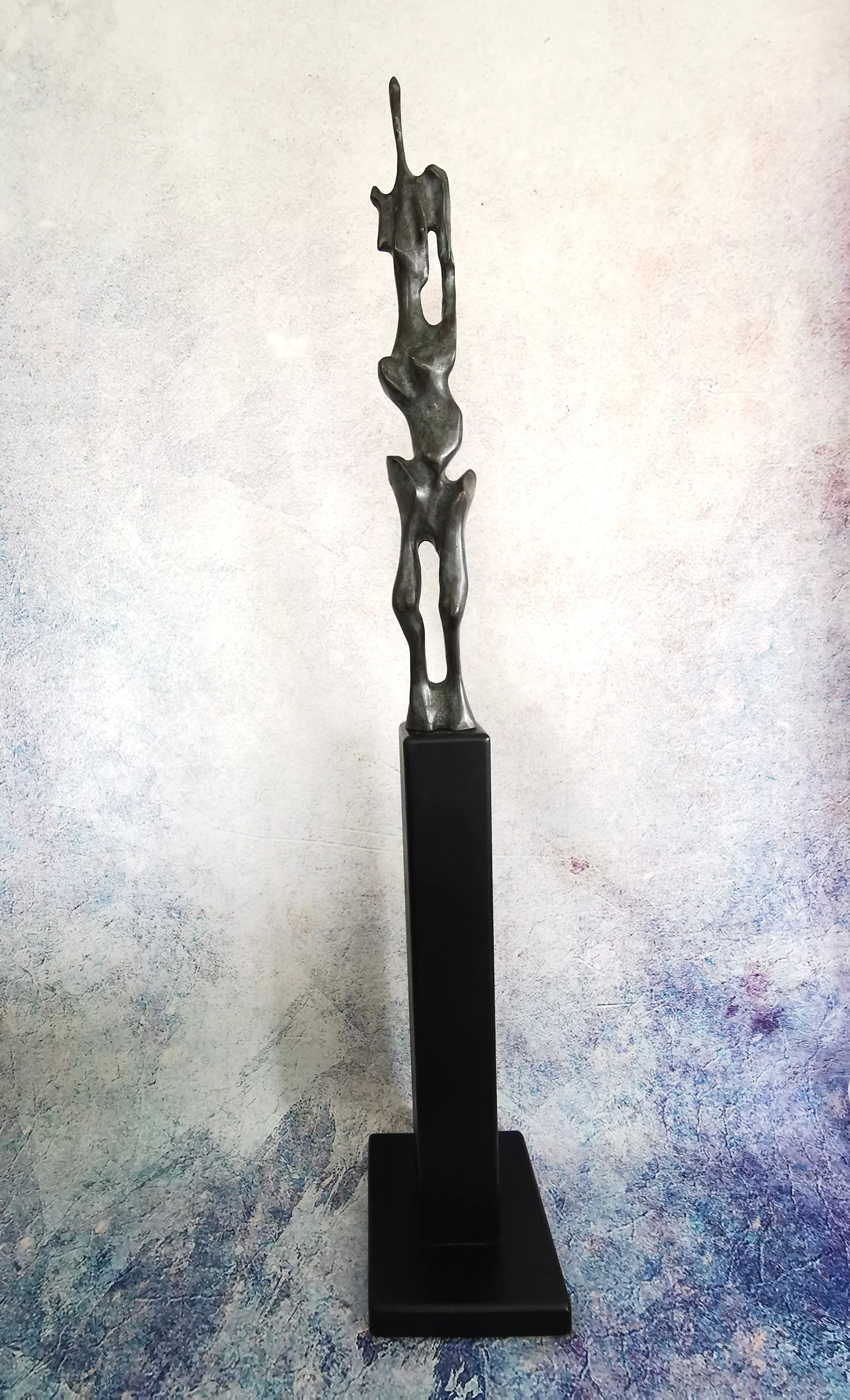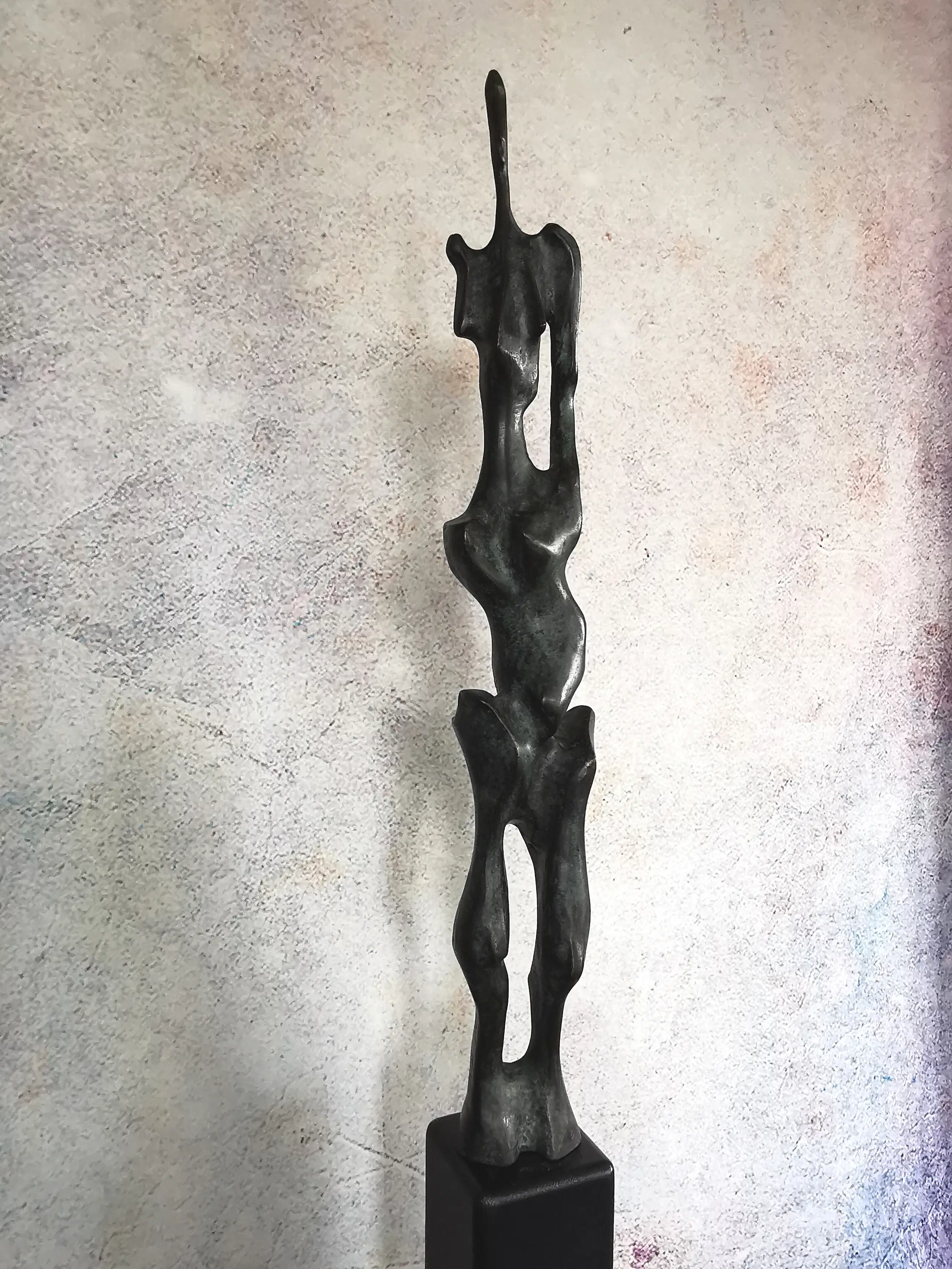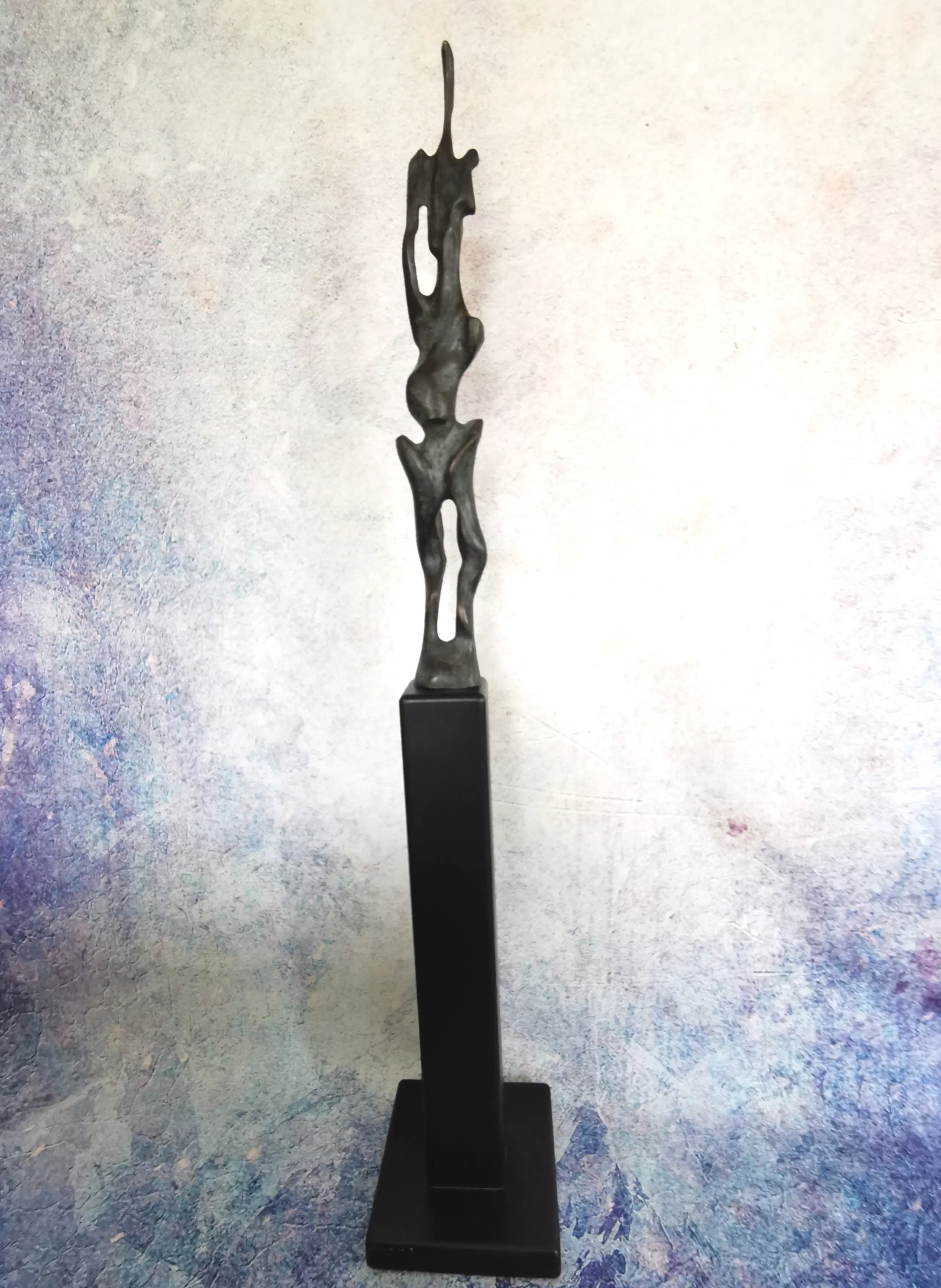 Prachtig groot abstract bronzen beeld met origineel gesigneerde houten sokkel.