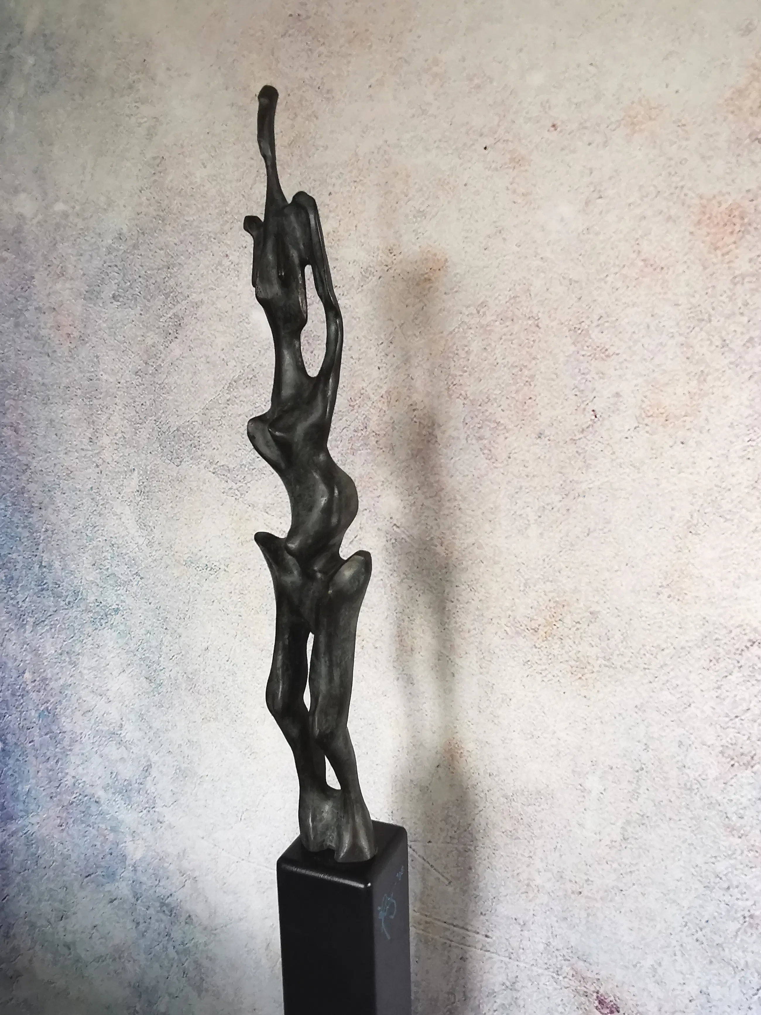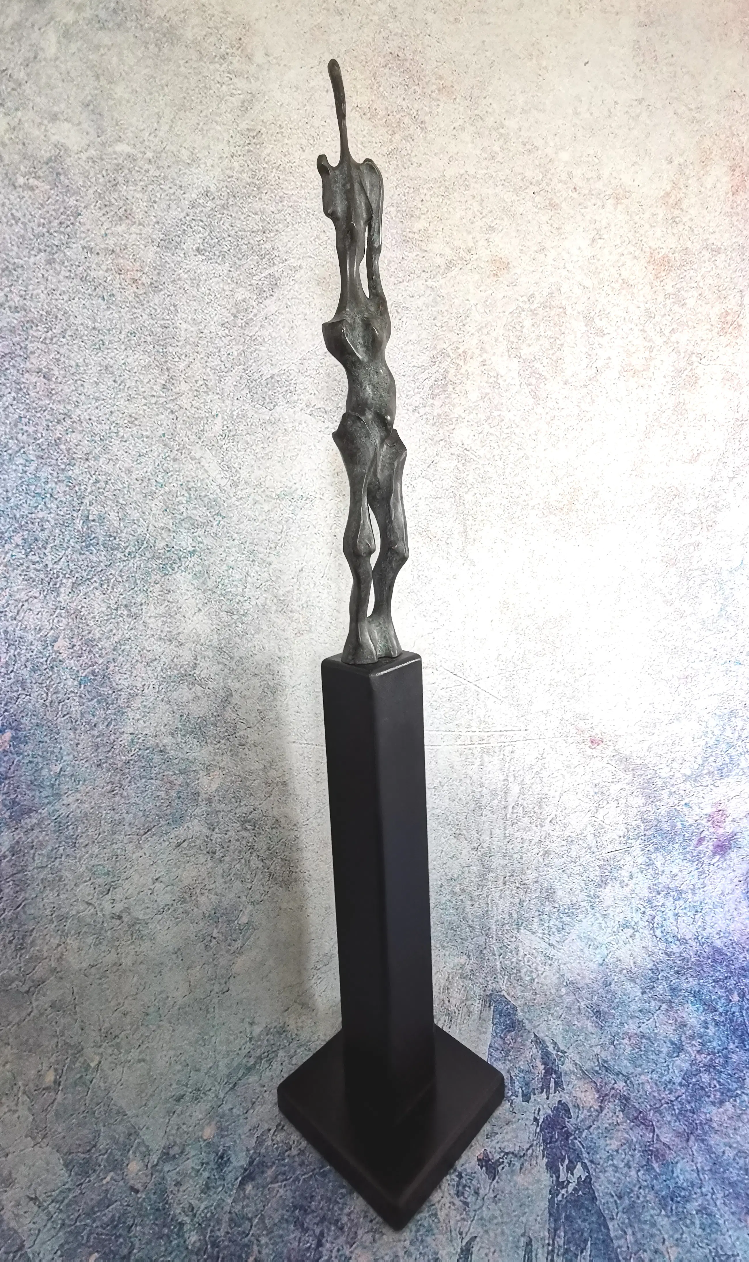 Het bronzen sculptuur zonder sokkel meet 75 cm hoog en circa 13 cm breed en 10 cm diep. ( De houten voet meet 26 cm diep bij 25 cm breed. )