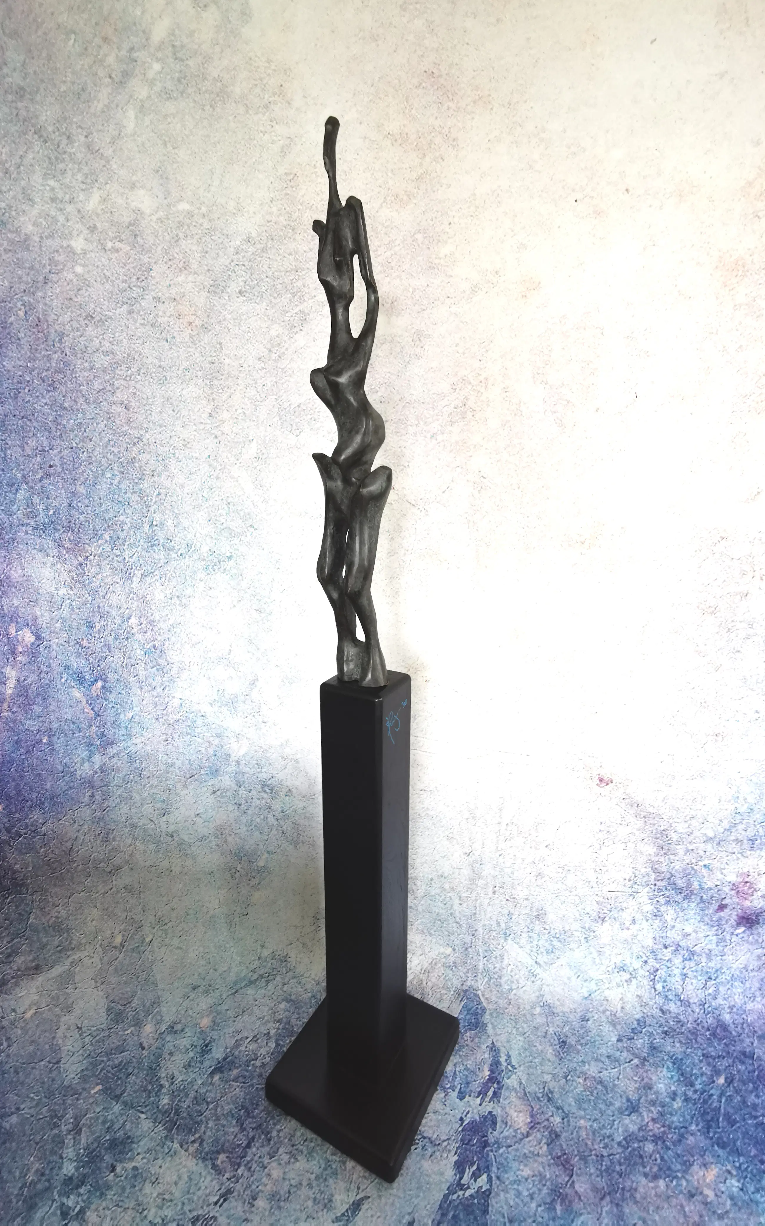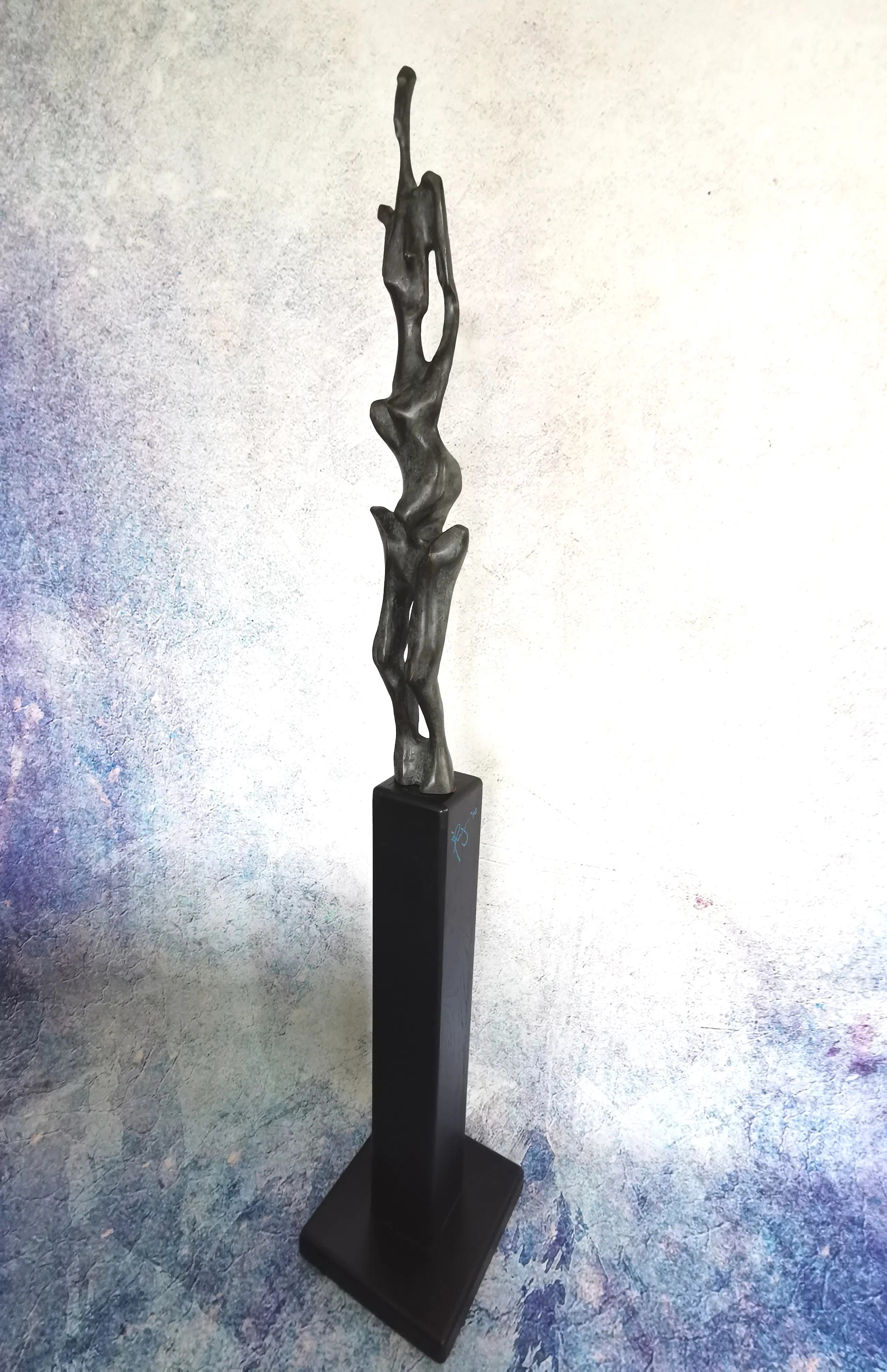 Het bronzen sculptuur zit los gemonteerd in de houten sokkel. ( Bij transport kan deze dus naast de sokkel verstuurd worden. )