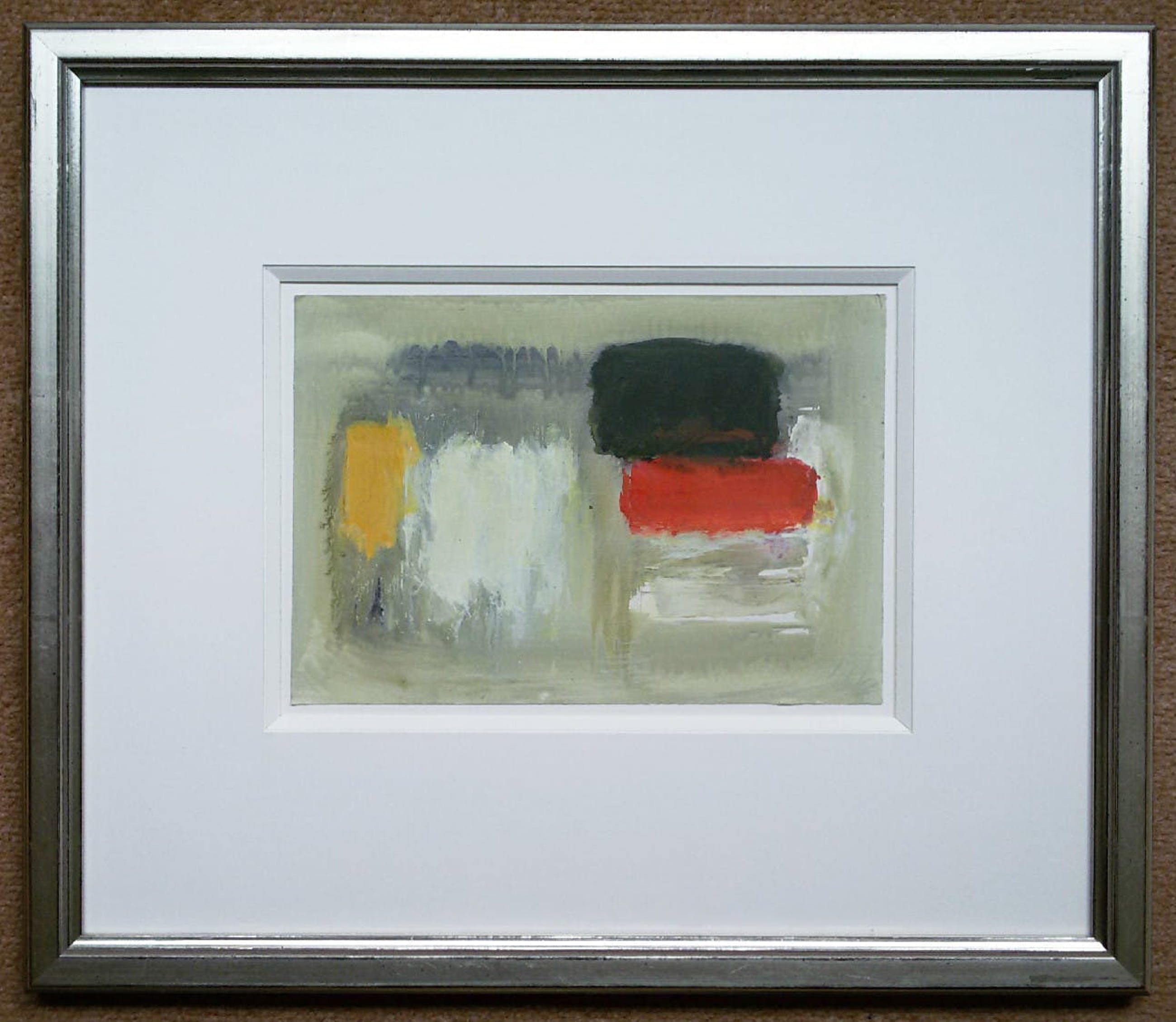 Zeer mooie compositie van Eugène Brands uit 1994. Gouache op papier, in verso gesigneerd, en gedateerd (5.XII.’94). In mooie lijst, achter glas en met luxueus, diep passe-partout. Alles in uitstekende conditie.
