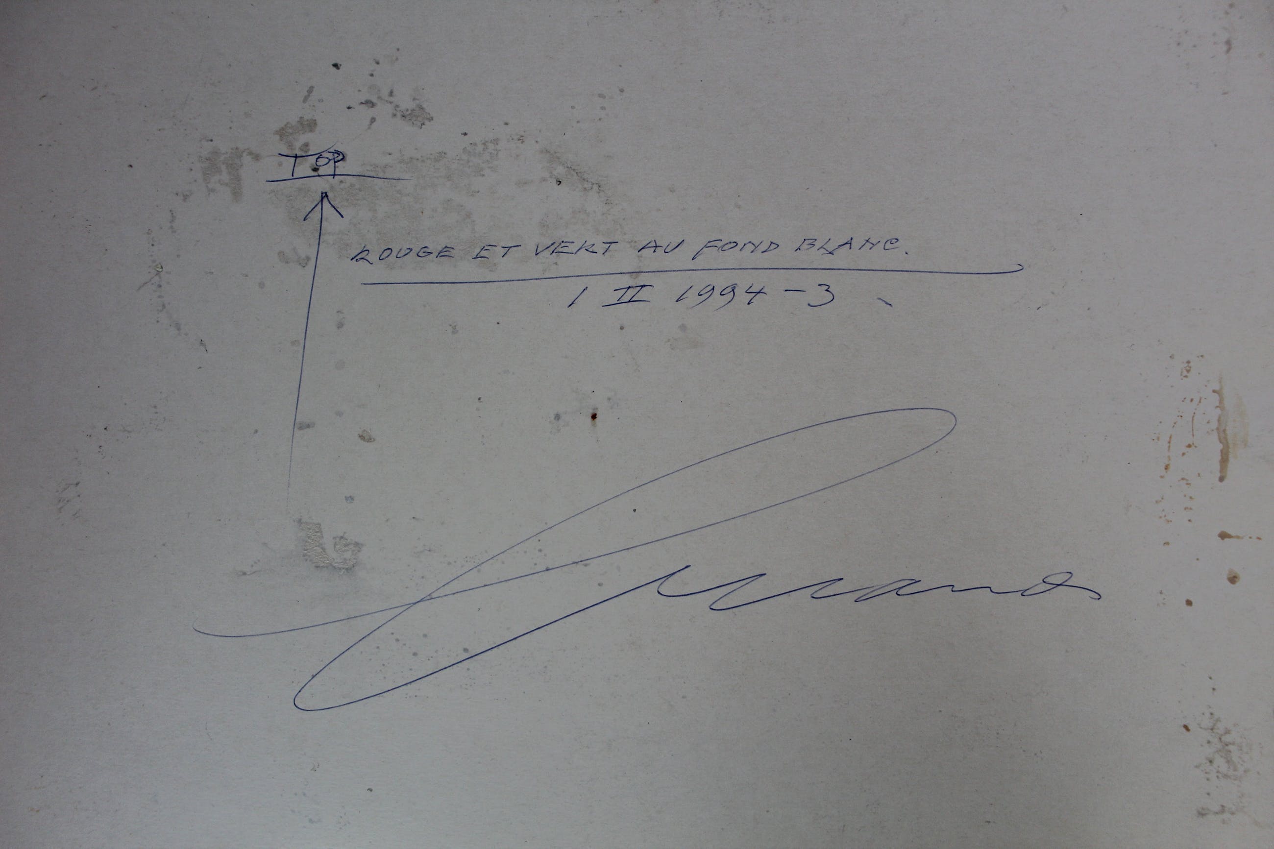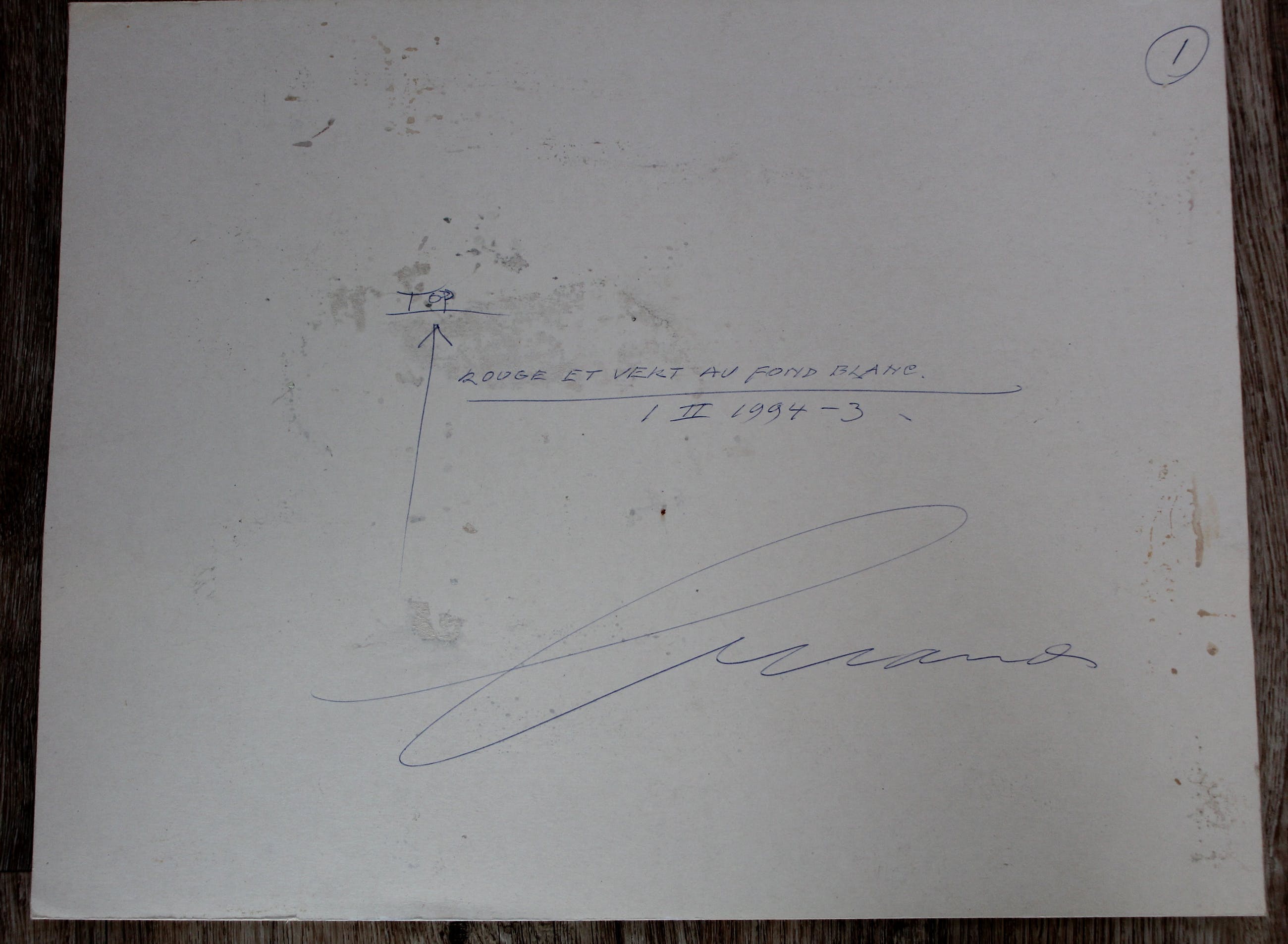 Aquarel van Eugene Brands. Jaar: 1994. Titel: rouge et vert au fond blanc. Afmetingen blad: H35 x b45cm. Afmetingen voorstelling: H25 xb38cm. Gesigneerd en genummerd op de achterzijde. De authenticiteit van deze werken wordt volledig gegarandeerd. Een certificaat van echtheid kan, op aanvraag, worden gemaild. Het werk is aangekocht van de dochter van Eugene Brands.