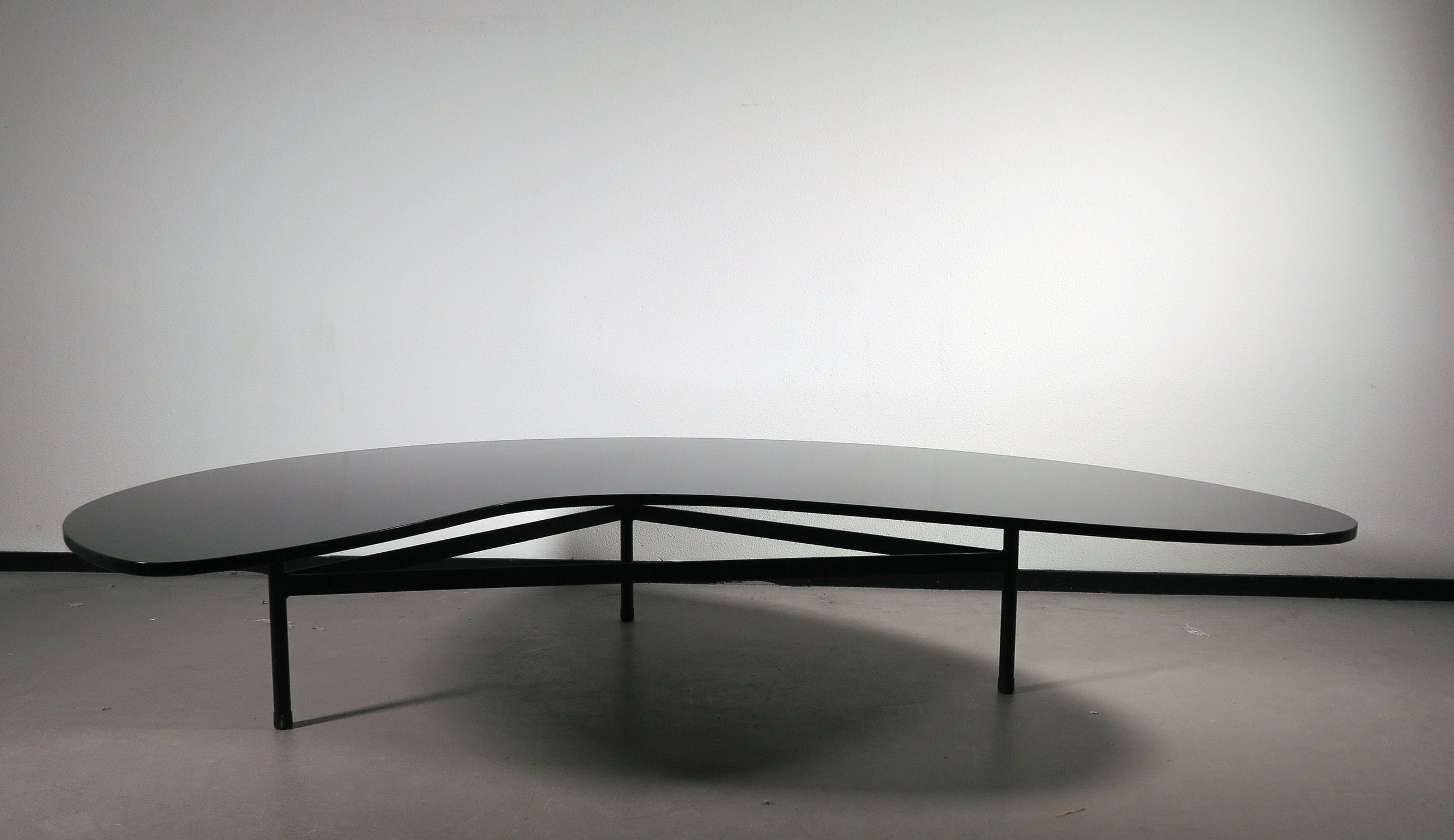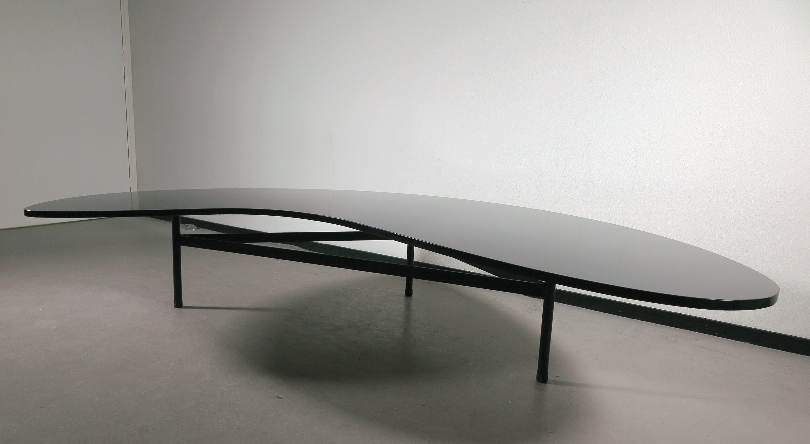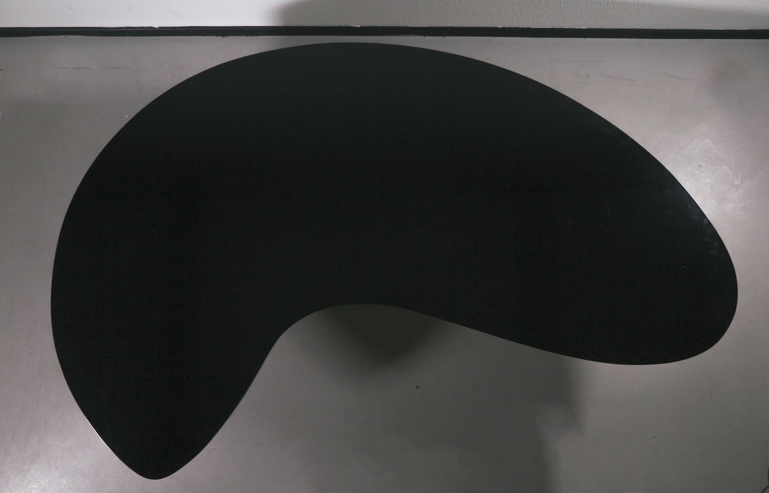 Een bijzonder uitstapje van de beroemde CoBrA-kunstenaar Eugène Brands: een Cobra-design tafel uit 1950. Het niervormige blad is zwart gelakt en wordt geplaatst op een driehoekige zwart onderstel. Het blad is 2 cm dik.