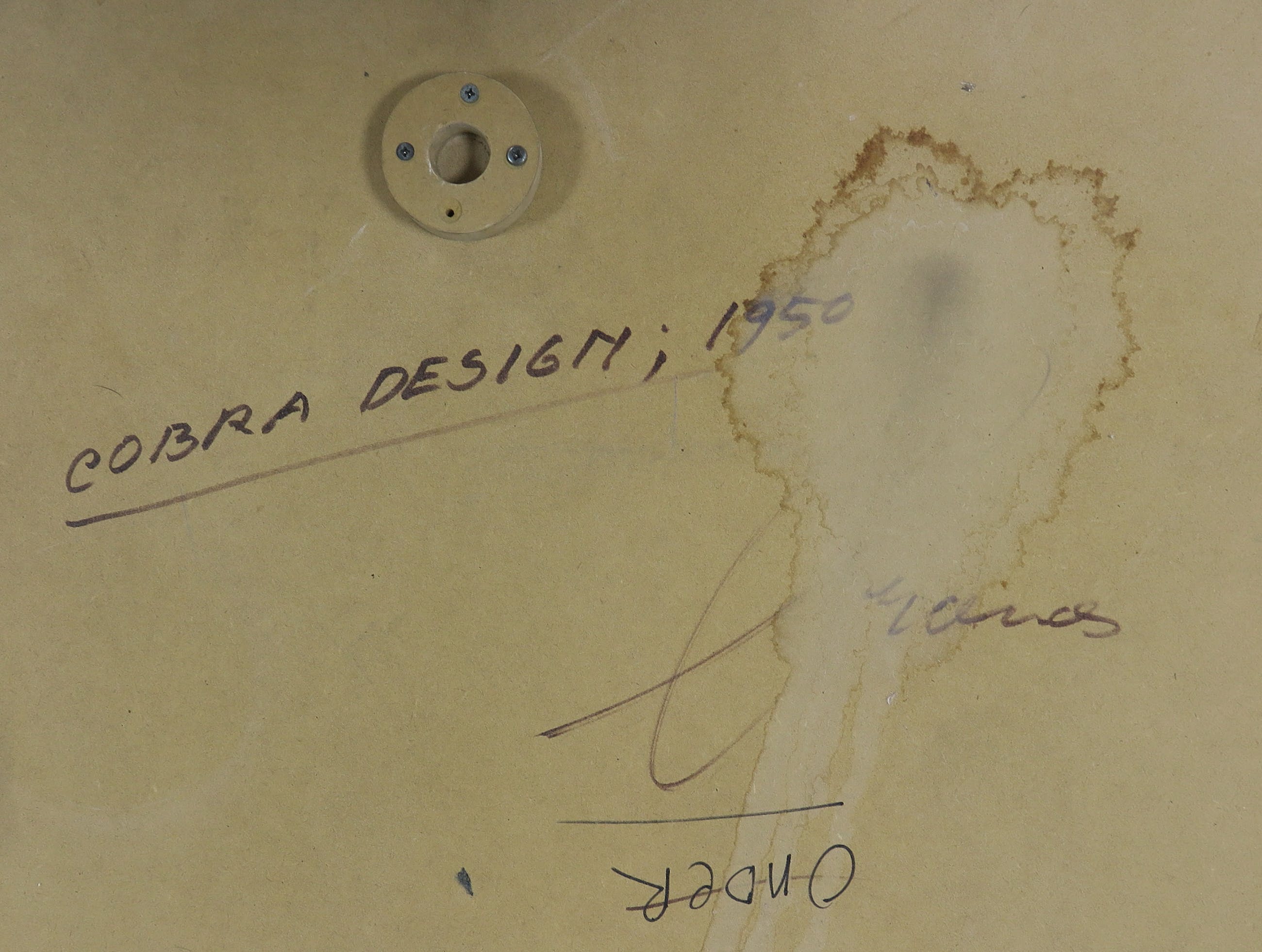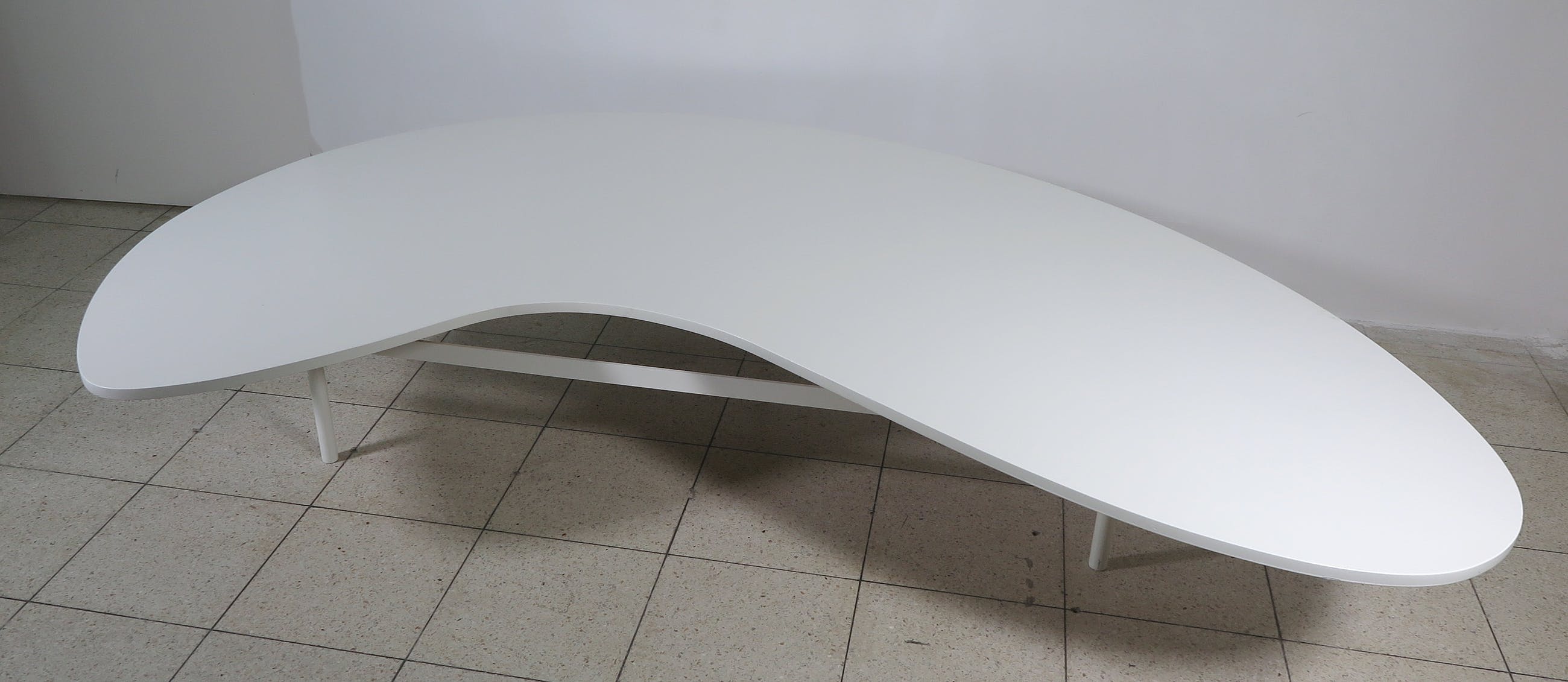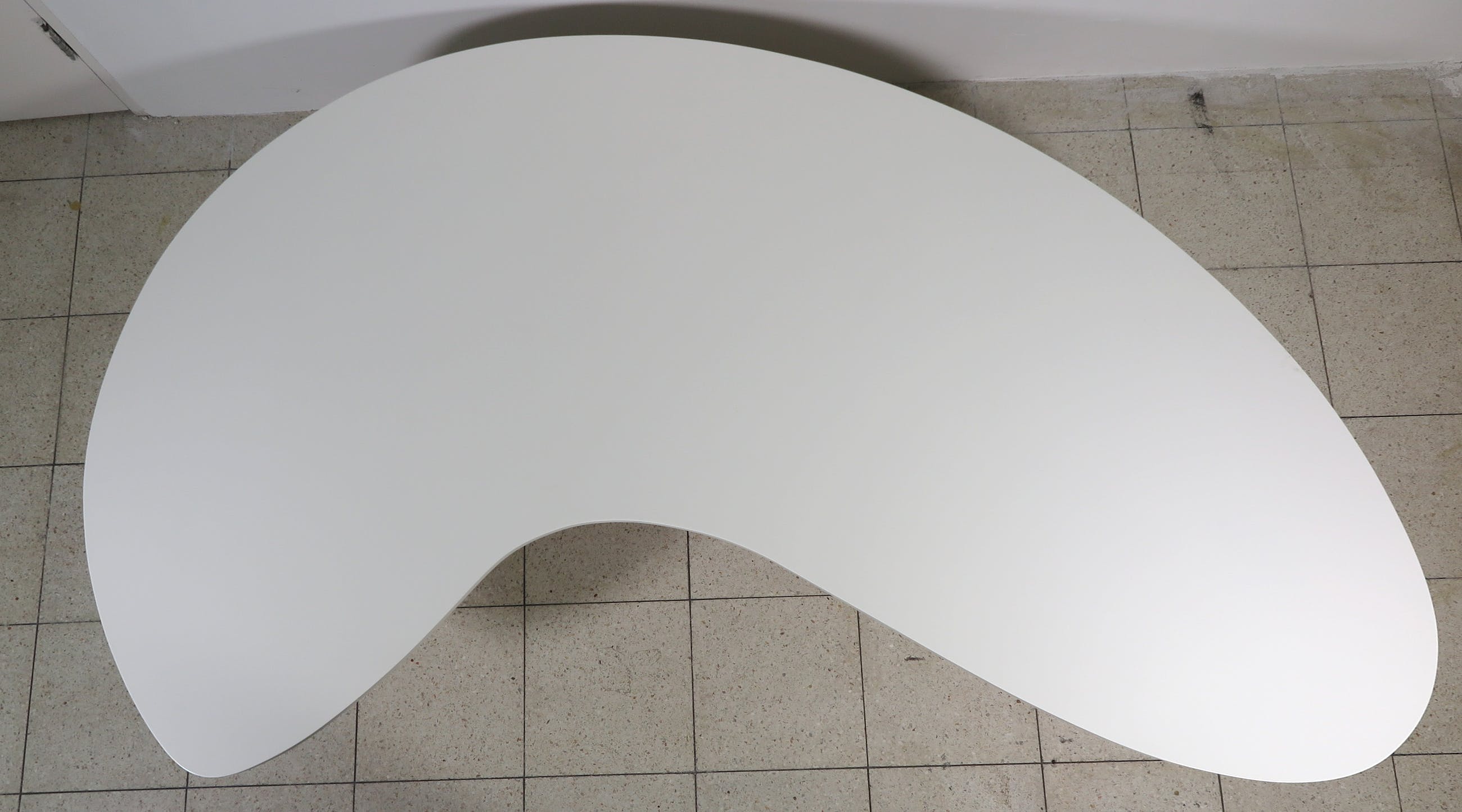 Een bijzonder uitstapje van de beroemde CoBrA-kunstenaar Eugène Brands: een Cobra-design tafel uit 1950. Het niervormige blad is wit gelakt en wordt geplaatst op een driehoekige wit onderstel. Het blad is 2 cm dik.