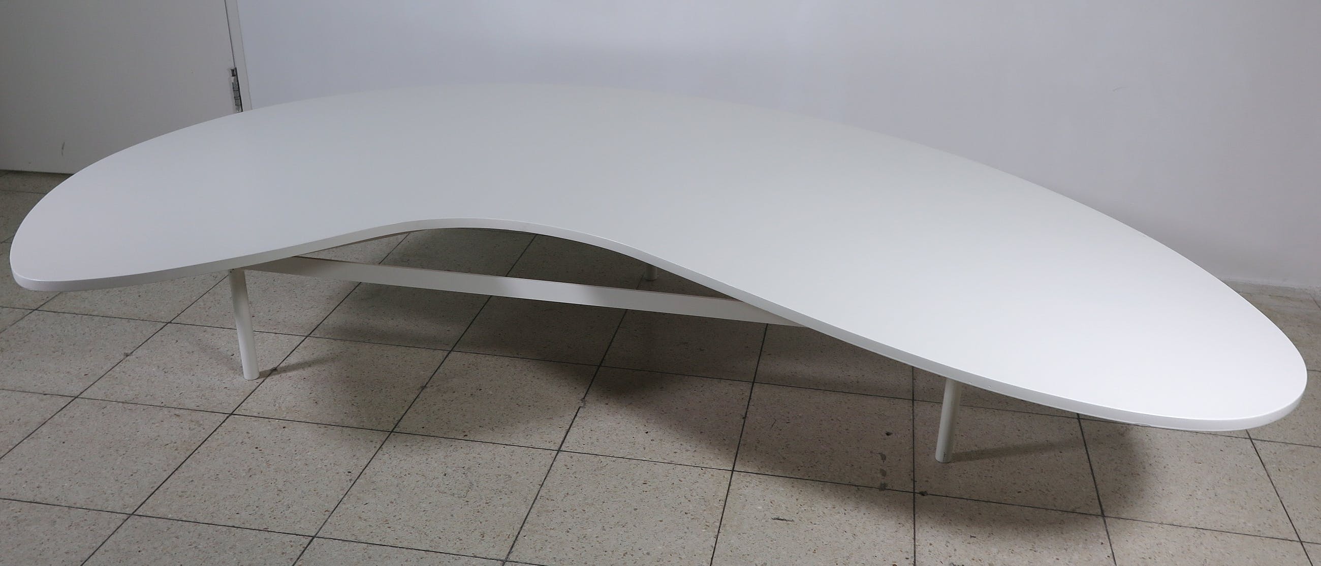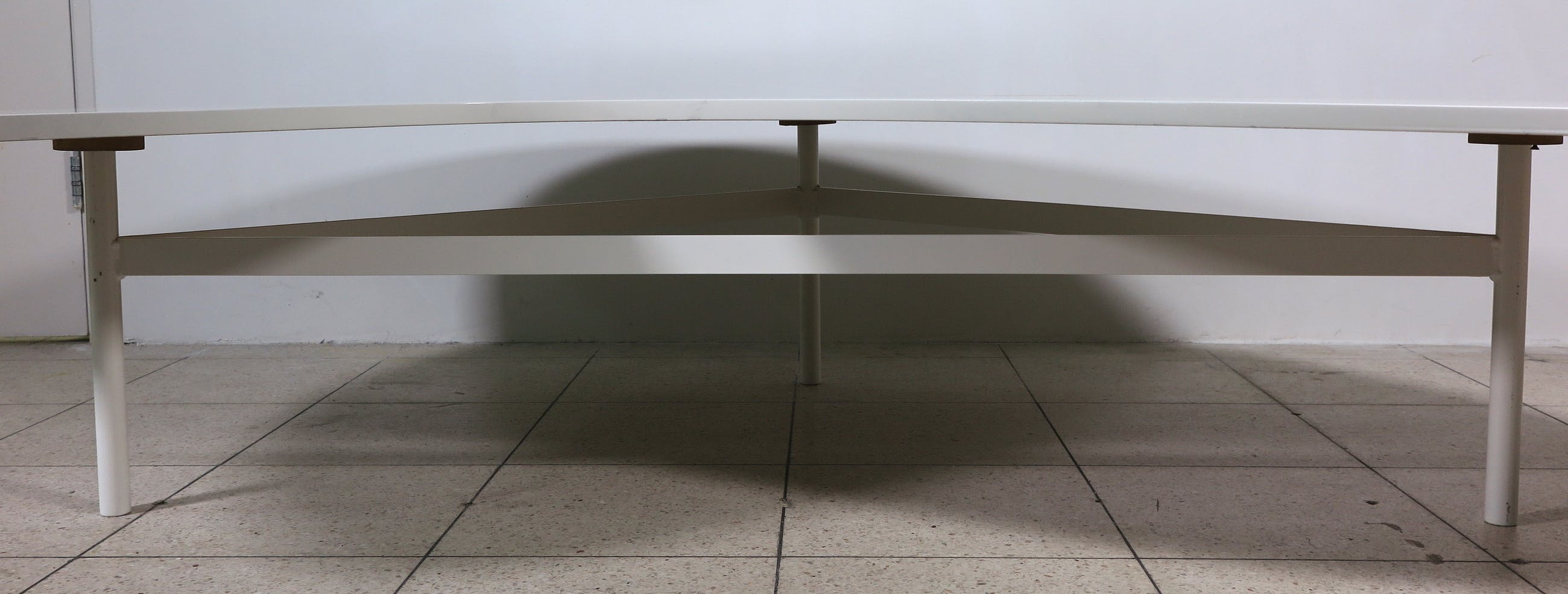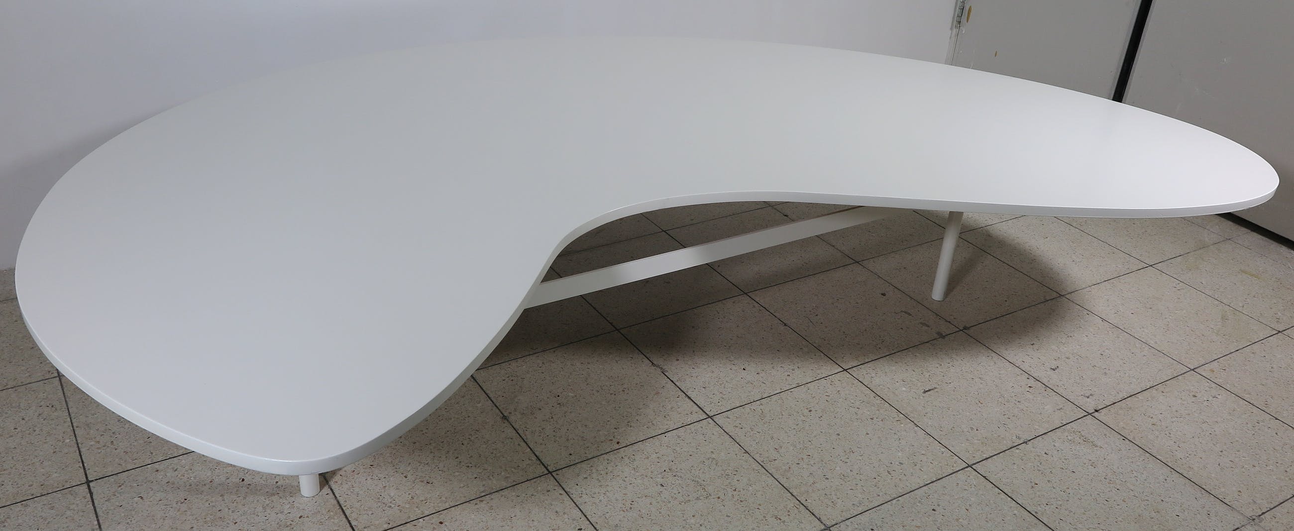 Een bijzonder uitstapje van de beroemde CoBrA-kunstenaar Eugène Brands: een Cobra-design tafel uit 1950. Het niervormige blad is wit gelakt en wordt geplaatst op een driehoekige wit onderstel. Het blad is 2 cm dik.