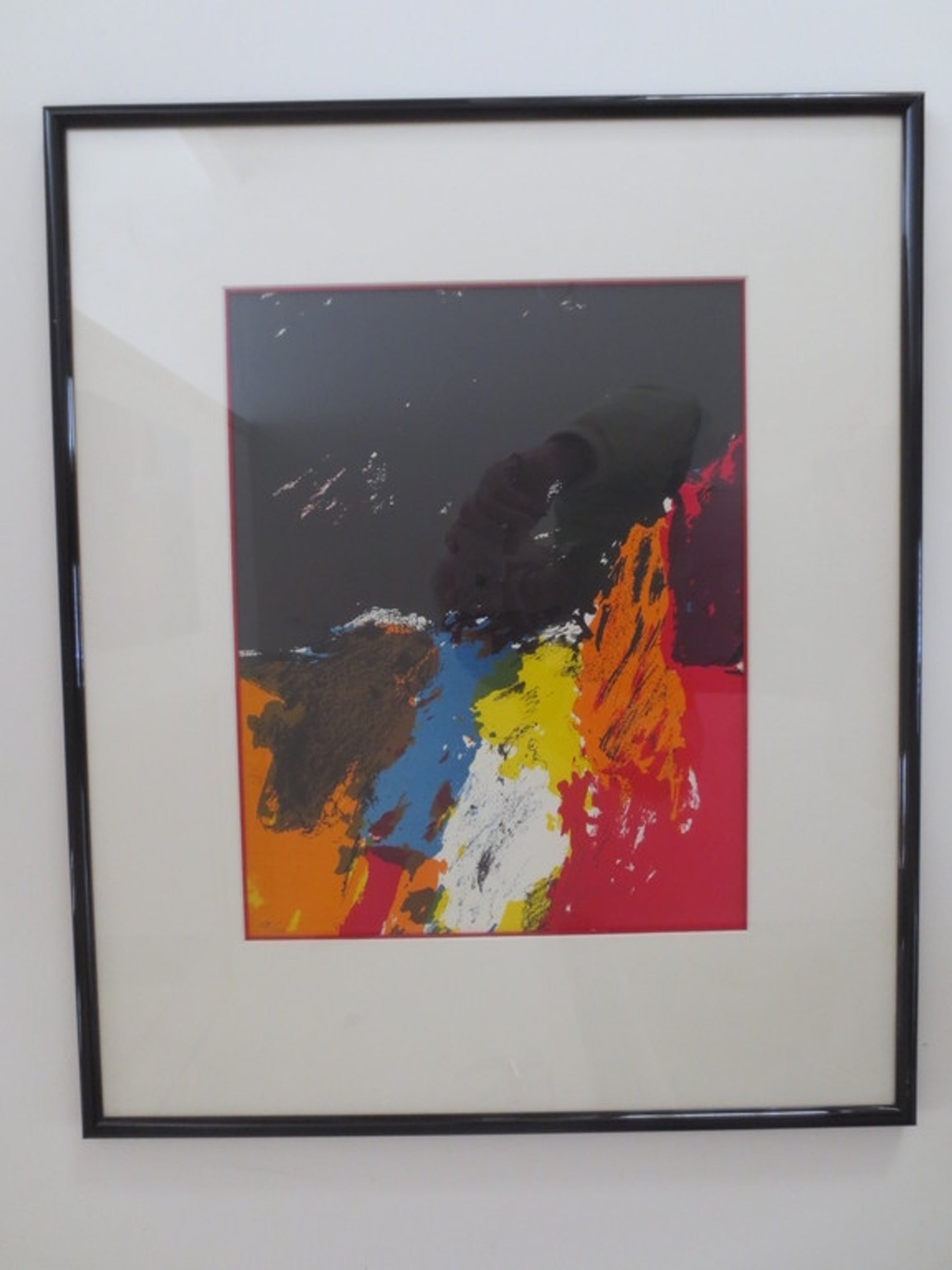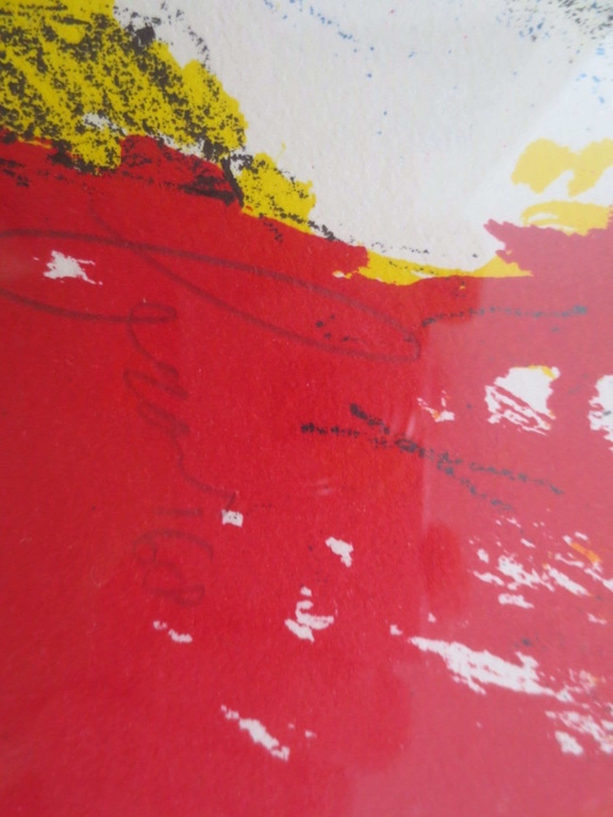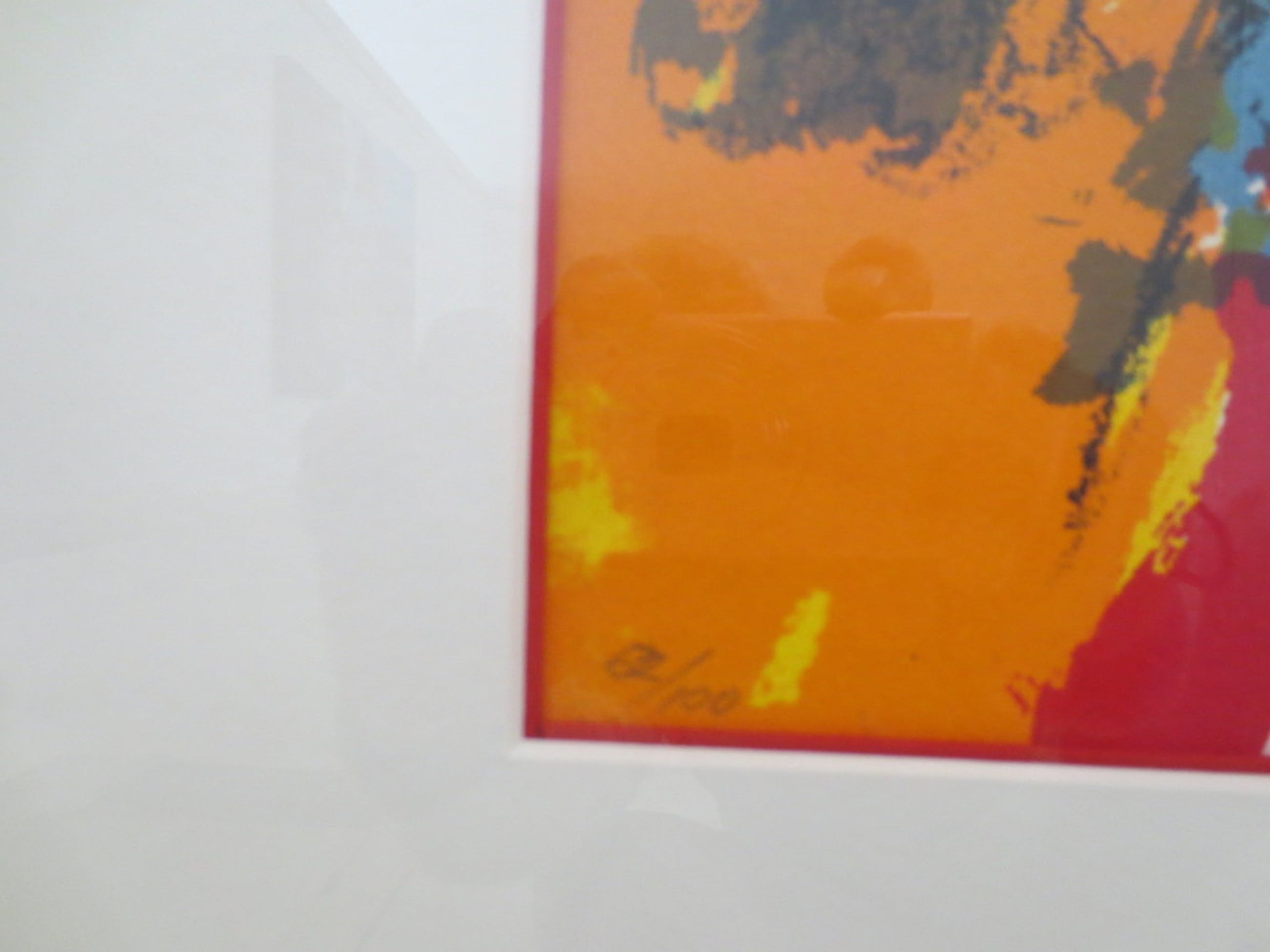 schitterende kleuren zeefdruk - beelformaat 29 x 37 cm - formaat 49 x 60 cm voorzien van dunne zwarte glanzende lijst 1.5 cm met rode bies en passepartout- oplage 52/100 - 1968 - prima staat