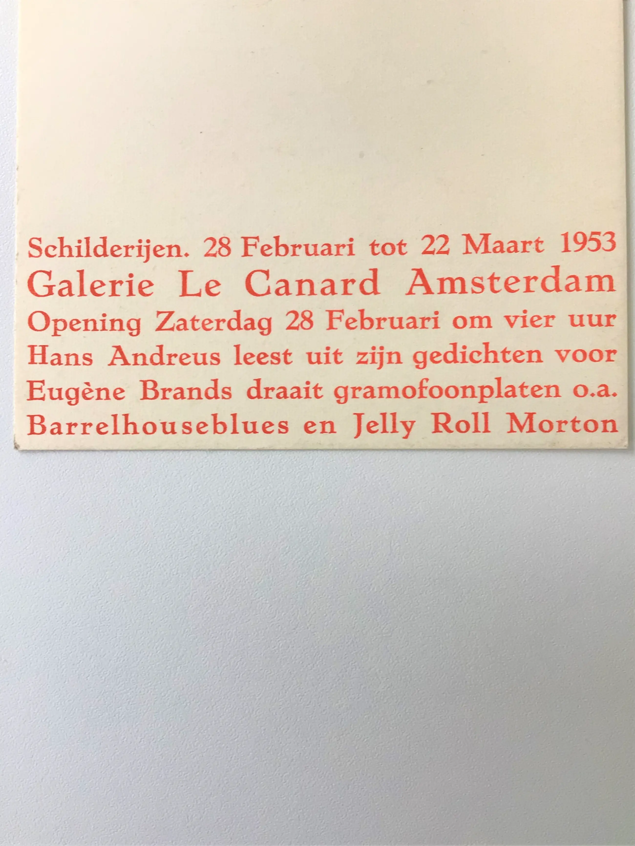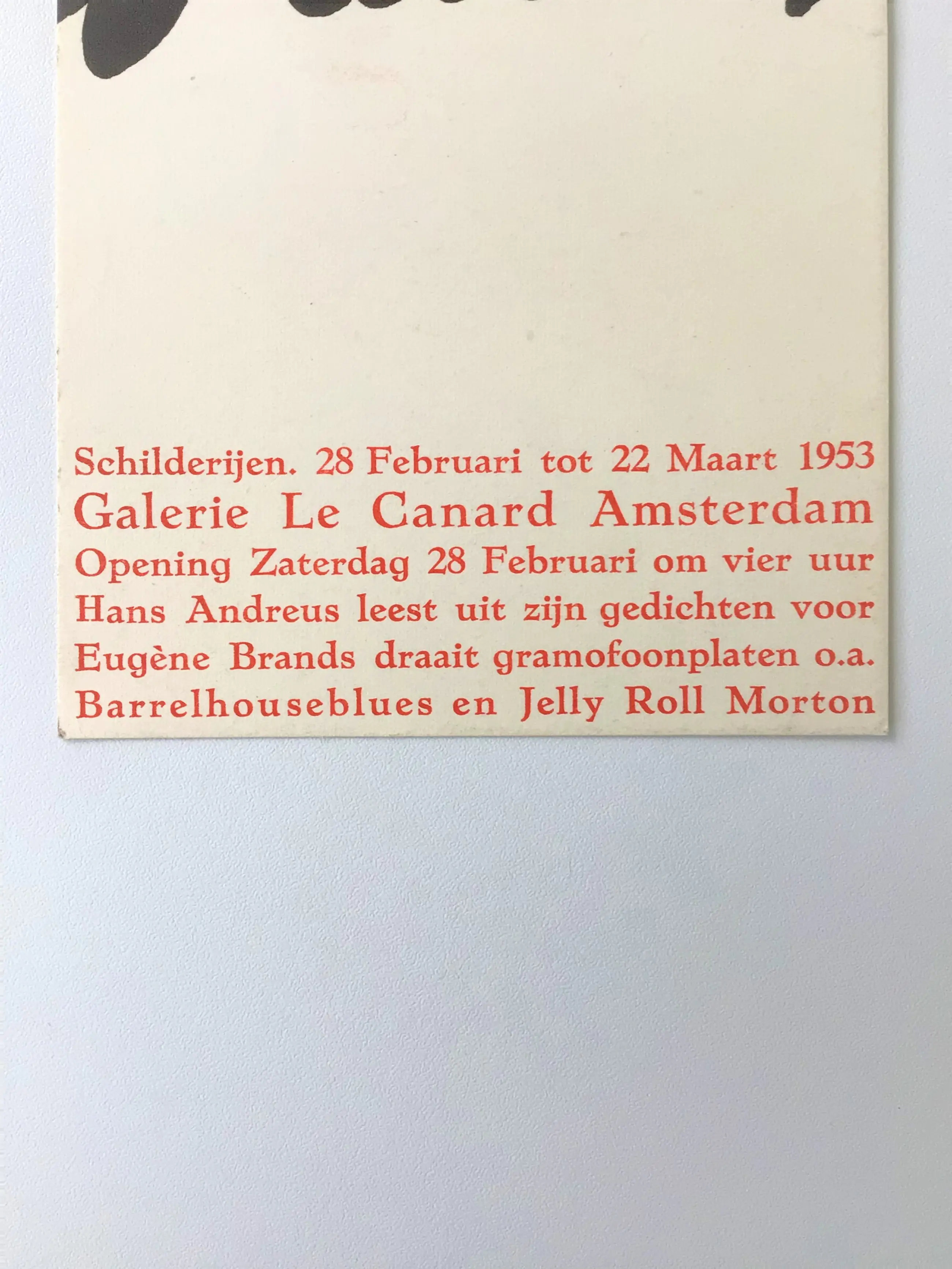 Aangeboden een zeer zeldzame originele uitnodiging van een (eerste) tentoonstelling in 1953 te Amsterdam. Lees de bijzondere tekst met de toen revolutionaire openingsactiviteiten door dichter Hans Andreus en de schilder zelf: