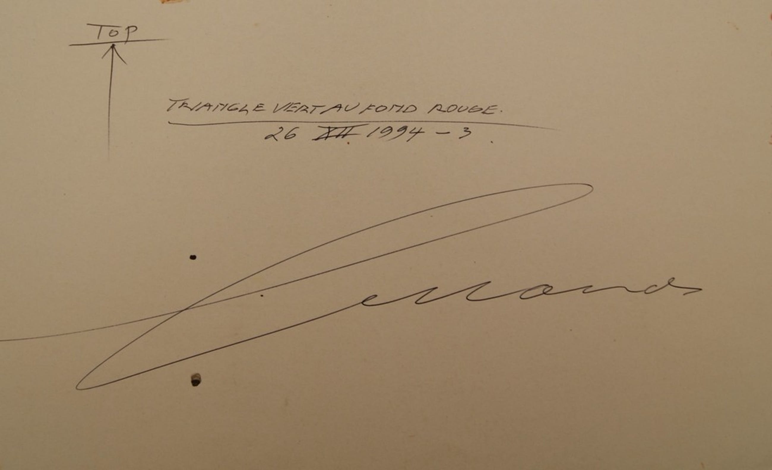 Eugène Brands, gouache 'Triangle vert au fond rouge' uit 1994.