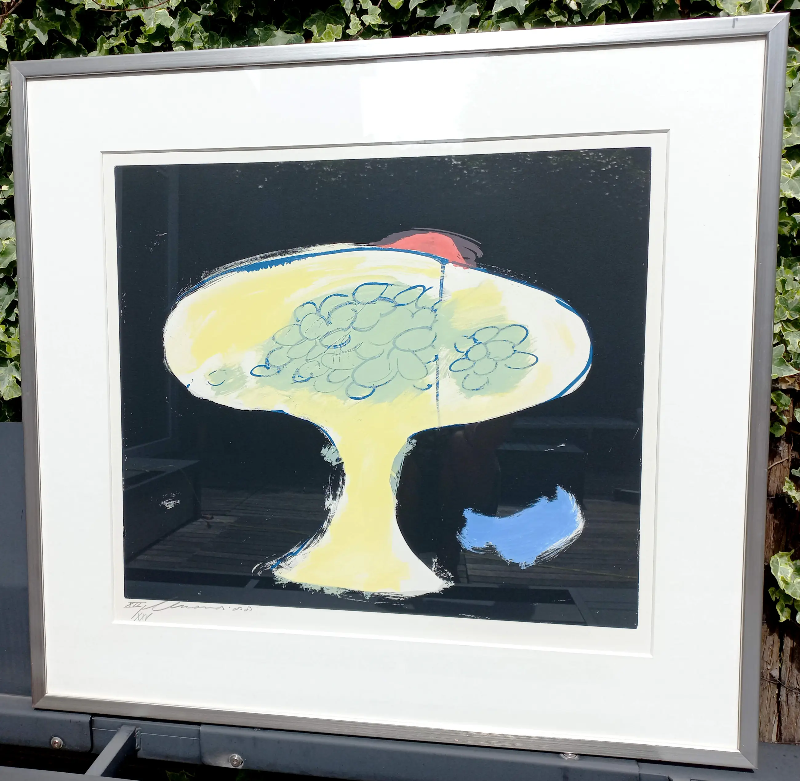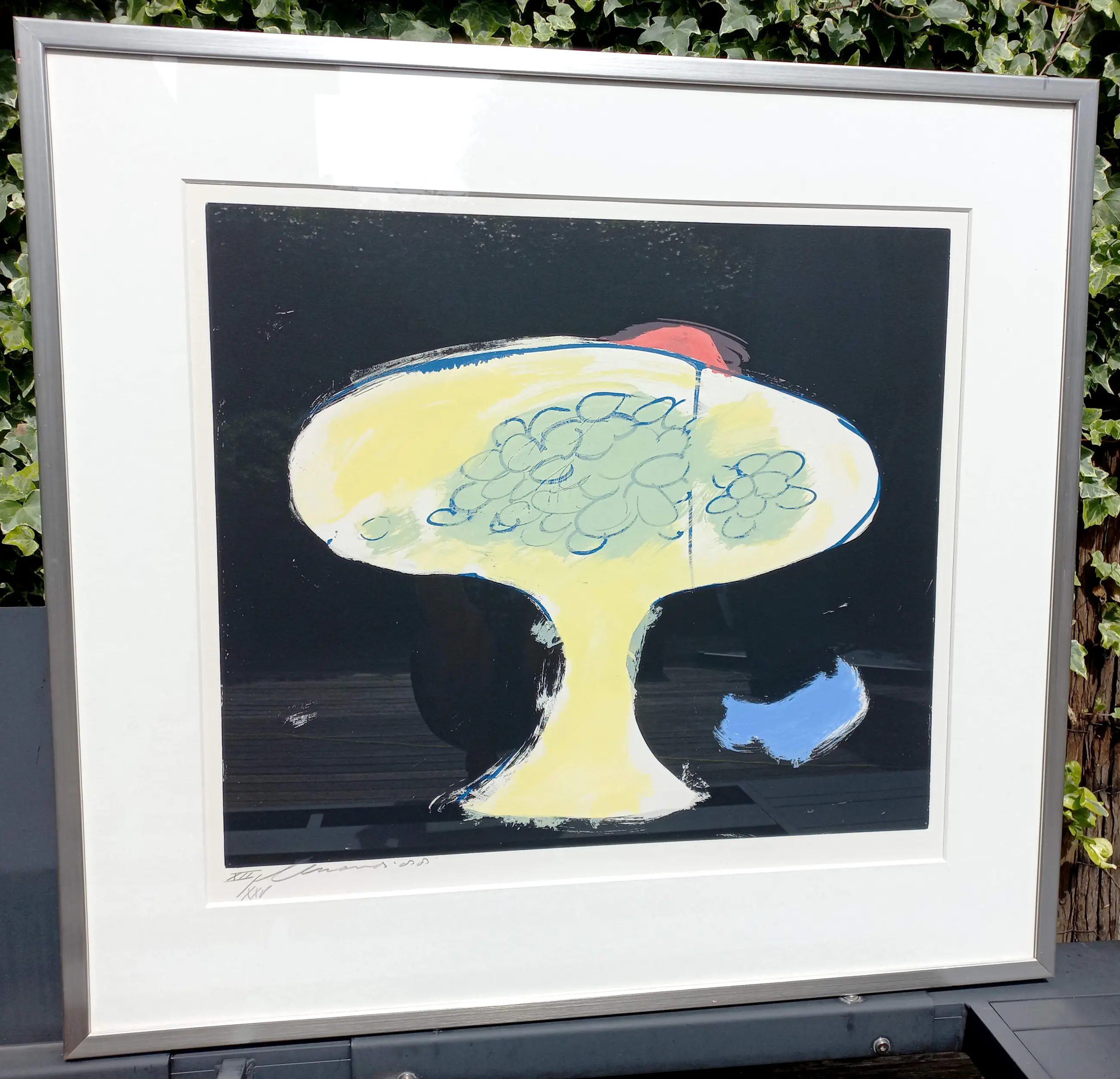 Karakteristieke, bekende compositie van Eugene Brands. Litho op geschept papier, met potlood gesigneerd, gedateerd (’88) en genummerd (XII/XXV = 12/25). Professioneel ingelijst, achter glas en met smetteloos, zuurvrij passe-partout. Alles in zeer goede conditie.