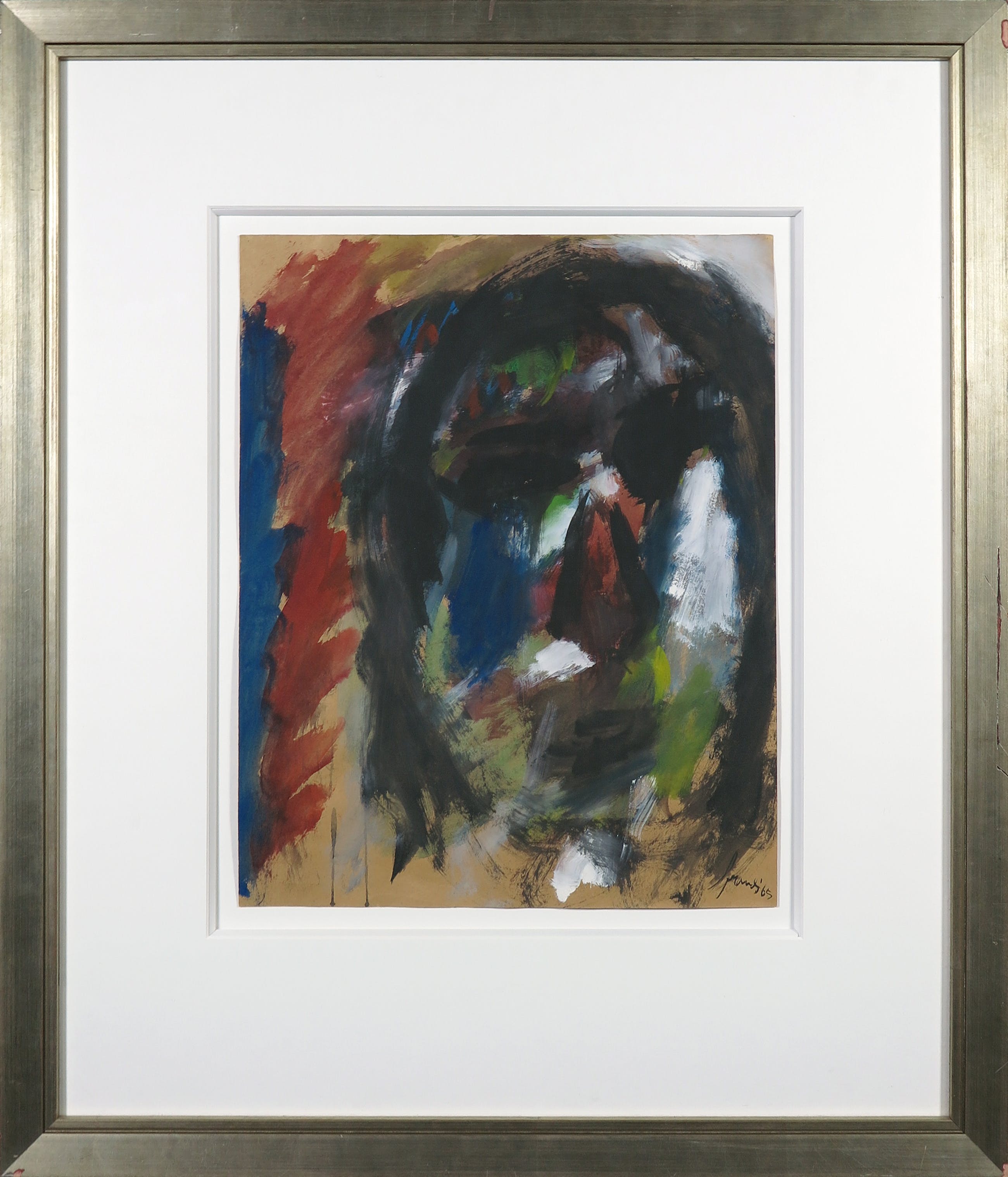 Geabstraheerd portret van een vrouw in gouache. Rechtsonder gesigneerd en gedateerd.