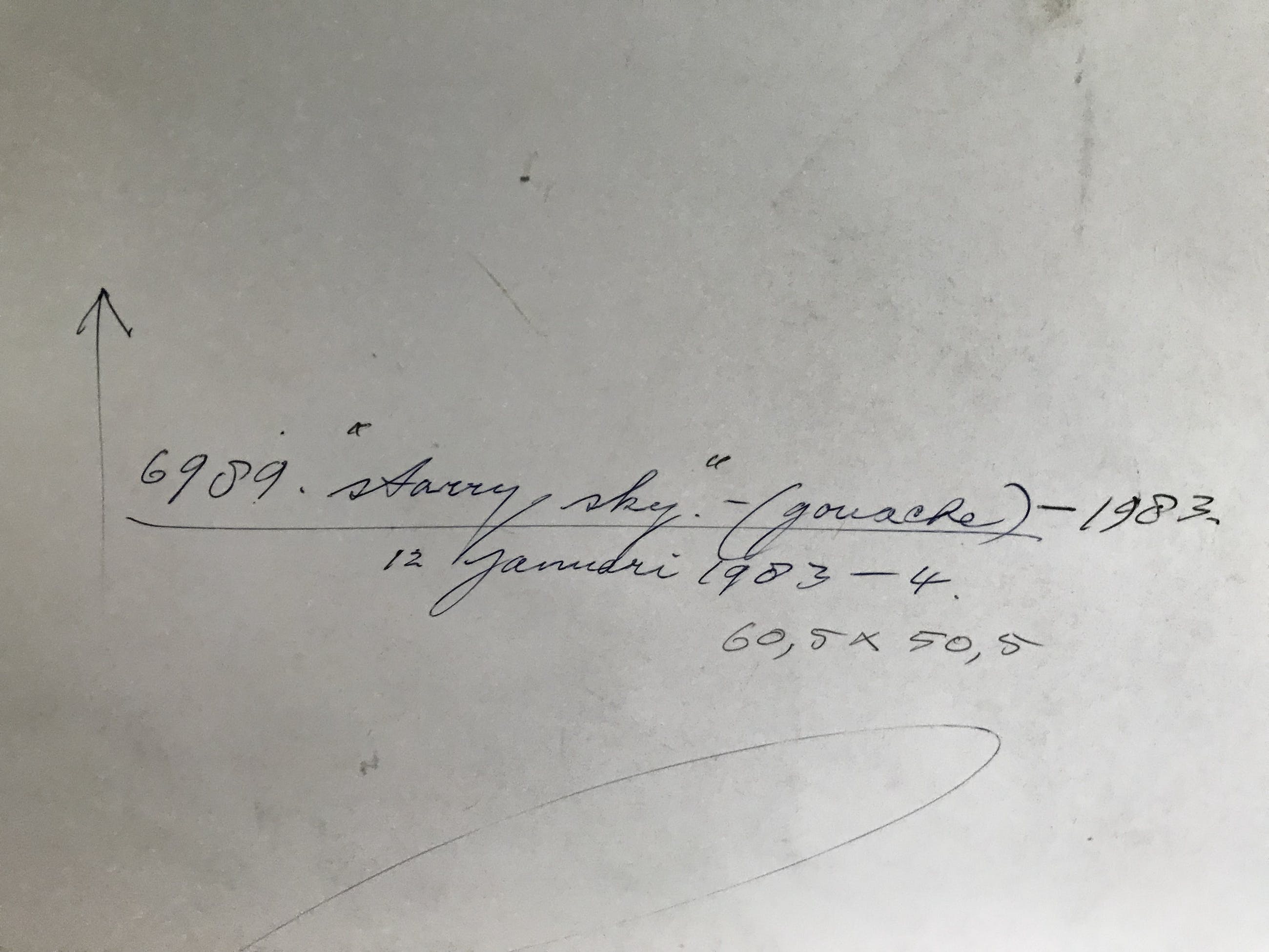 I opened the backside to be sure if this artwork is signed and dated on the backside. After i looked i took some new pictures of the backside. Writing on the backside: 6989 'Starry Sky' (gouache)1983 12 januari 1983-4 60.5 x50.5 And the signature.