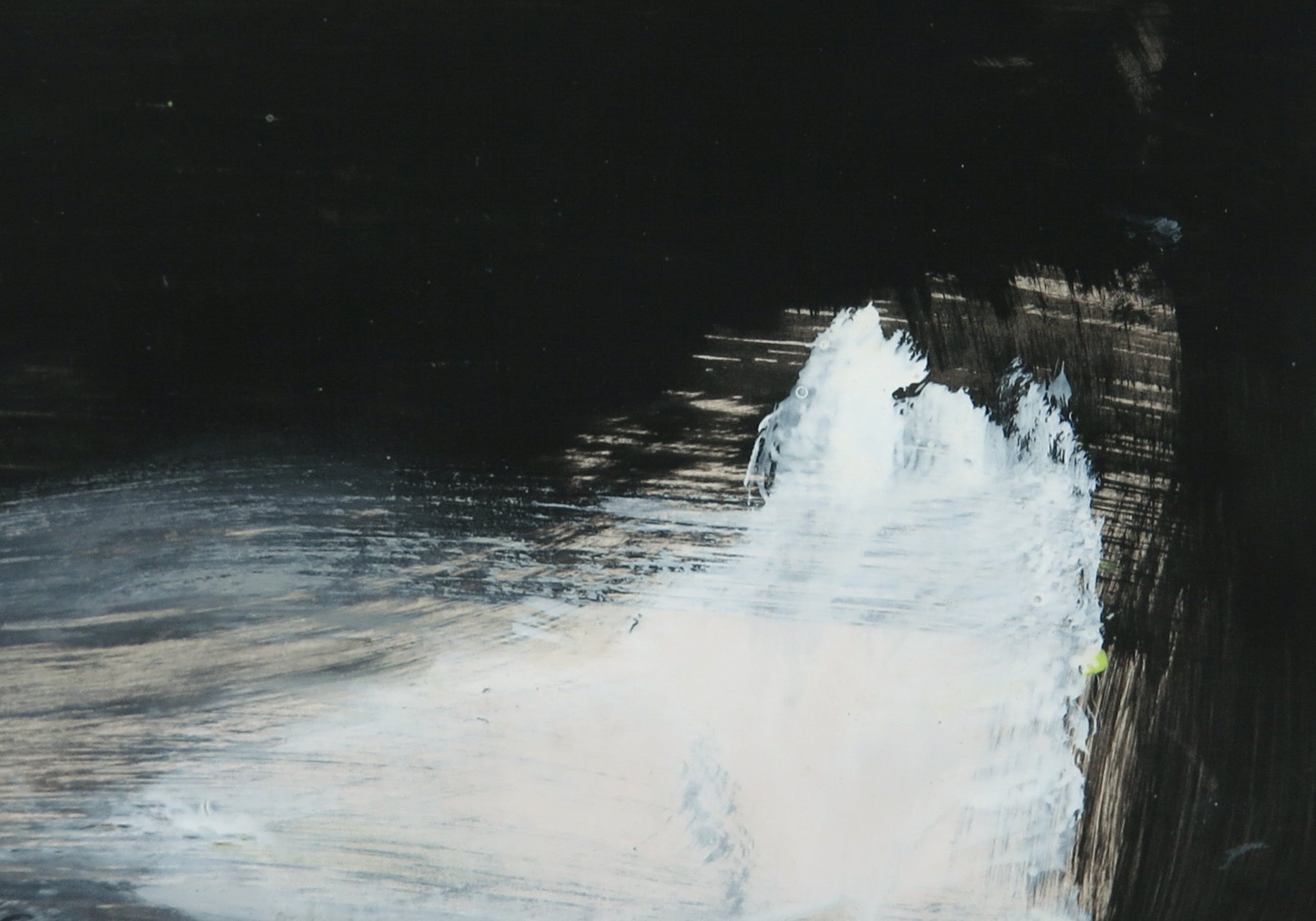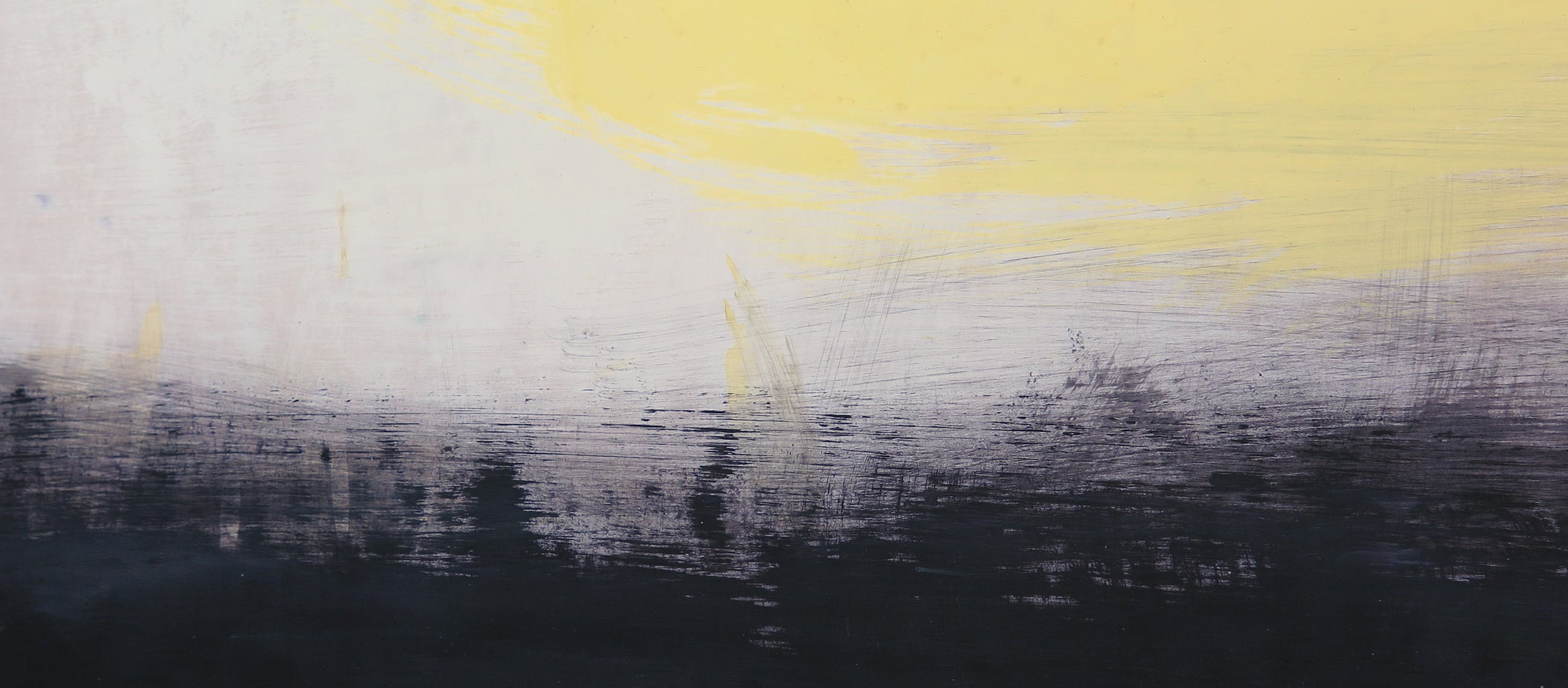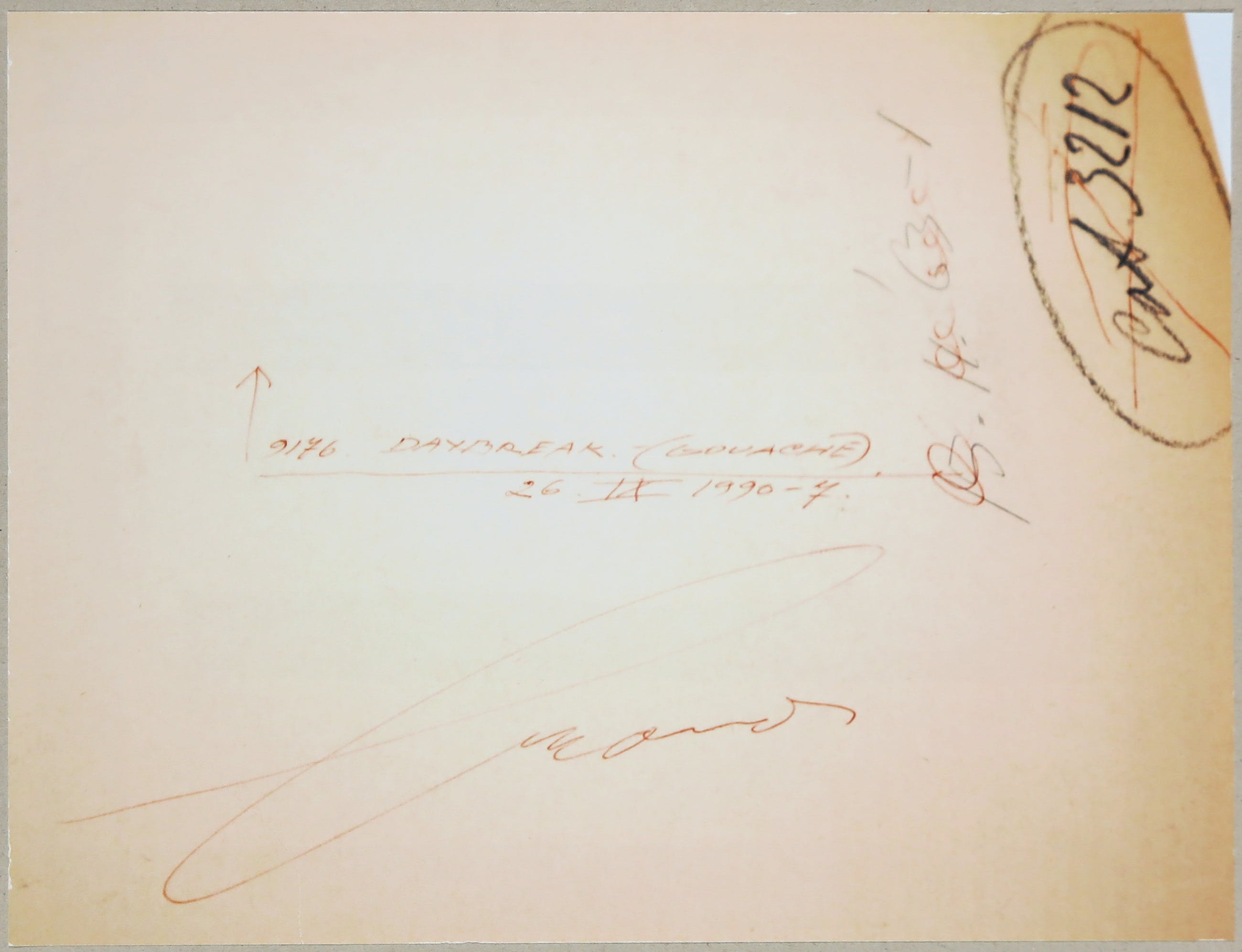 Grote abstracte gouache in zwart, wit en geel, getiteld Day Break in de kenmerkende abstracte stijl van Eugene Brands. Het werk is verso gesigneerd, betiteld en gedateerd.