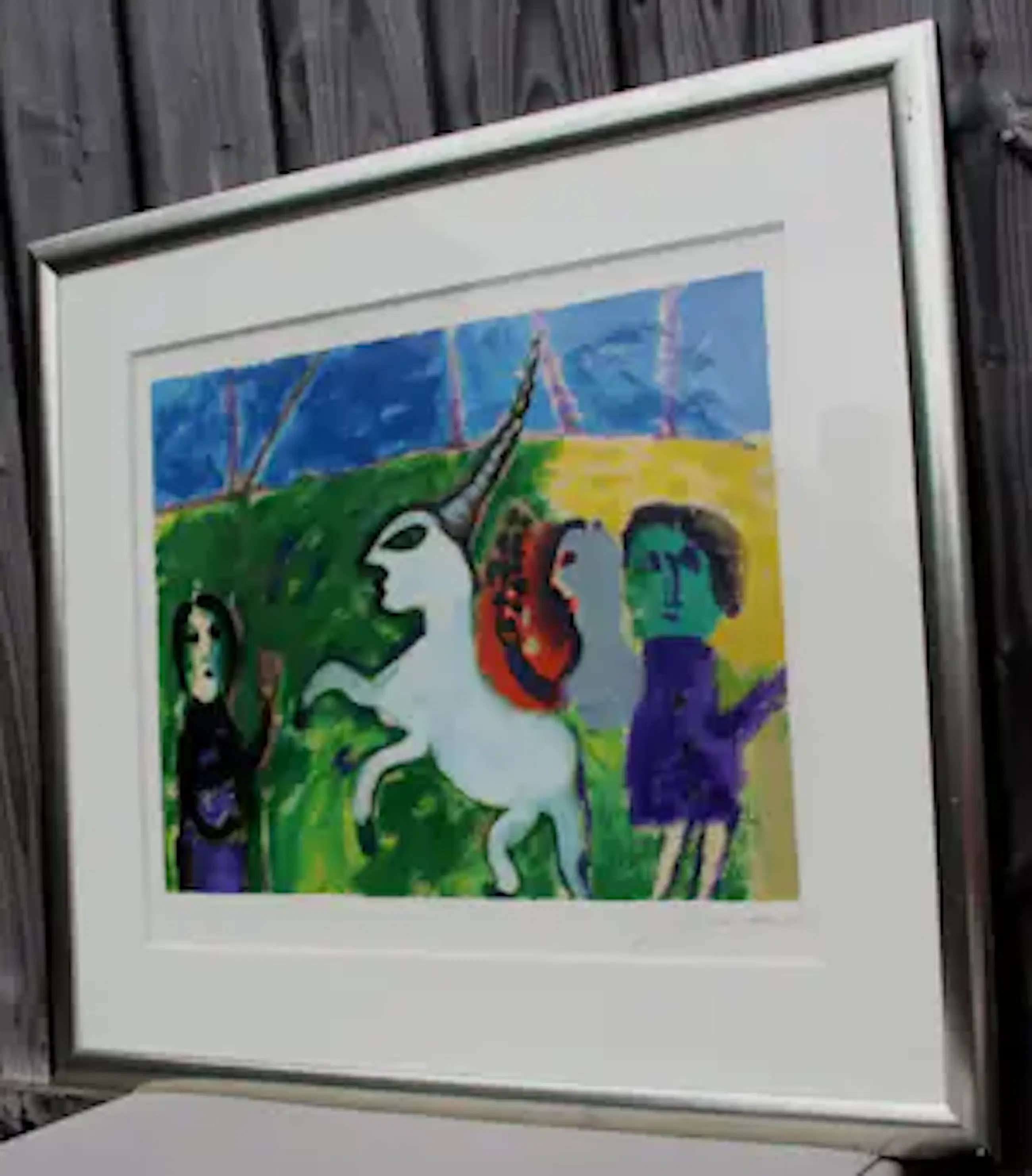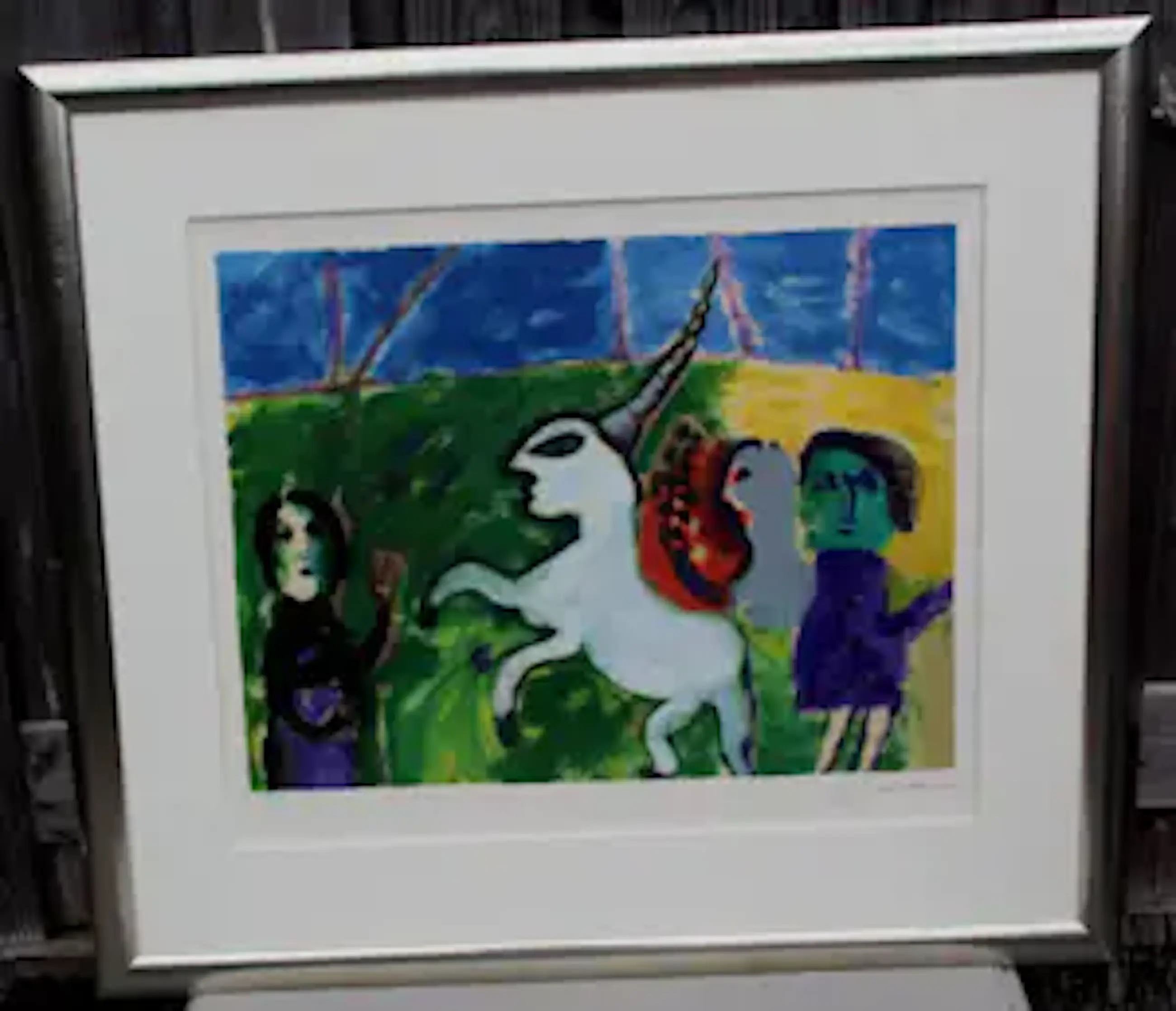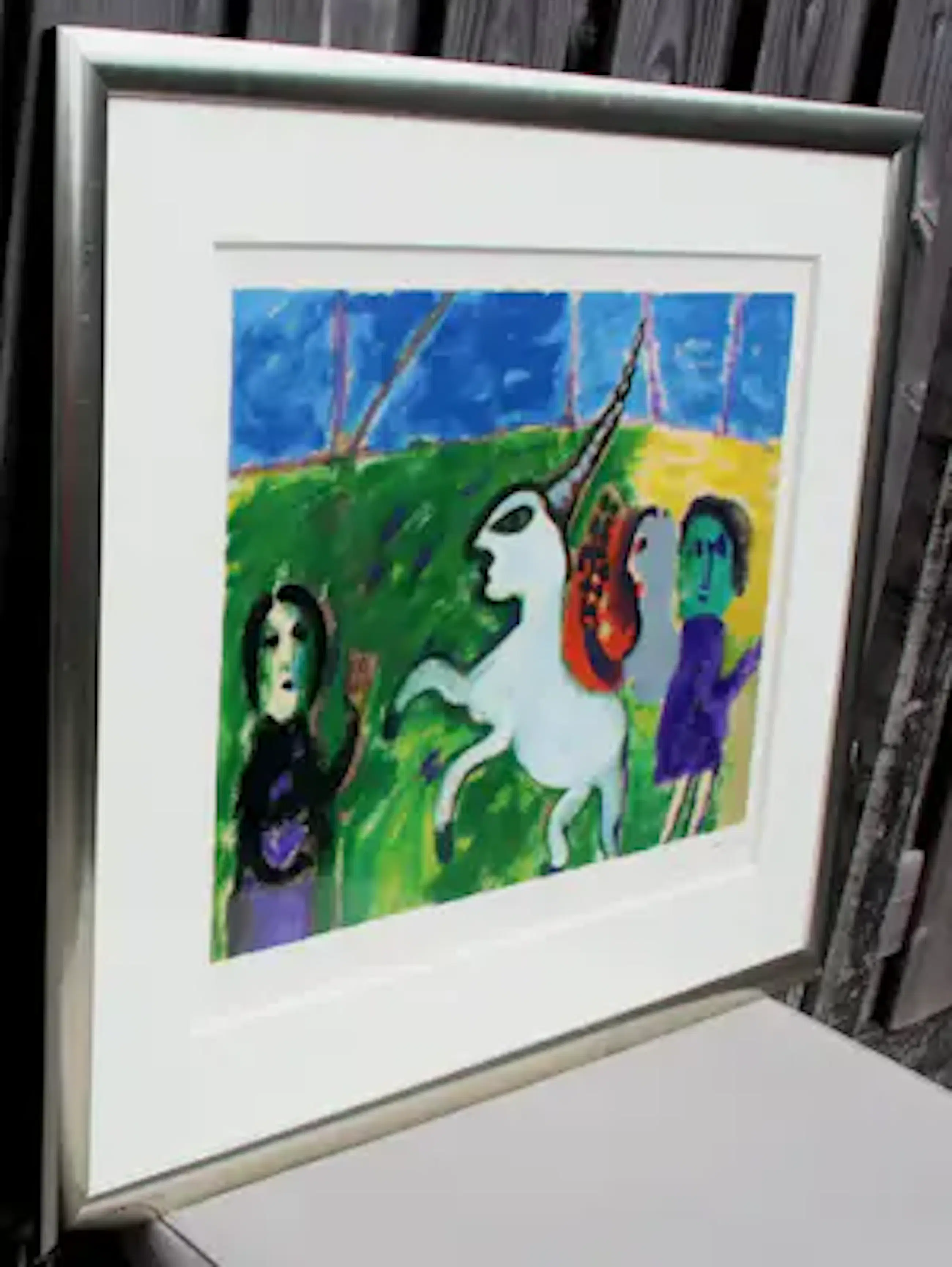 Ingelijste zeefdruk van Eugene Brands. Titel: Eenhoorn. Oplage: 93/150. Afmetingen inclusief lijst: H86.5 x B96cm. Afmetingen voorstelling: H50 x B63cm. Het werk is, rechts onderaan, gesigneerd door de kunstenaar. De authenticiteit van het aangeboden werk wordt volledig gegarandeerd. Een certificaat van echtheid kan, op aanvraag, worden gemaild.
