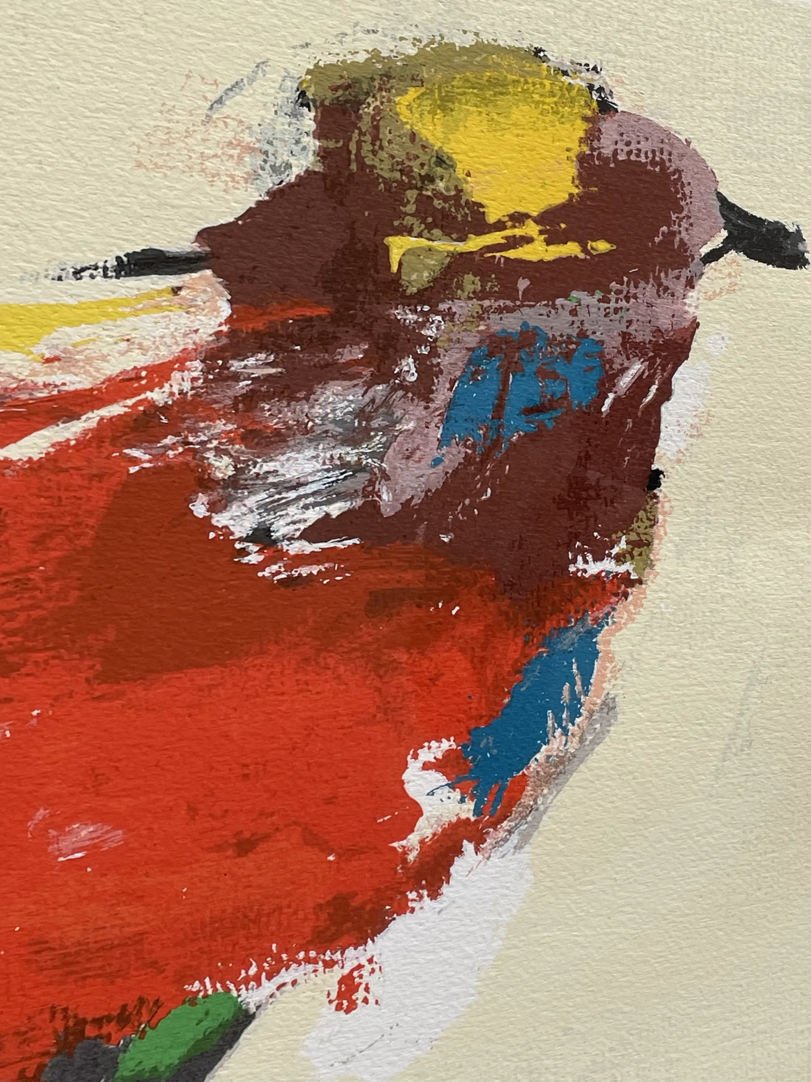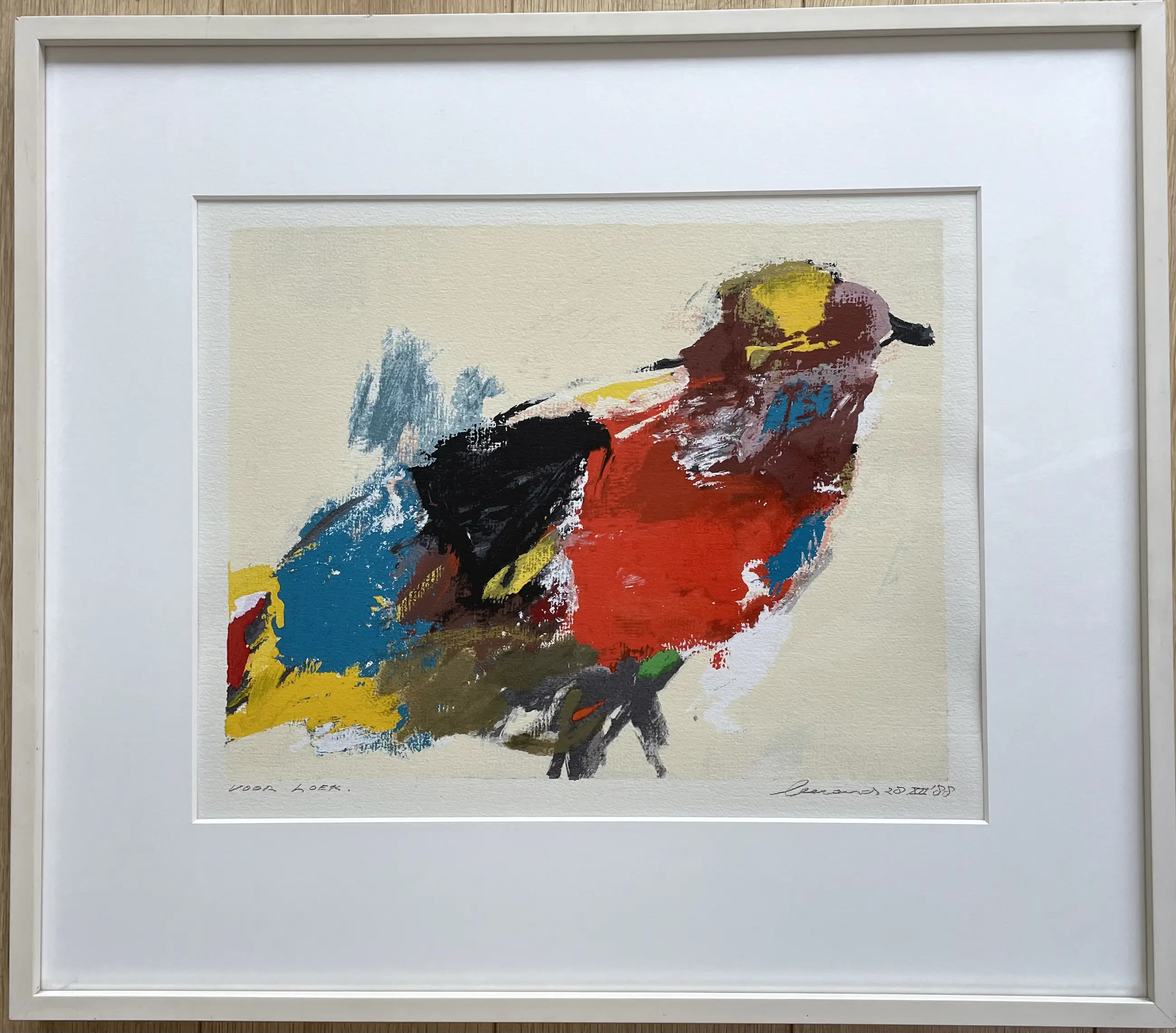 De kunstenaar Eugène Brands behoorde tot de CoBrA-groep. Zijn prachtige zeefdruk valt op door de mooie, heldere kleuren.