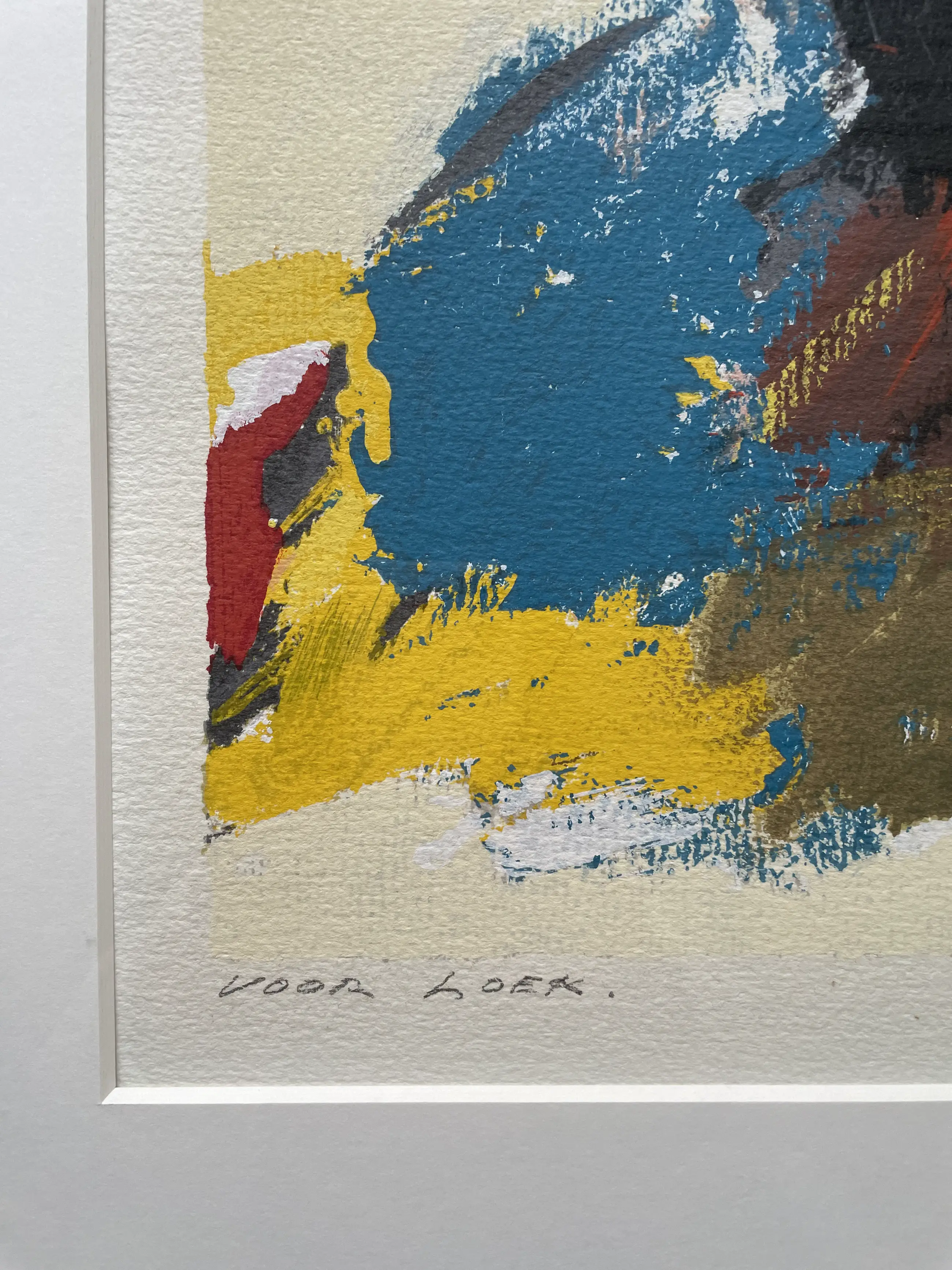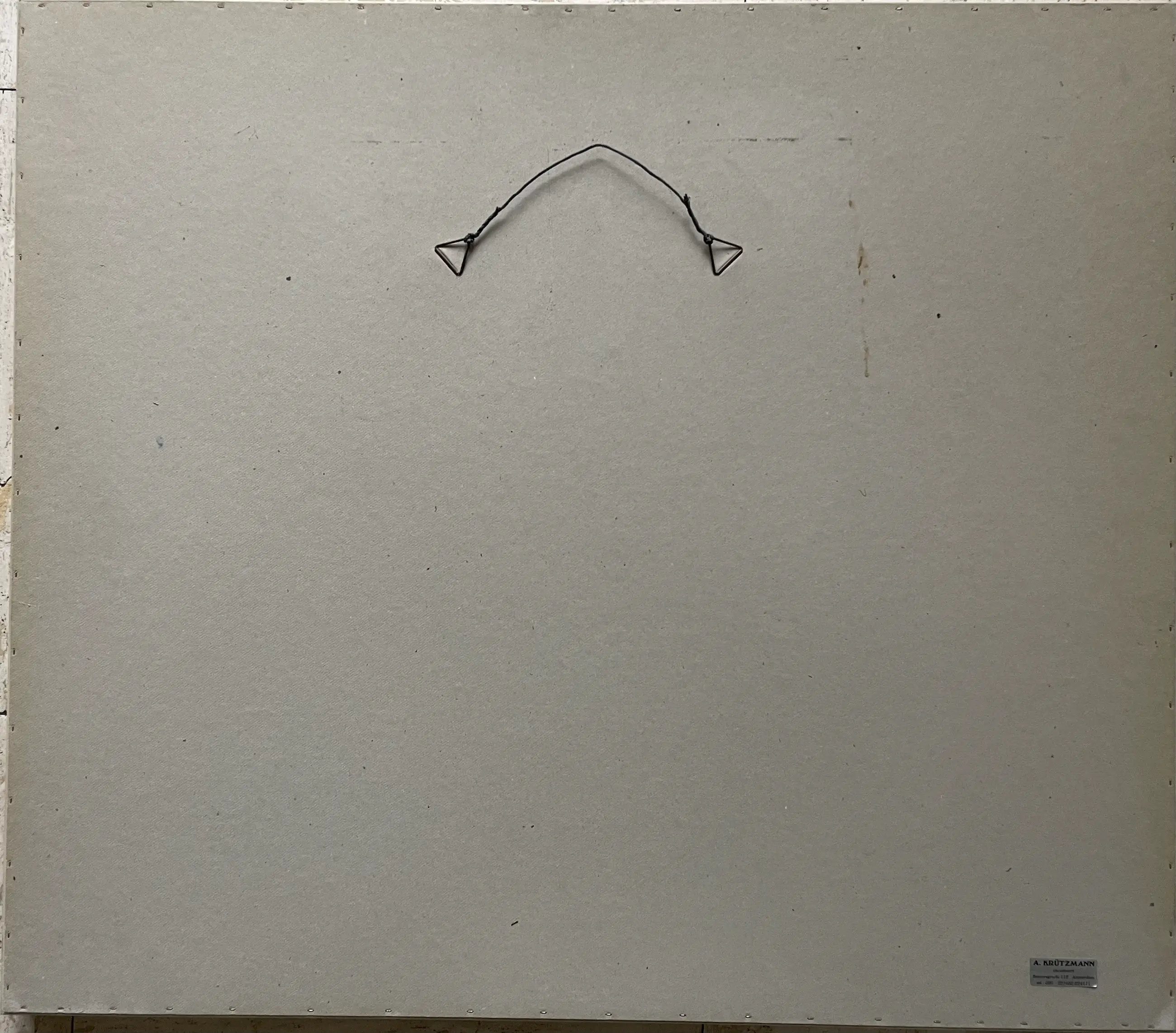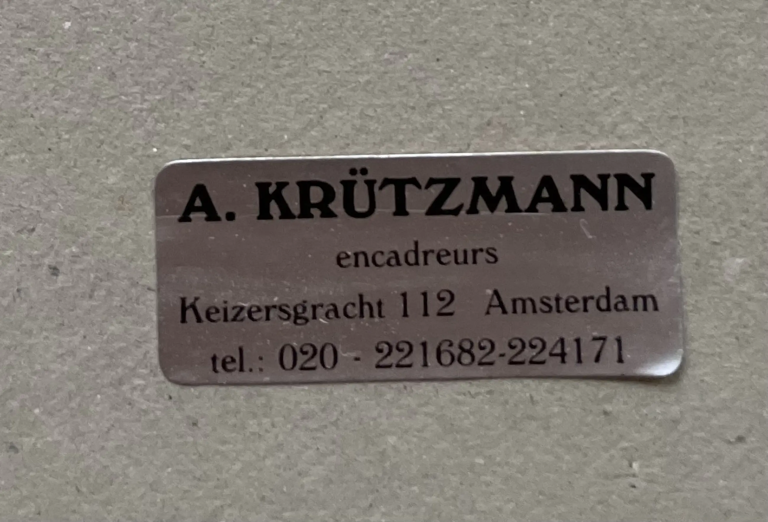 Rechtsonder staat de signatuur, daarnaast is geschreven 28 XII '88. Links onder staat de opdracht "voor Loek". De strakke lijst is destijds verzorgd door A. Krützmann encadreurs te Amsterdam.