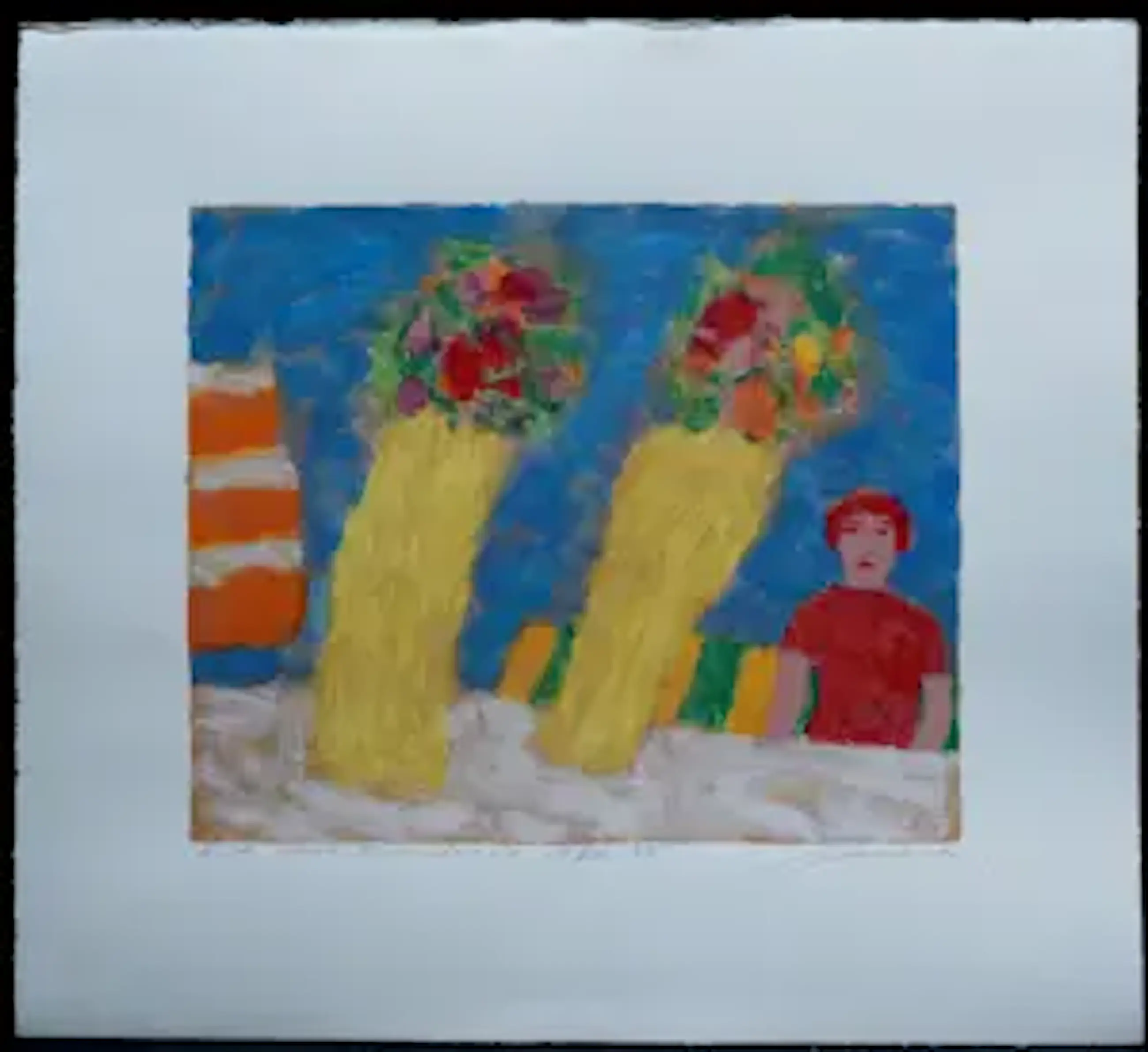 Litho van Eugene Brands. Voorstelling van een dame met bloemenvazen. Jaar: 1995. Afmetingen blad: H45 x b50cm. Afmetingen voorstelling: H28.5x b34cm. Het werk is, rechts onderaan, gesigneerd door de kunstenaar. De authenticiteit van het aangeboden werk wordt volledig gegarandeerd. Een certificaat van echtheid kan, op aanvraag worden gemaild. Met opdracht: voor Tom Okker.
