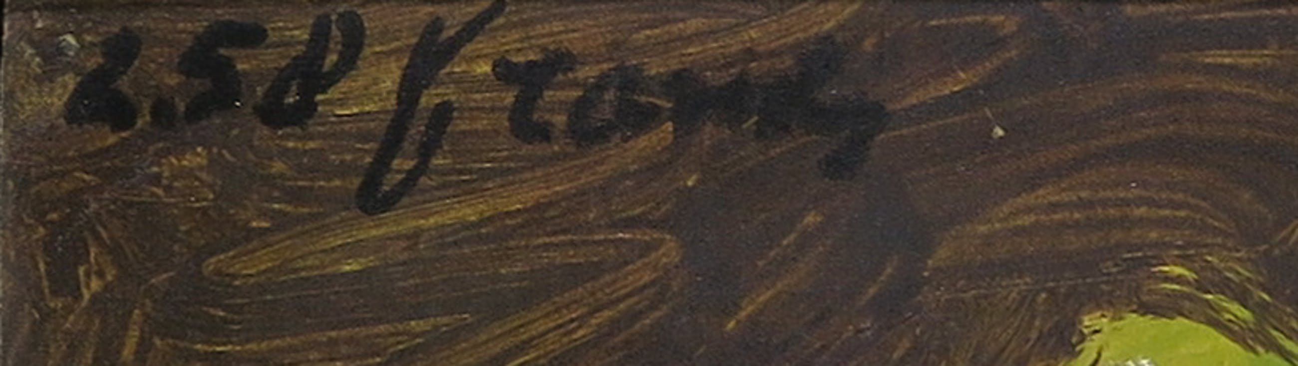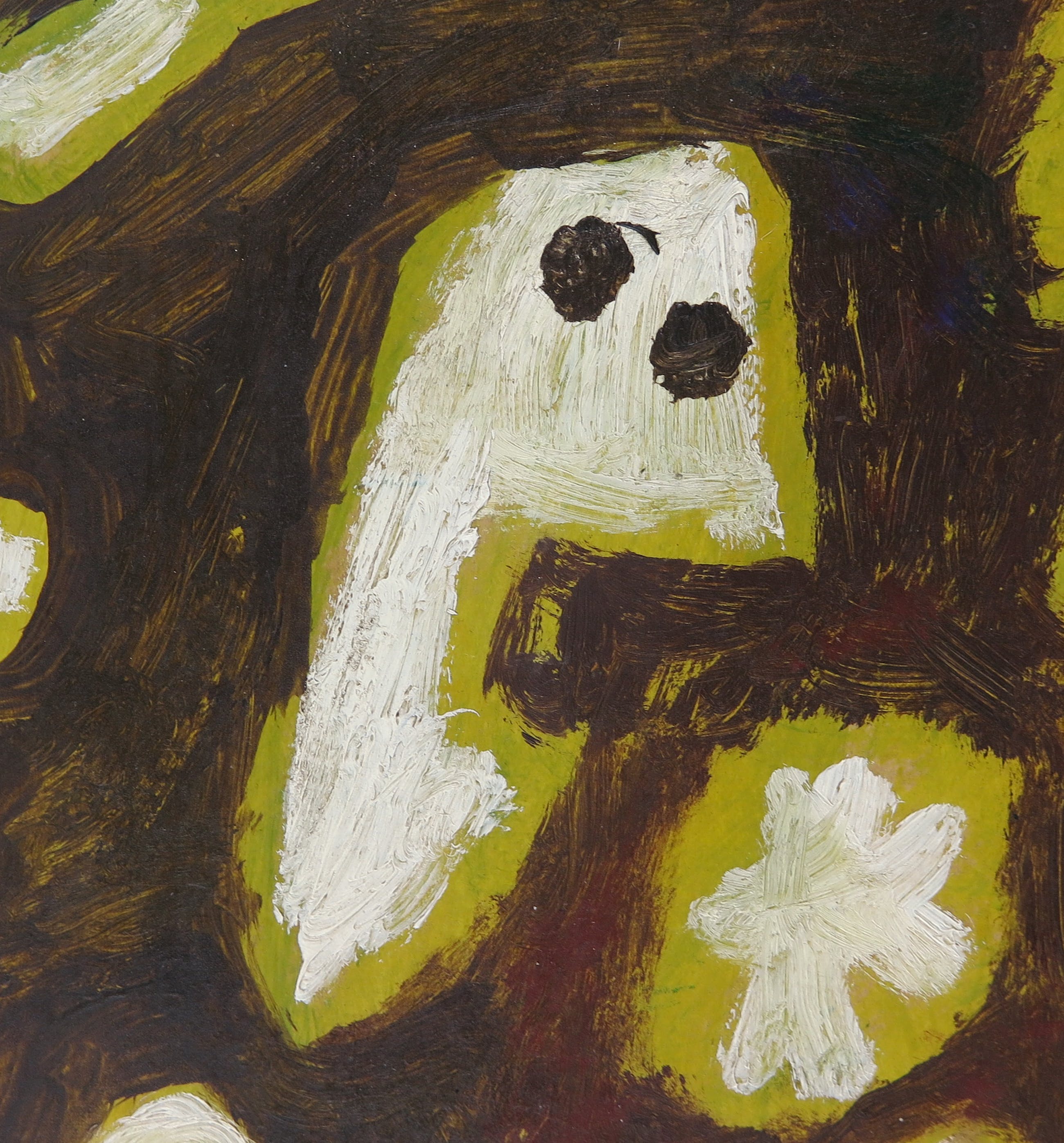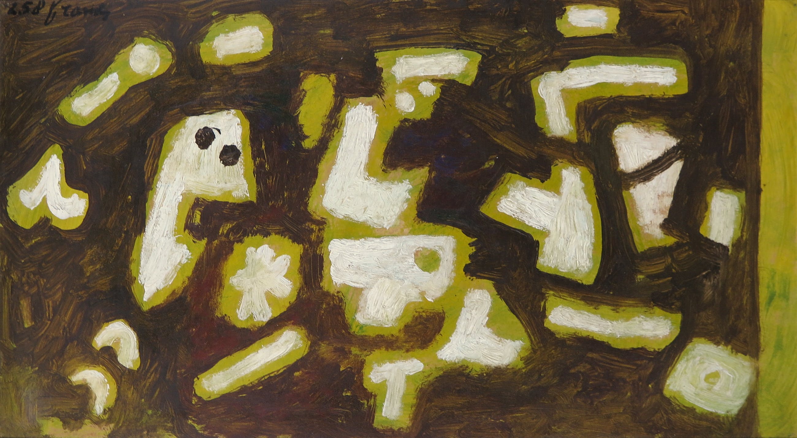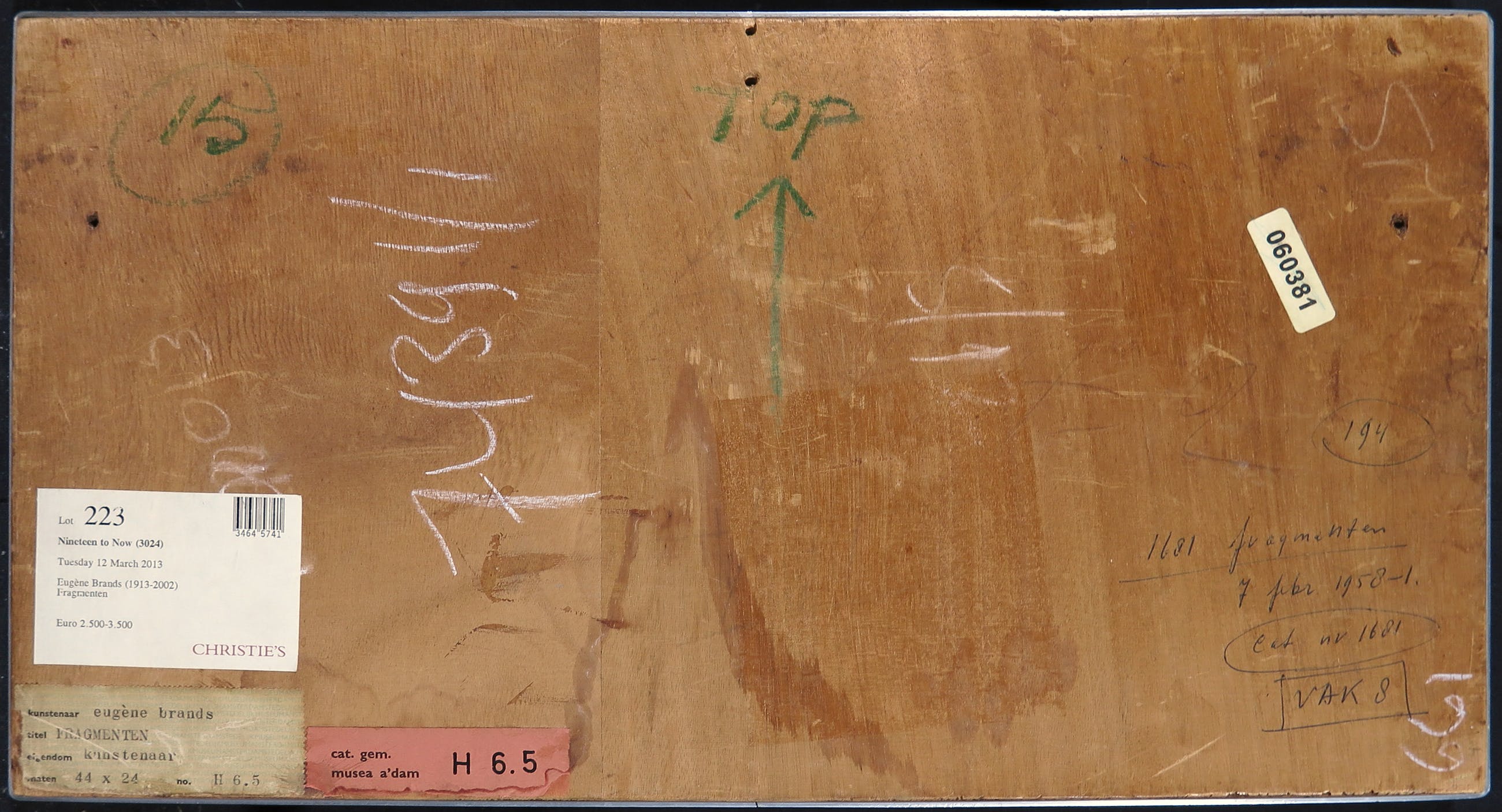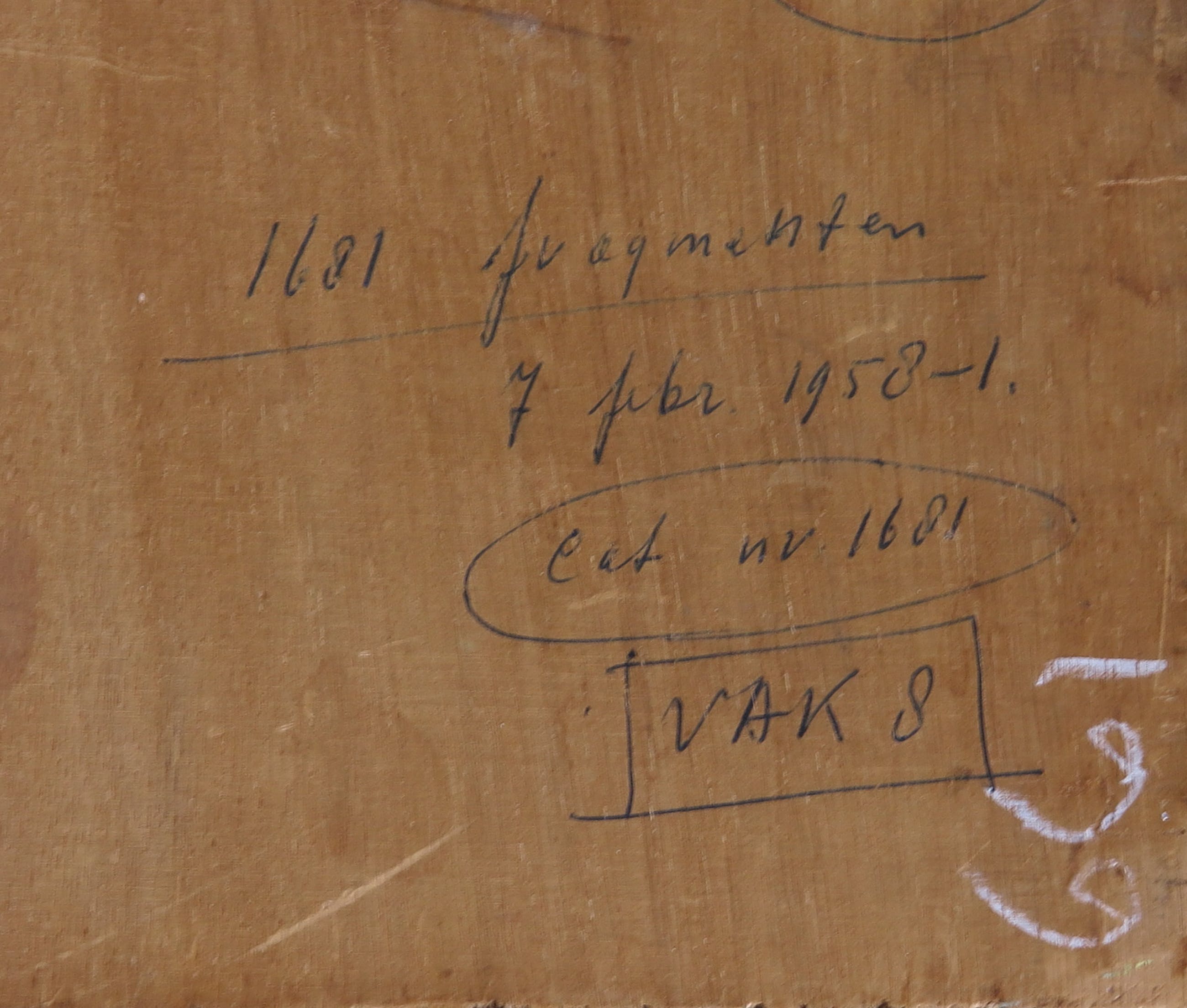 Olieverf op paneel, getiteld 'Fragmenten'. Linksboven gesigneerd en gedateerd.
