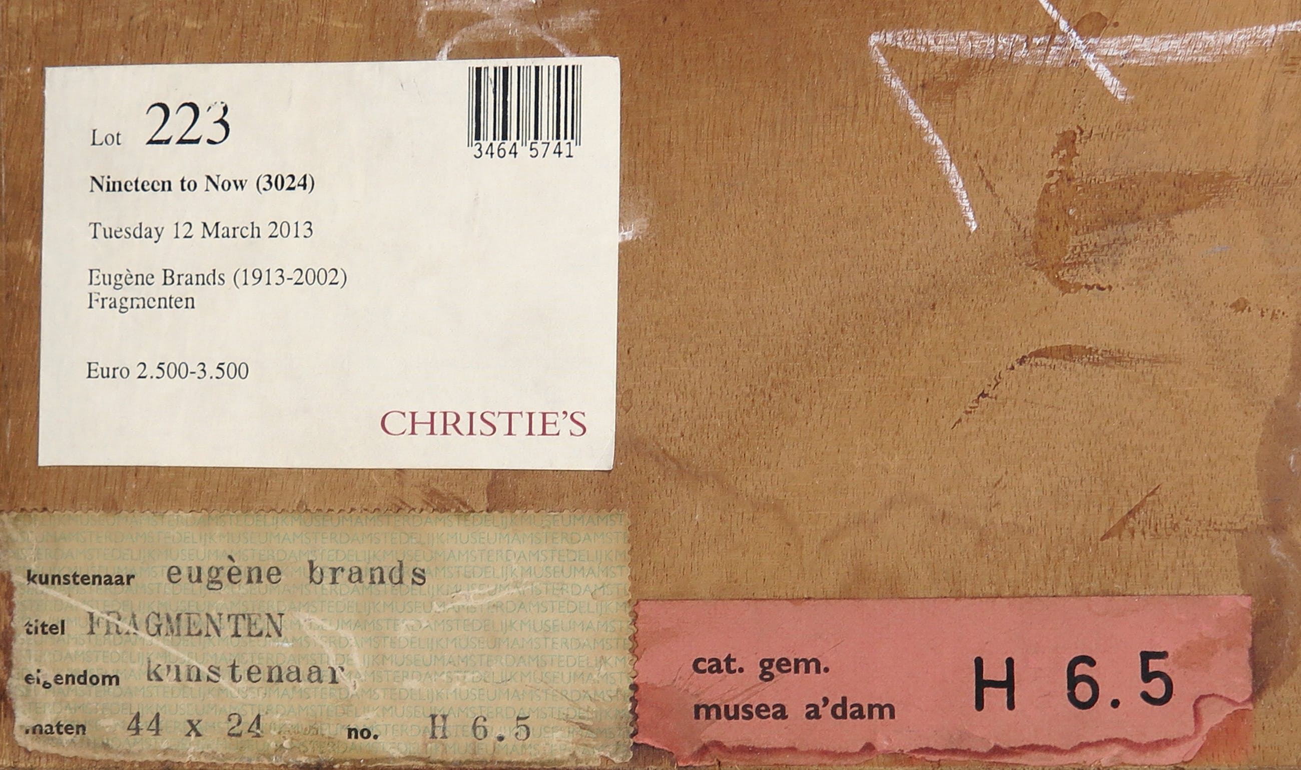 Het item is door Brands uitgeleend aan het Stedelijk Museum Amsterdam voor een tentoonstelling. Tevens is het item onder nummer 1681 terug te vinden in de eigen administratie van Brands.