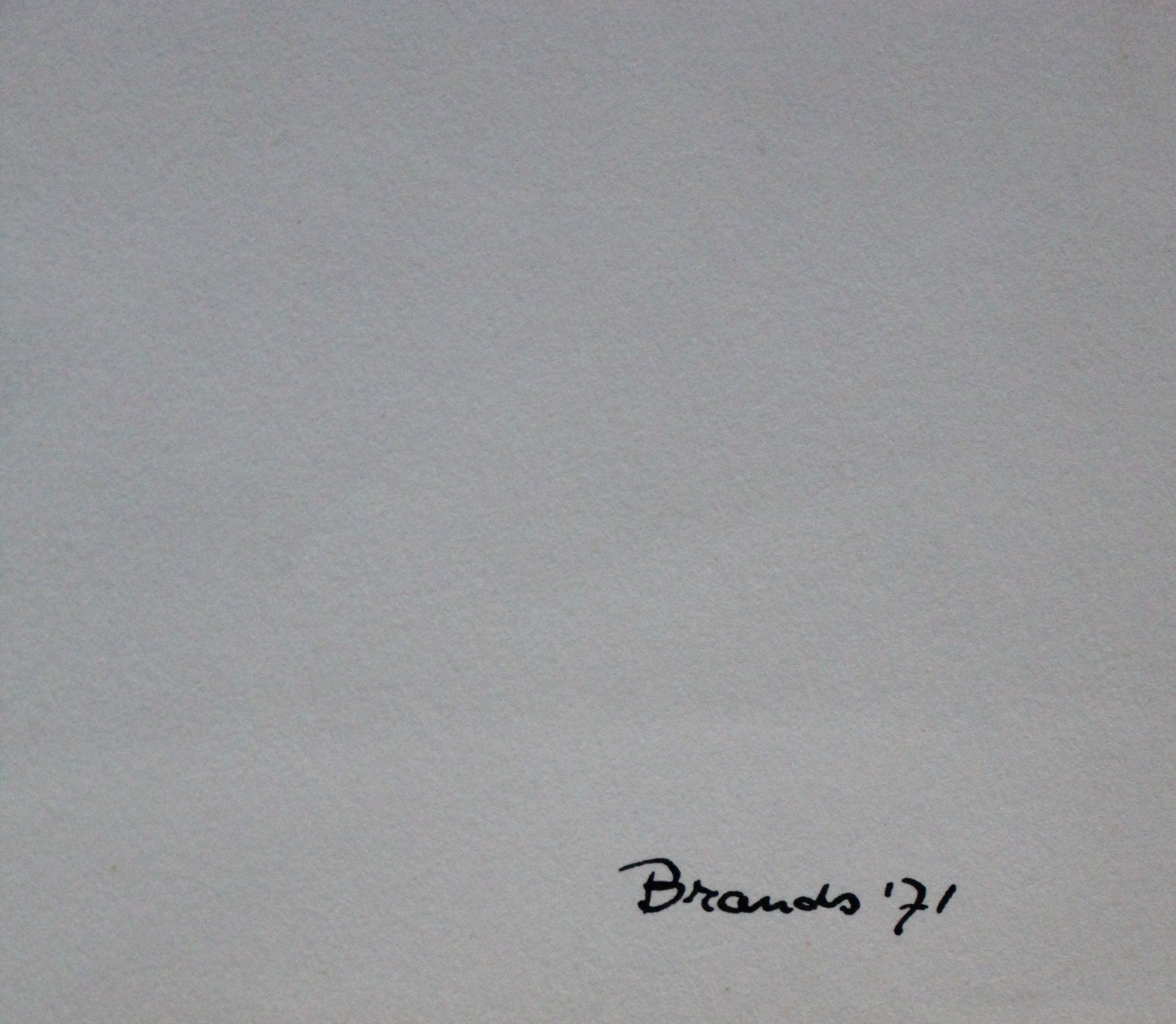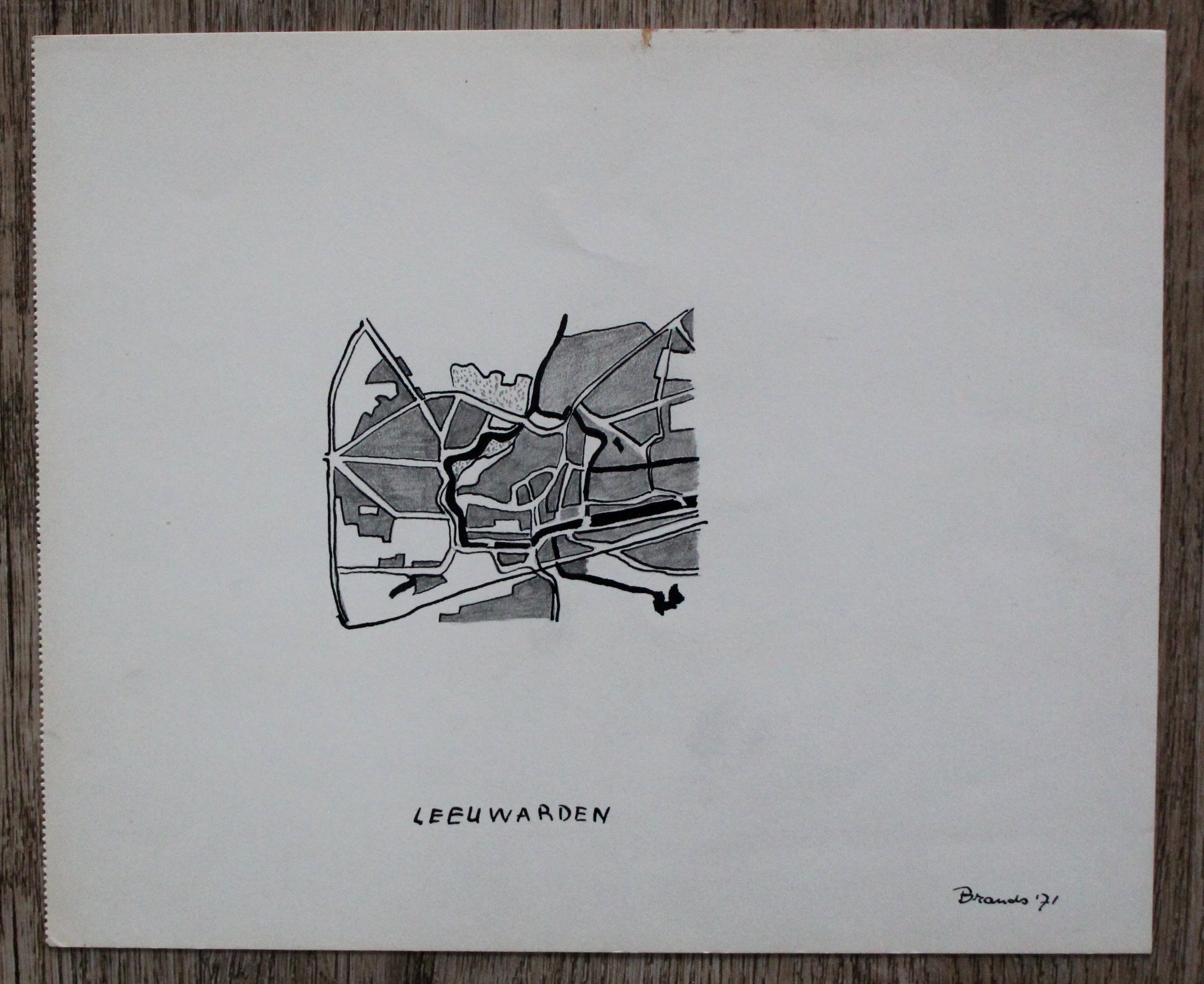 Bijzonder werk van Eugene Brands uit 1971. Plattegrond van de plaats Leeuwarden. Jaar: 1971. Het werk is rechtsonder gesigneerd en gedateerd.