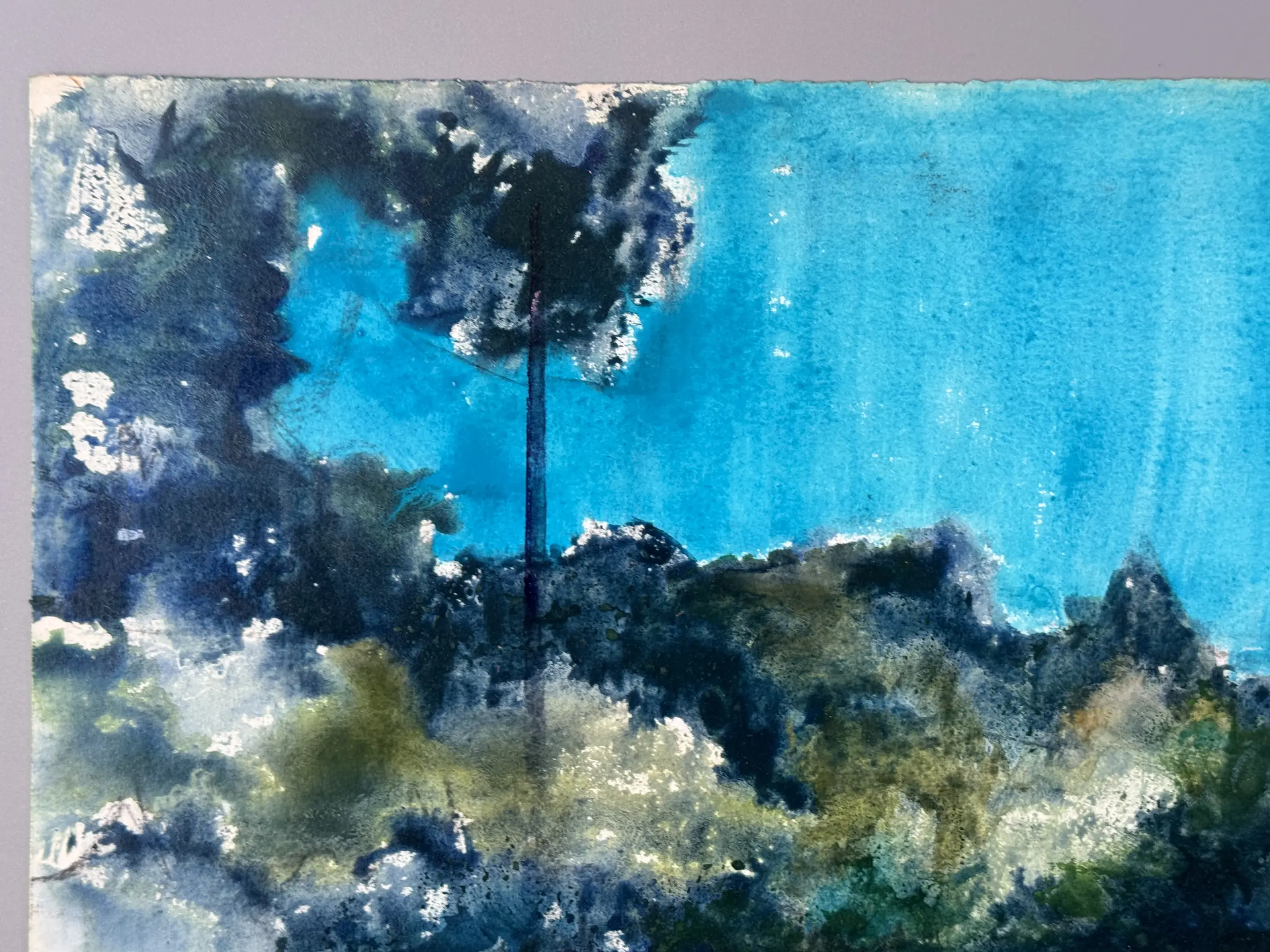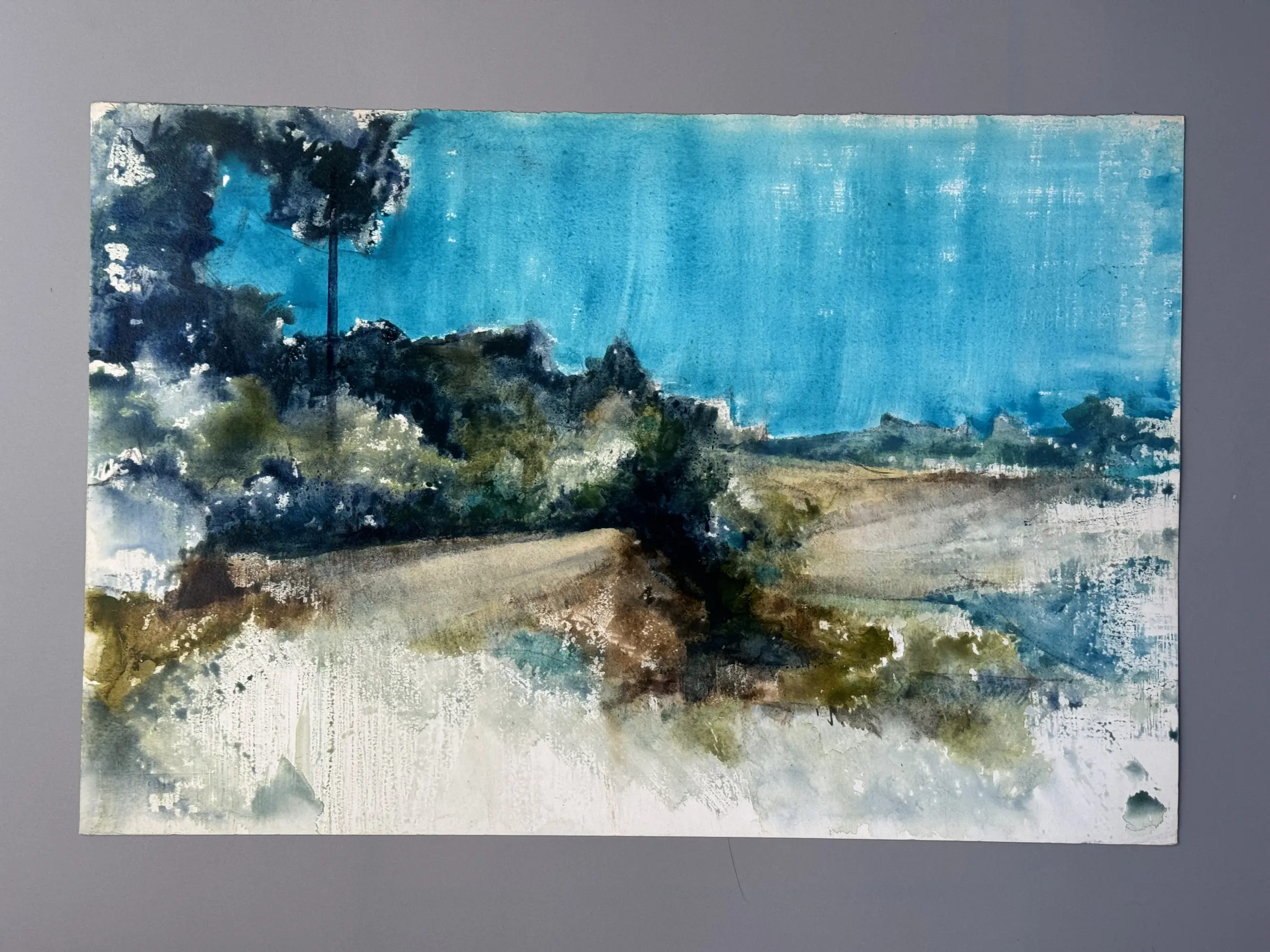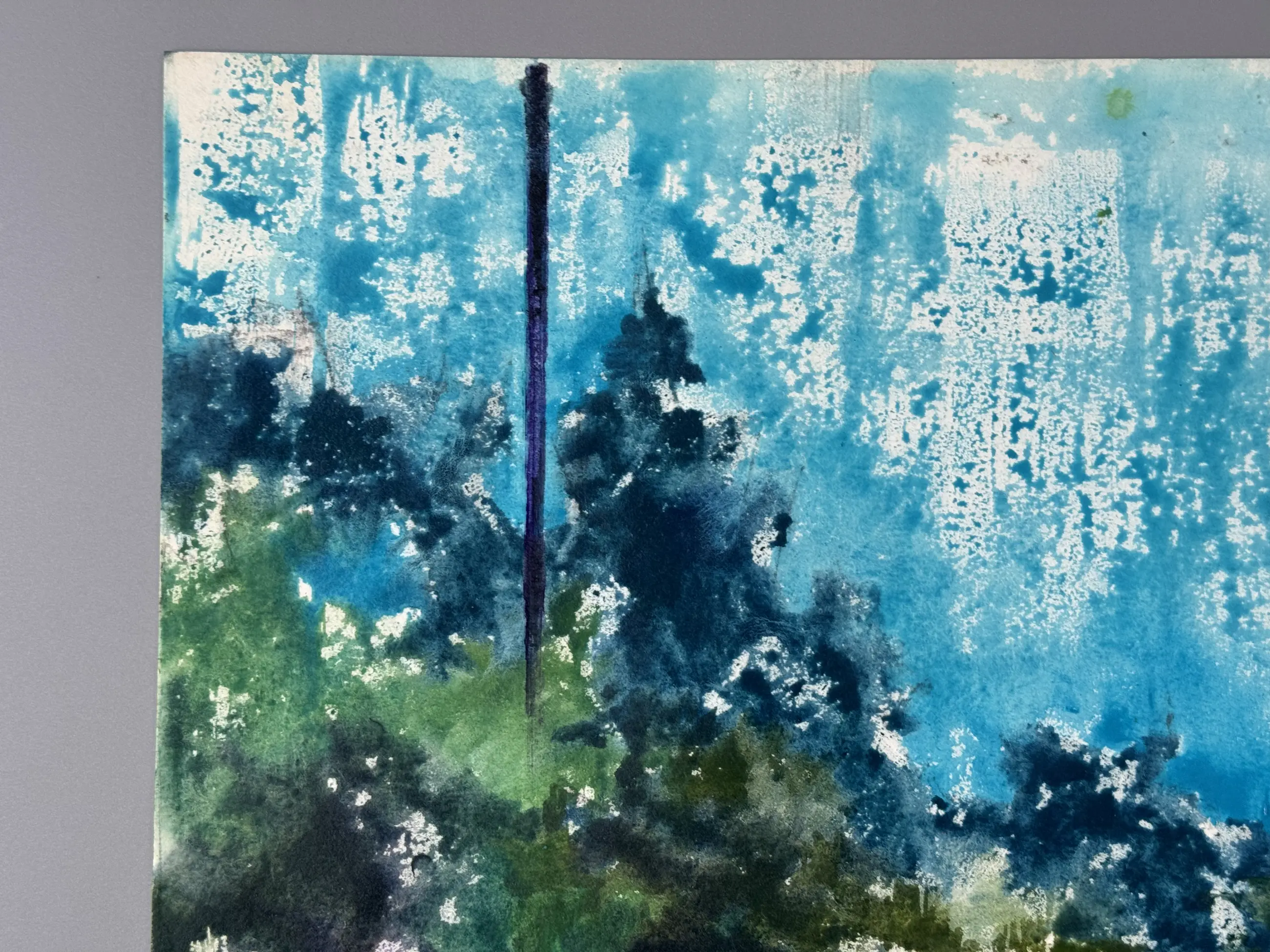 Deze twee landschappen roepen vluchtige indrukken op van een landelijke uitgestrektheid onder een uitgestrekte blauwe lucht. De kunstenaar gebruikt wasresist om het oppervlak te breken en een gelaagde textuur te creëren die gebladerte, wolken en de korrel van verre velden nabootst. De blauwe lucht lijkt ongewoon verzadigd, wat het contrast met de losse, aardse tinten eronder versterkt. Een enkel, verticaal element - mogelijk een paal of boom - aardt elke compositie. Ondanks hun abstracte kwaliteit behouden de werken een sterke atmosferische aanwezigheid, die de kijker uitnodigt in een zwevende, bijna dromerige ruimte.