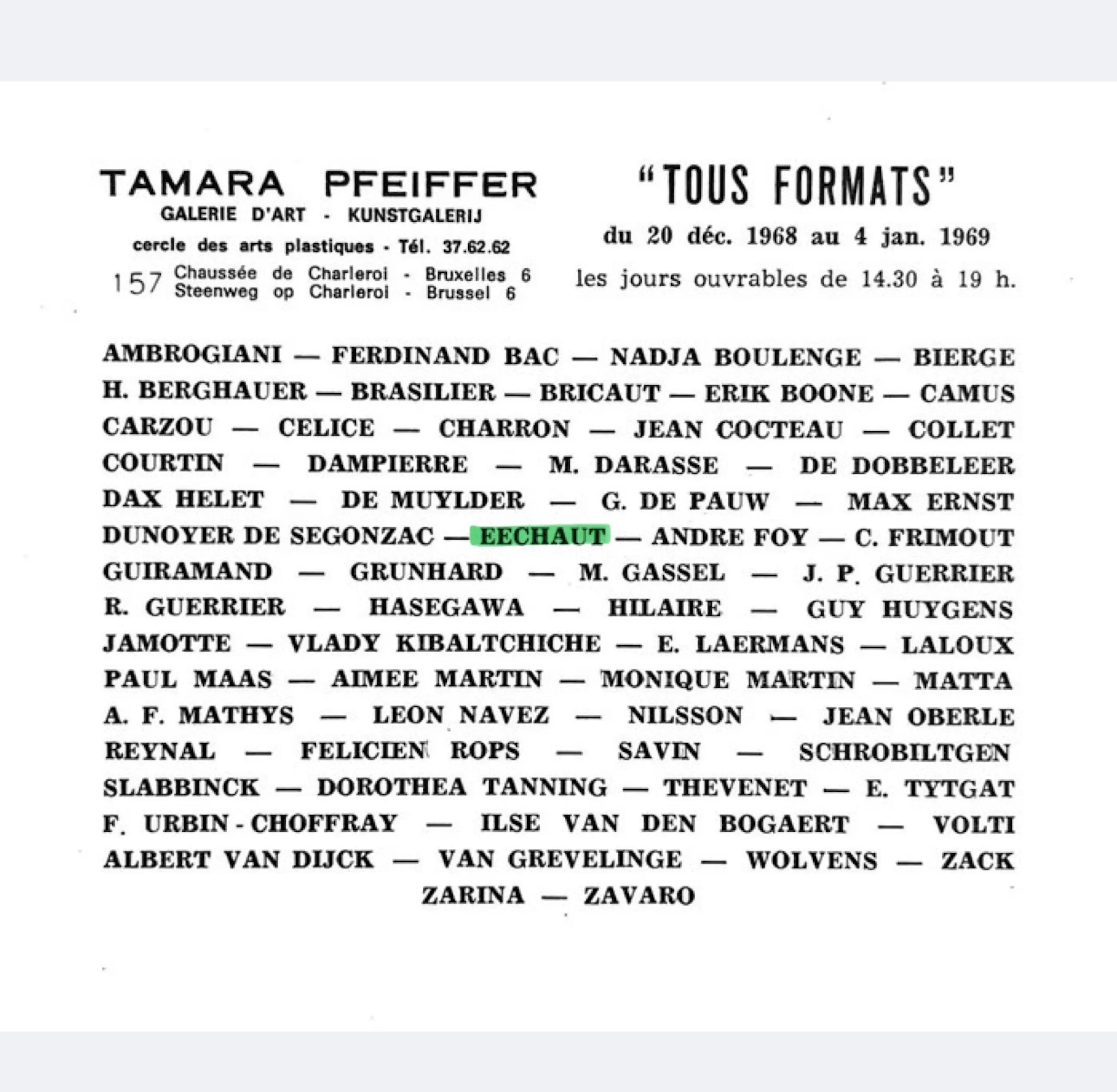 Sinds de jaren zestig exposeerde E. Eechaut samen met gerenommeerde kunstenaars zoals René Magritte in de Tamara Pfeiffer Galerie in Brussel. Archieffoto's en uitnodigingskaarten bevestigen zijn deelname aan tentoonstellingen met figuren als Ambrogiani, Bricault, Jean Cocteau, Max Ernst, Hilaire en Félicien Rops, onder anderen.