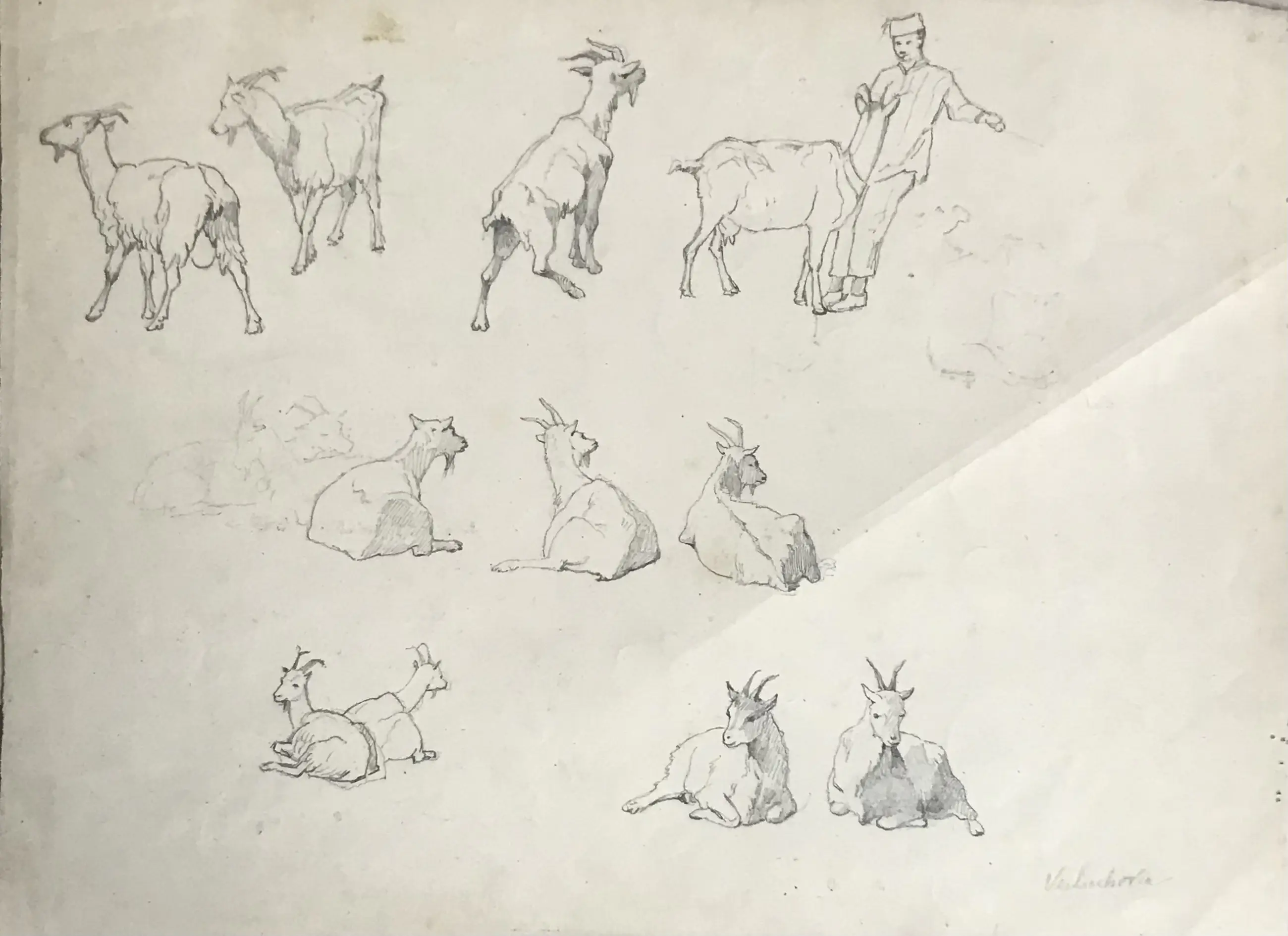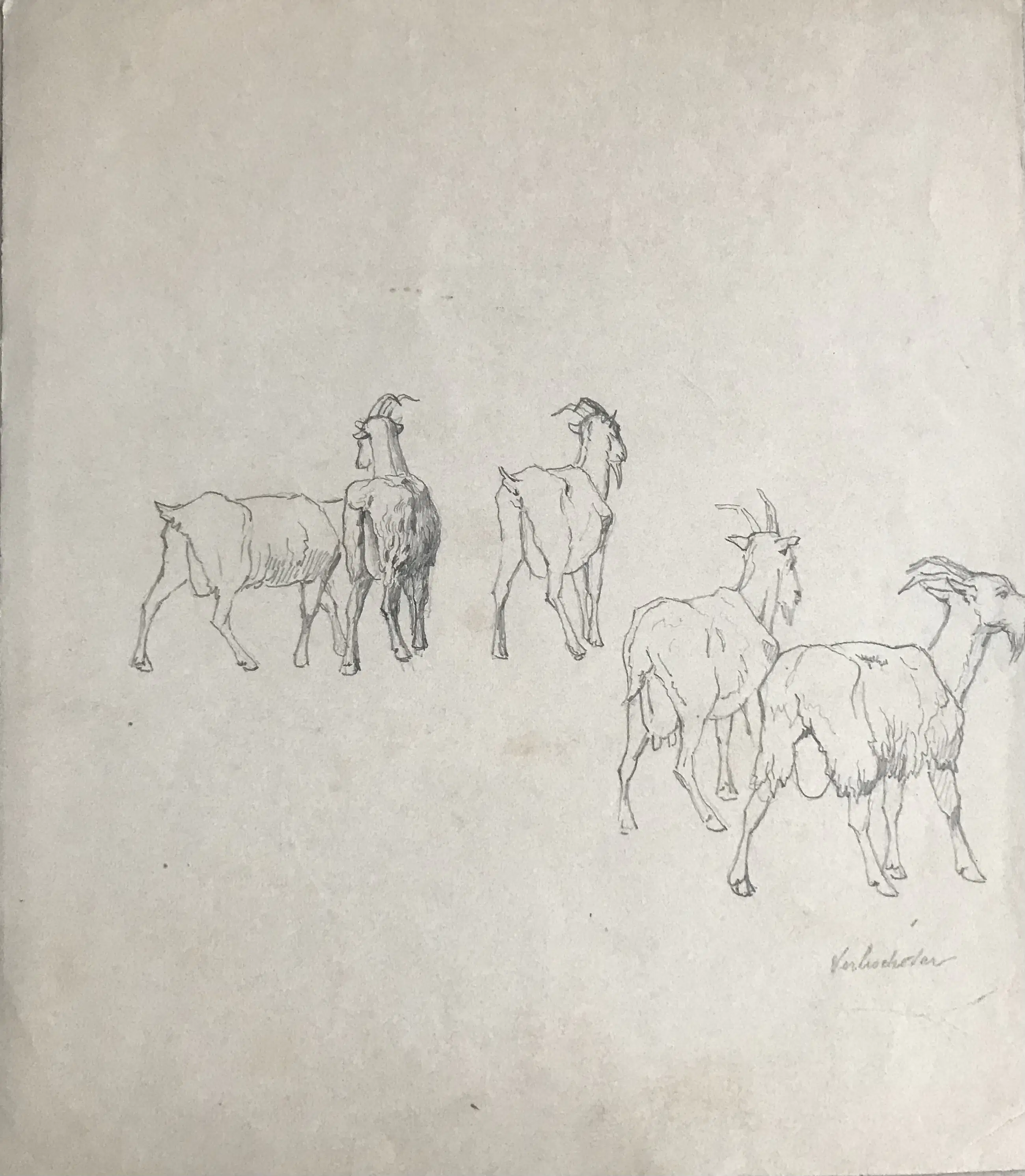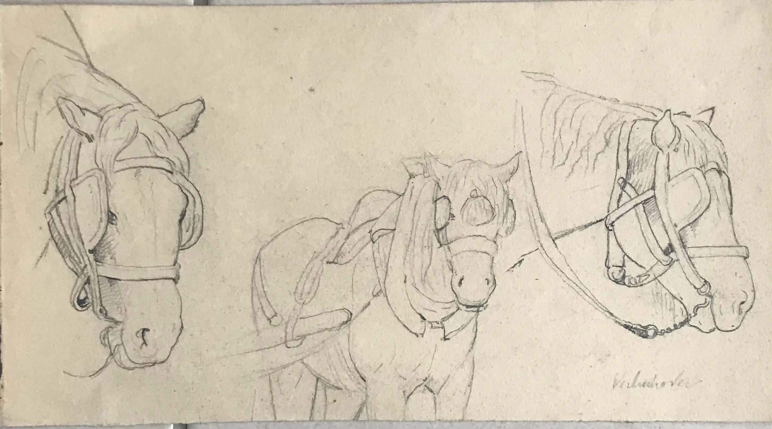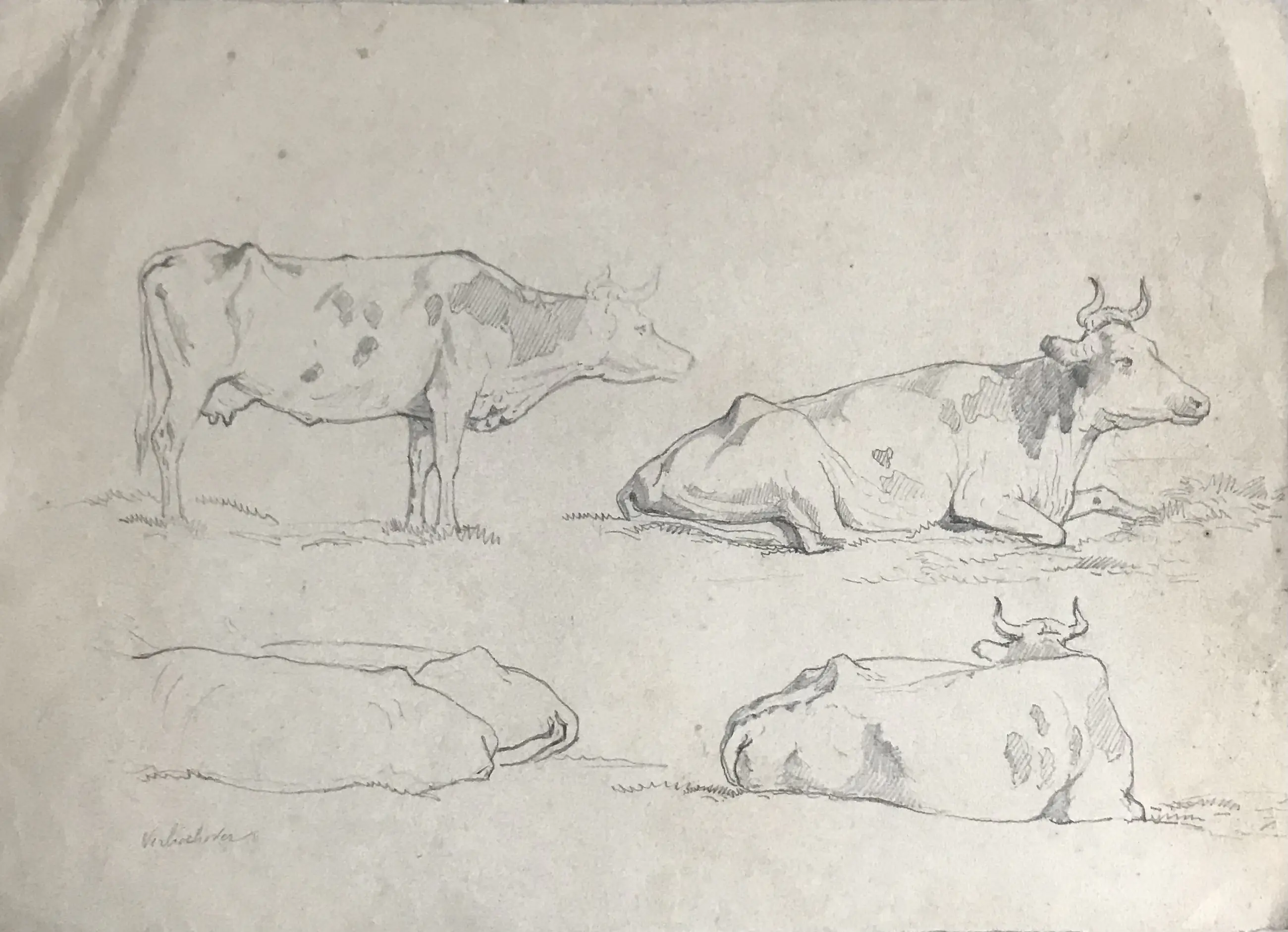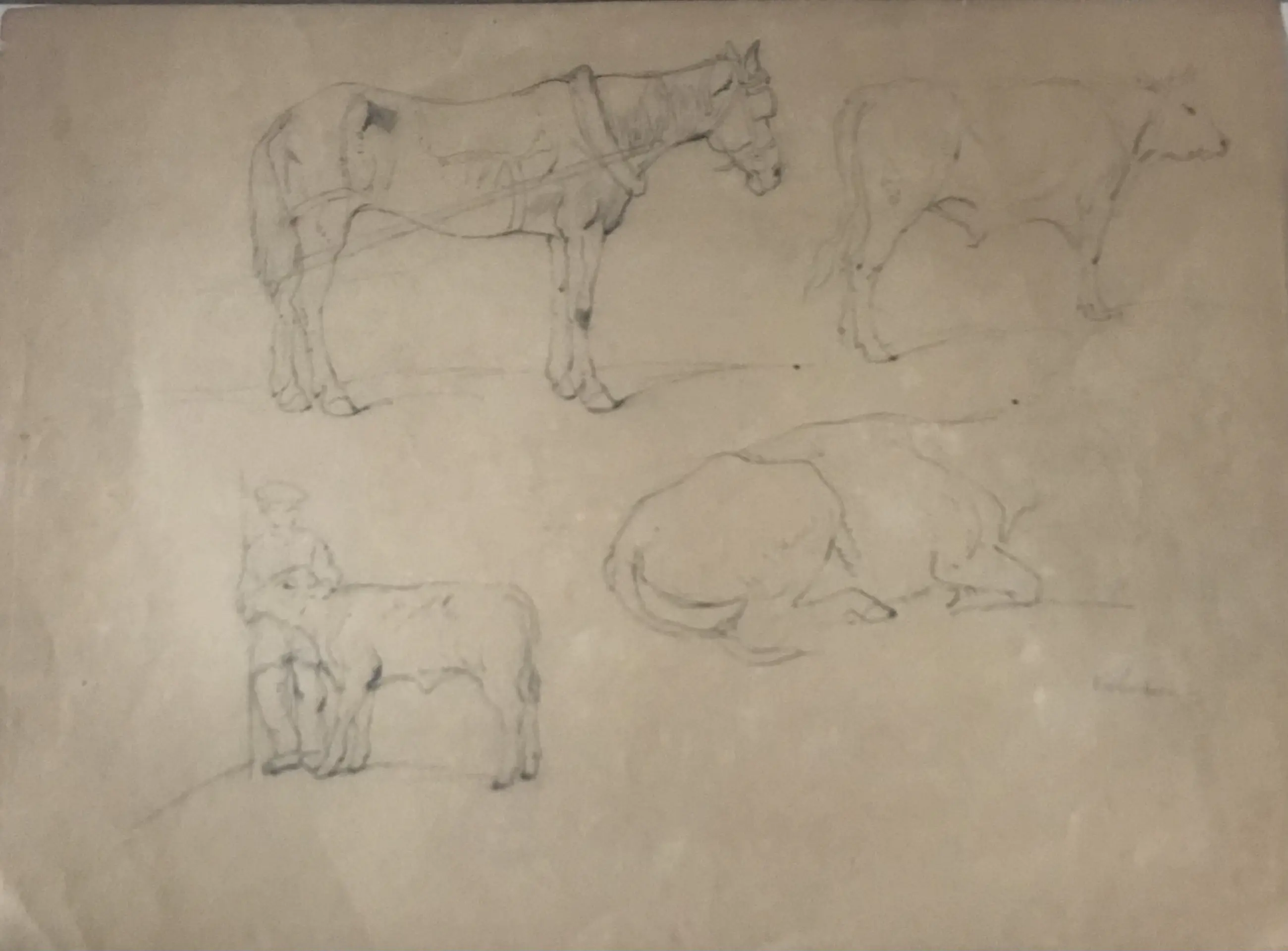 8 x tekening (studies) met typisch werk van de kunstenaar.