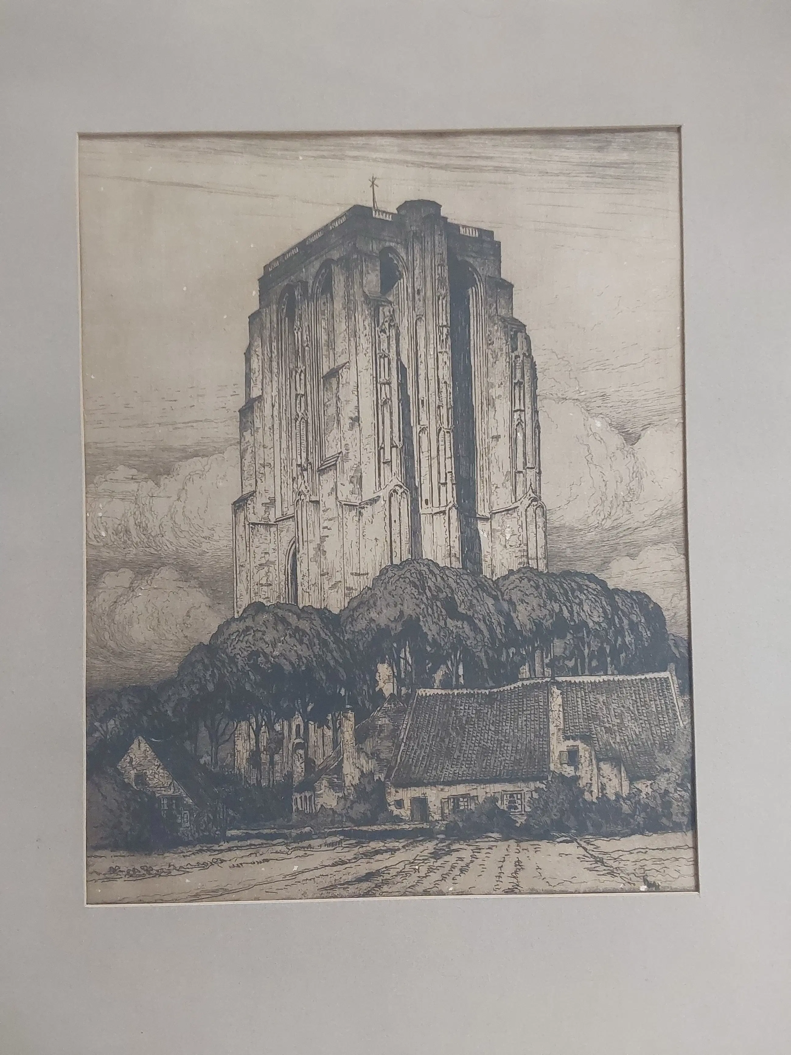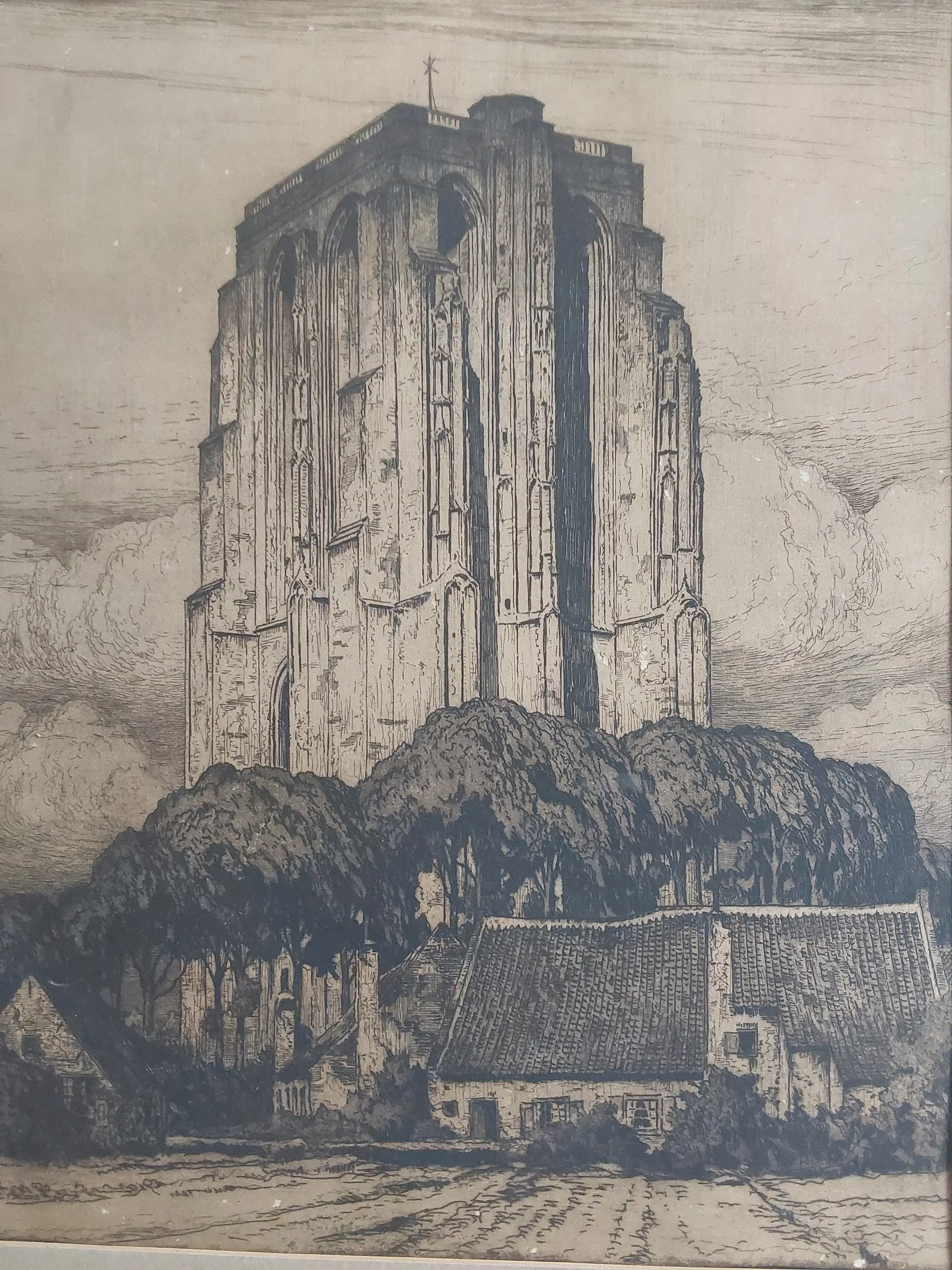 Fraaie grote ets met een bijzondere uitstraling door de plaatsing van de toren.. Ik heb handgesigneerd ingevuld, maar de signatuur is niet zichtbaar, zit waarschijnlijk achter het passé partout. Dit is op eerder verkochte werken te zien. Het werk is in redelijke staat. Vergeling papier en witrand. Kleine witte vlekjes zichtbaar.