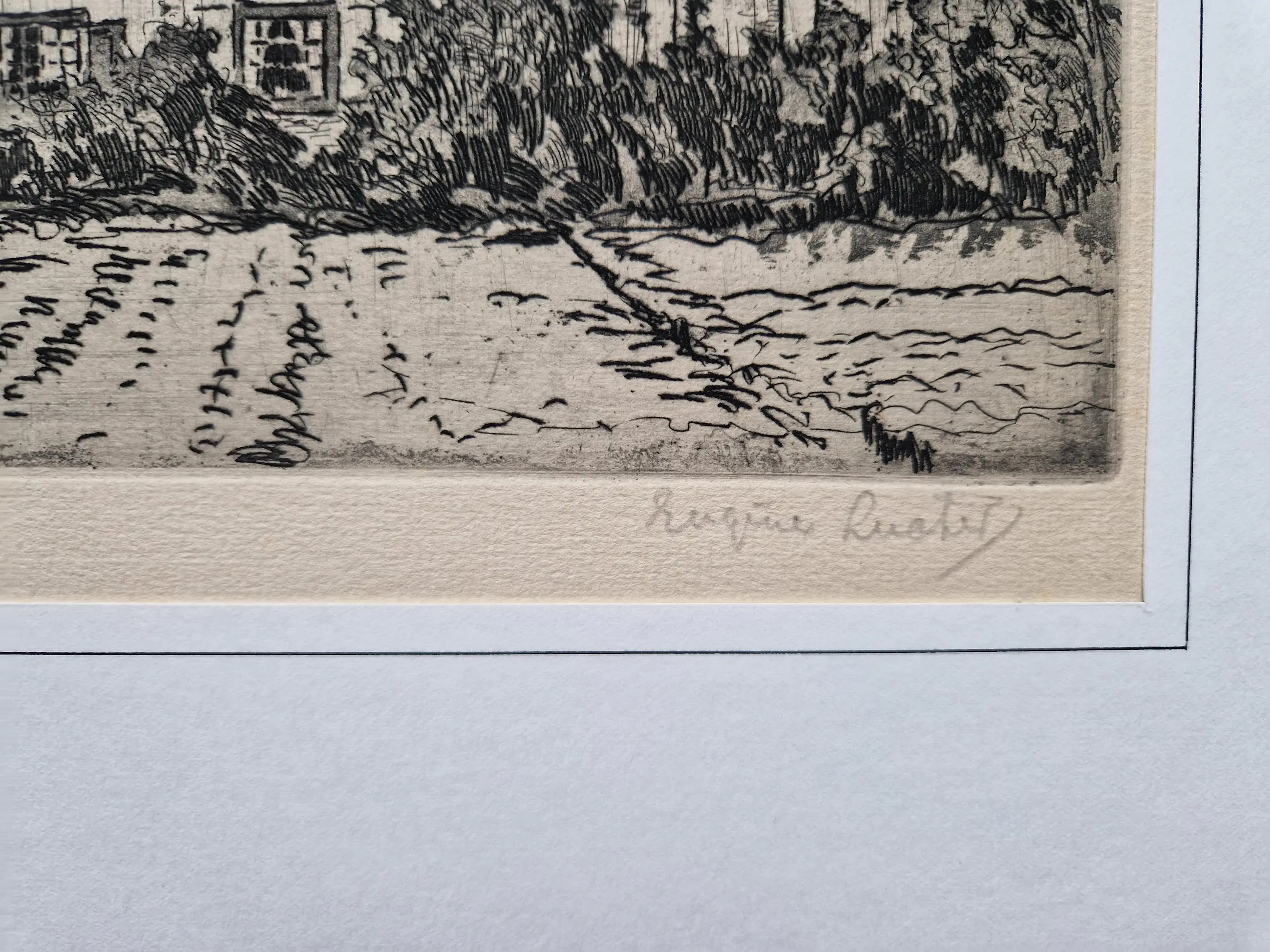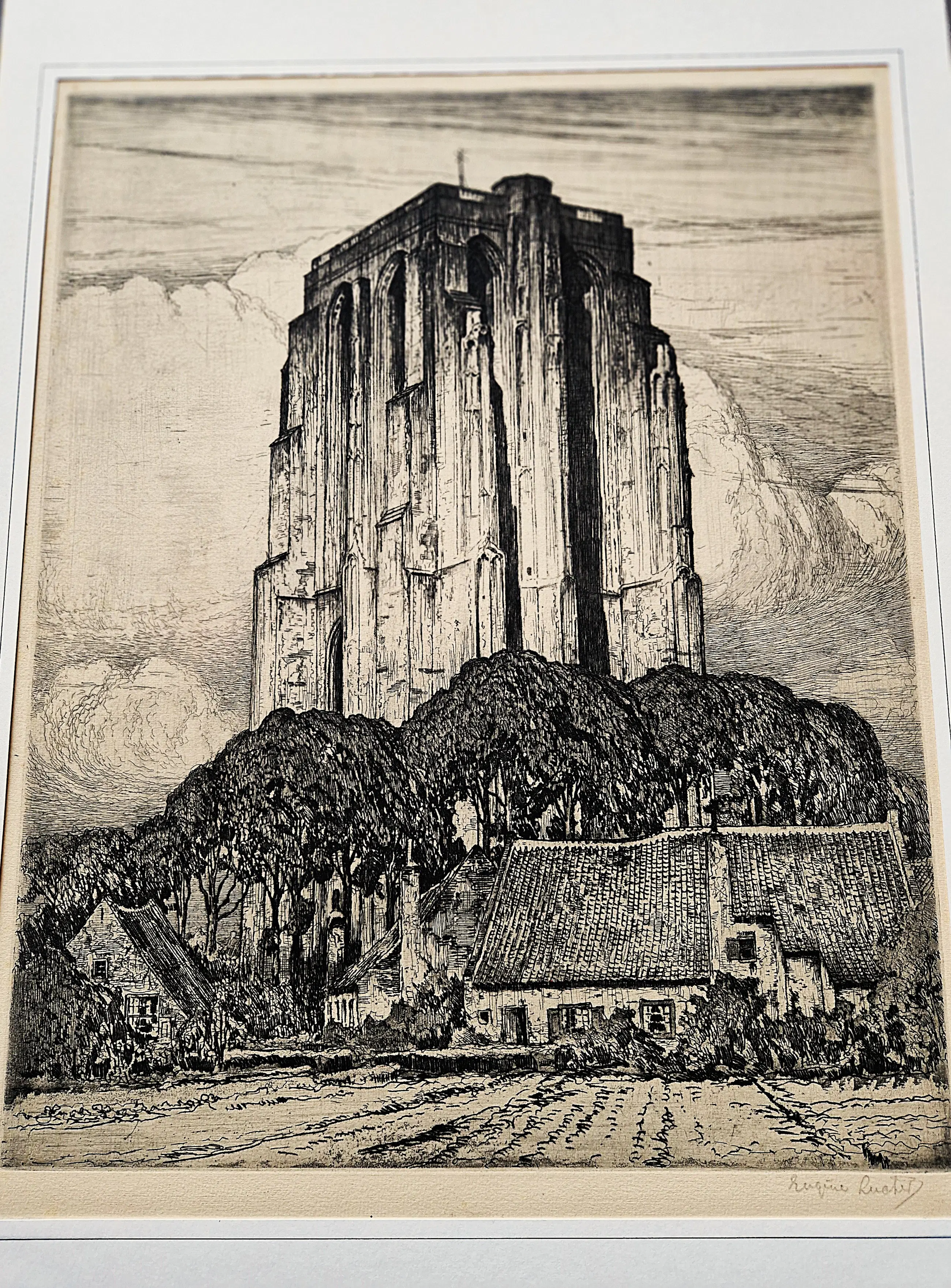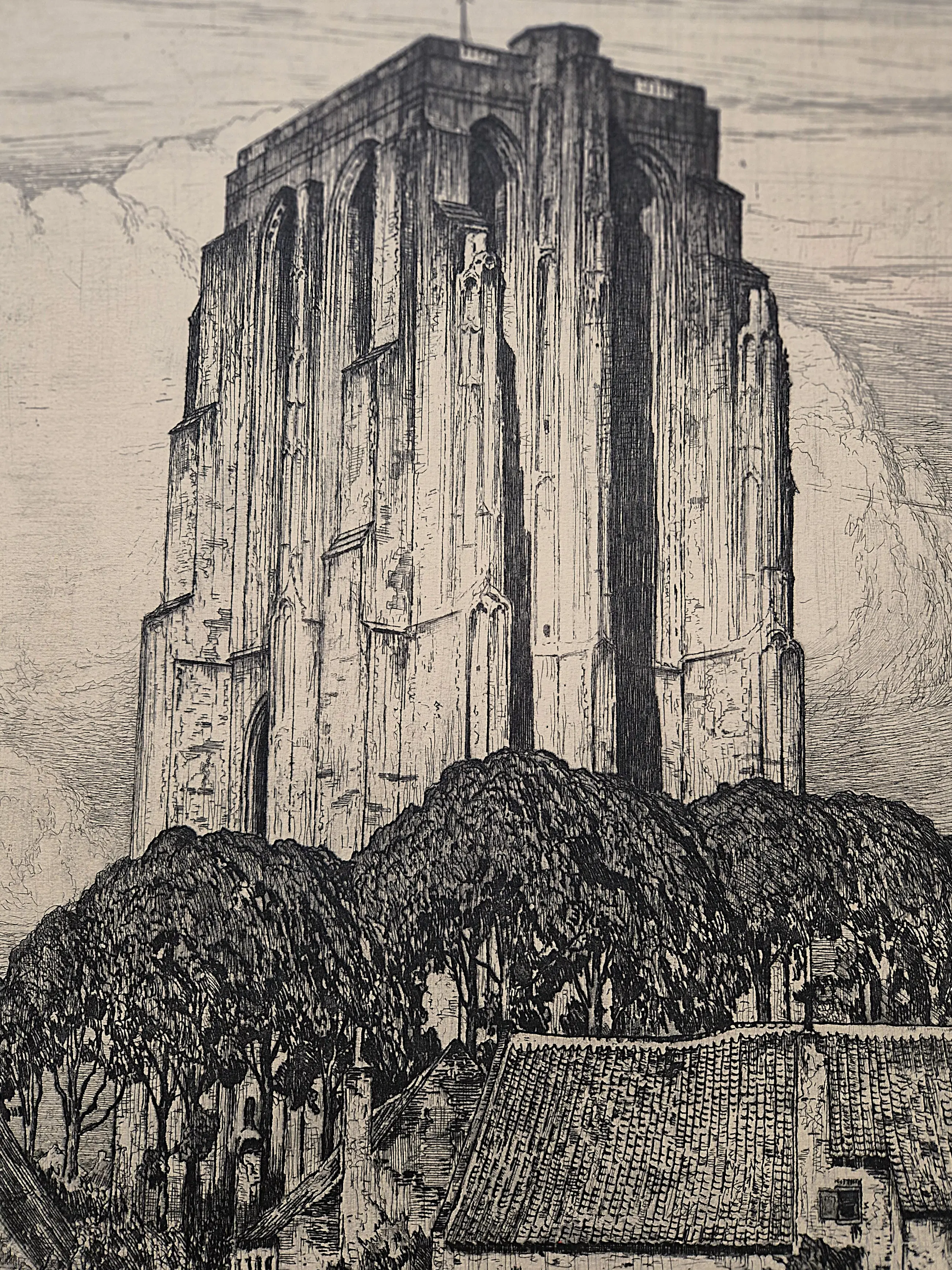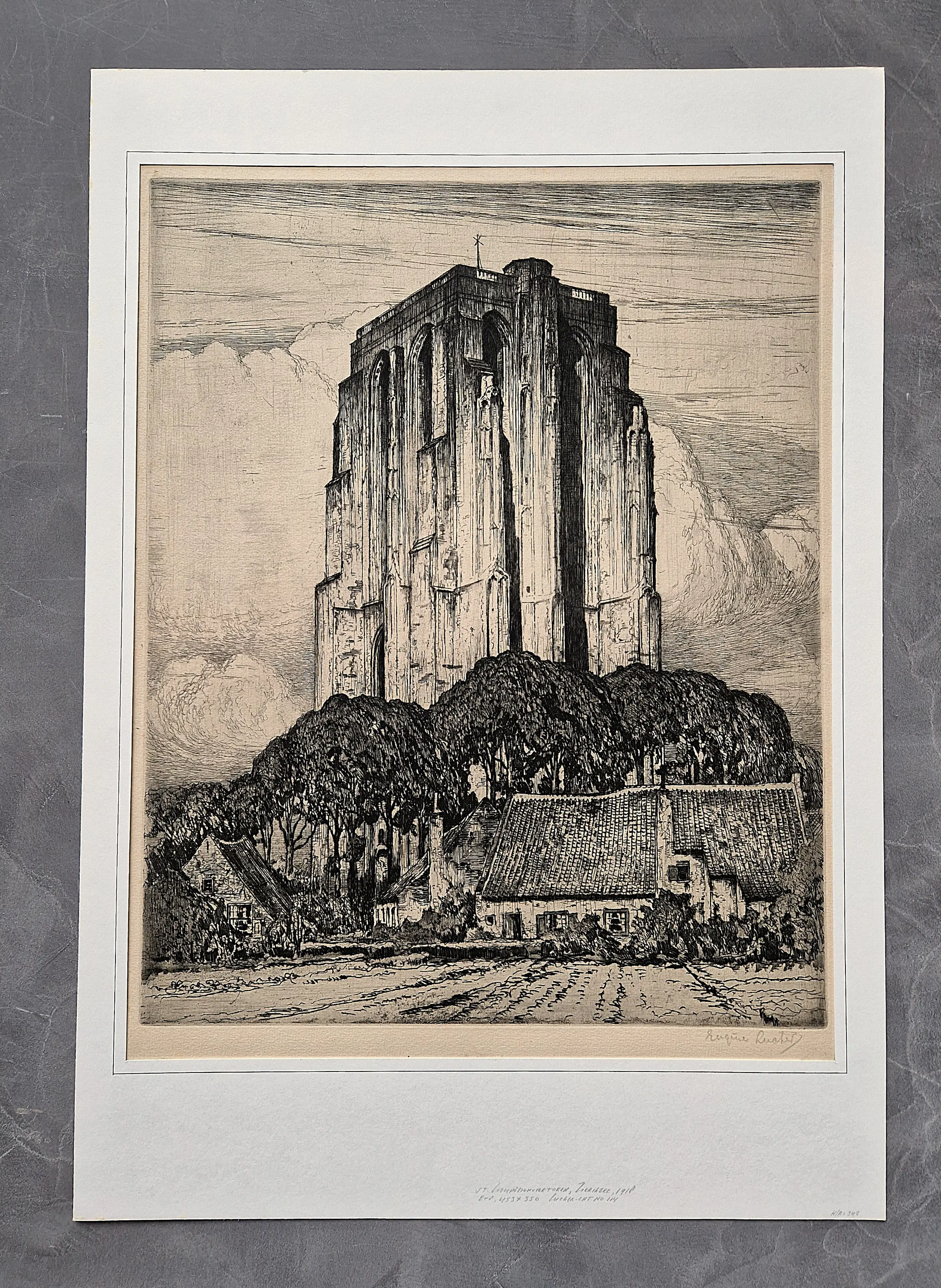 - Prachtige grote ets van Eugene Lucker. Een karaktervol werk met fijne details in de wolkenpartijen, zonnestralen en de kenmerken van de toren. Gesigneerd in potlood rechts-onder en in passe partout geplaatst.