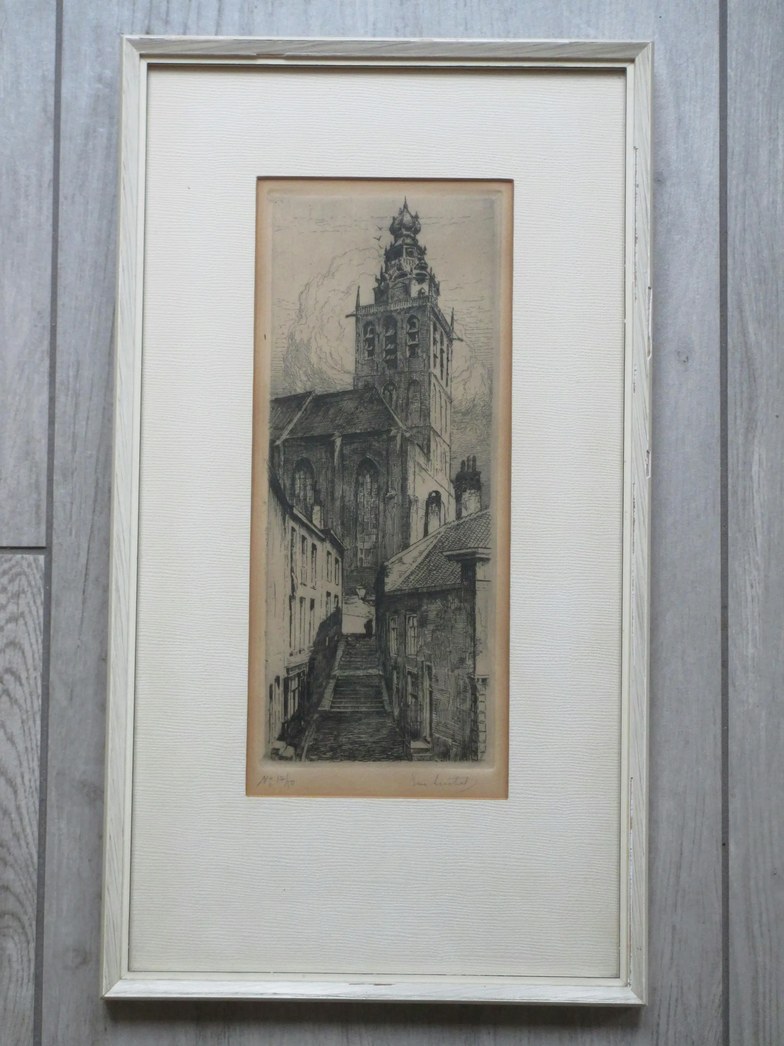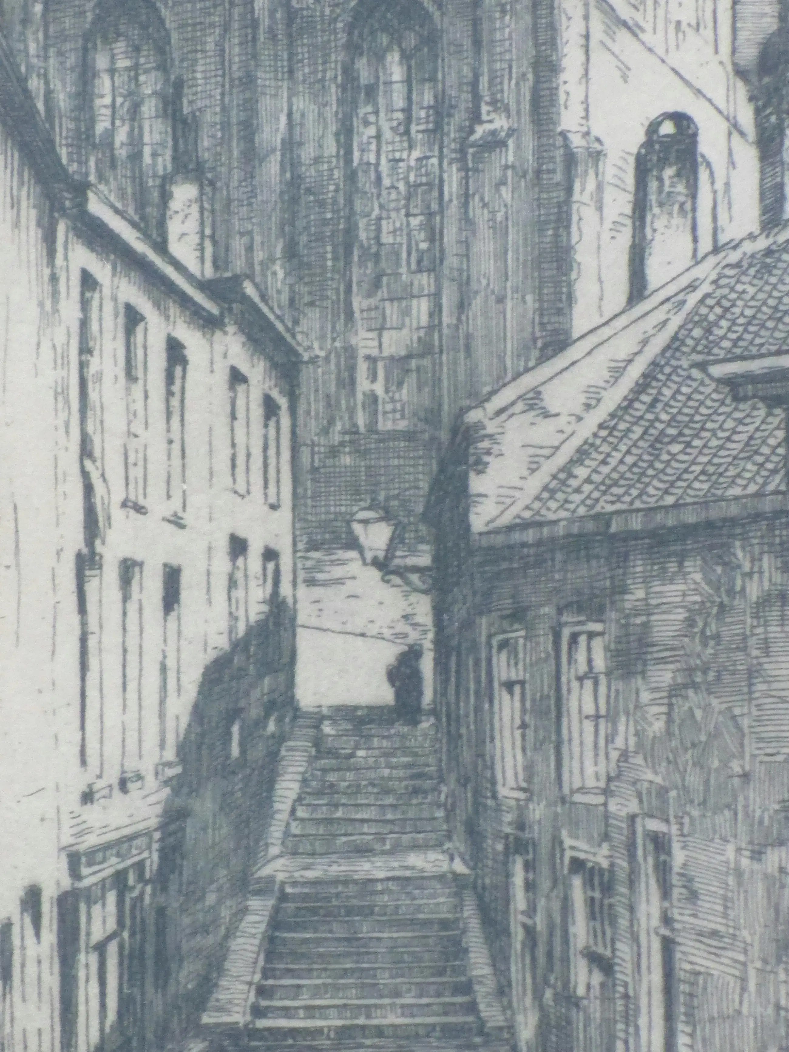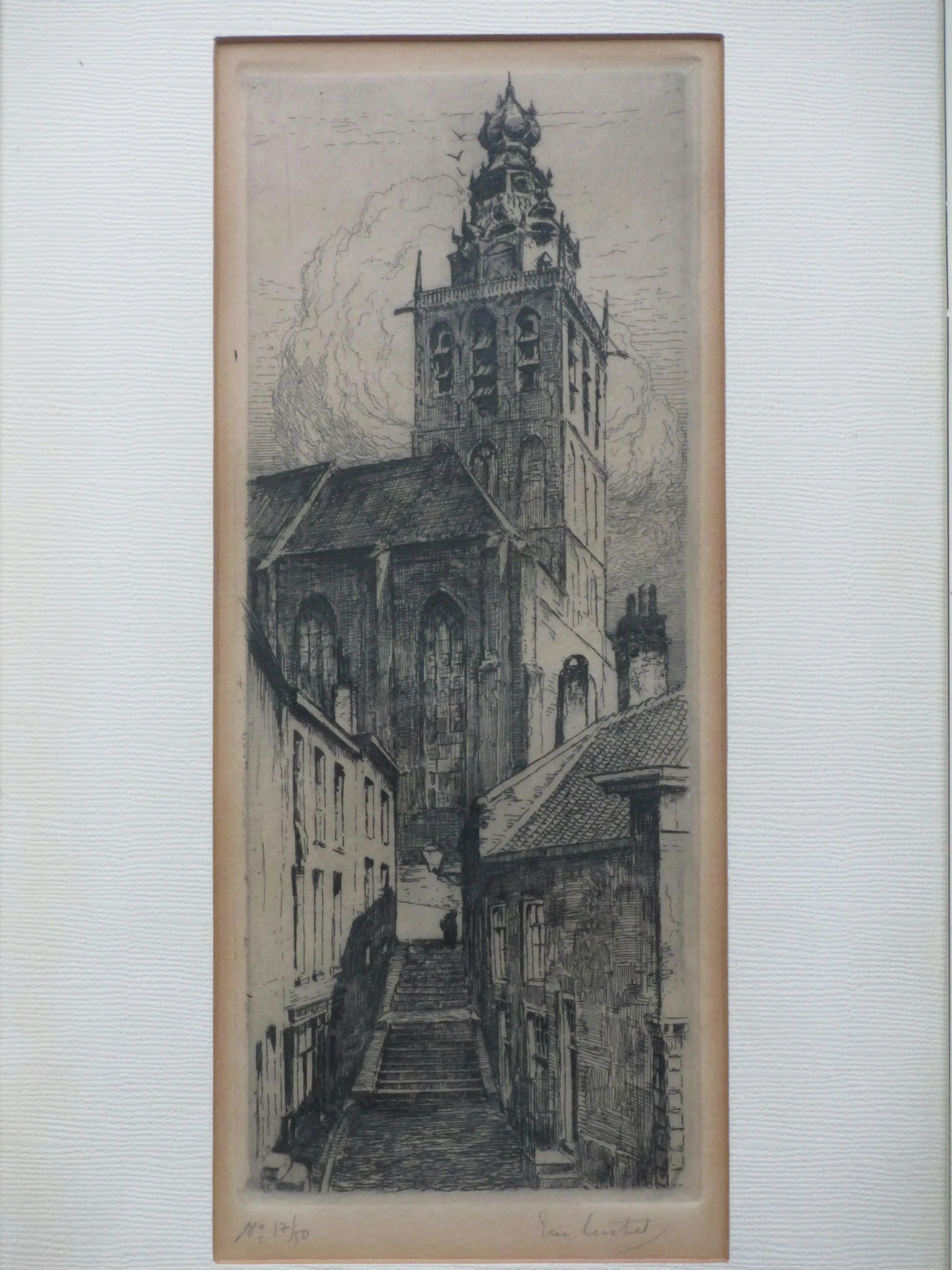 Fraaie Nijmeegse ets door Eugene Lucker Voorstelling van de Noordelijke Kerktrappen bij de Stevenskerk in Nijmegen Gelijst, beeldmaat 25.2x9.8, lijstmaat 42x23 Gesigneerd in potlood r.o.: 'Eug Lucker' Genummerd in potlood l.o.: 'No 17/50' Literatuur: Lemmens - Grafisch werk Eugène Lücker - nr.59 Authenticiteit volledig gegarandeerd