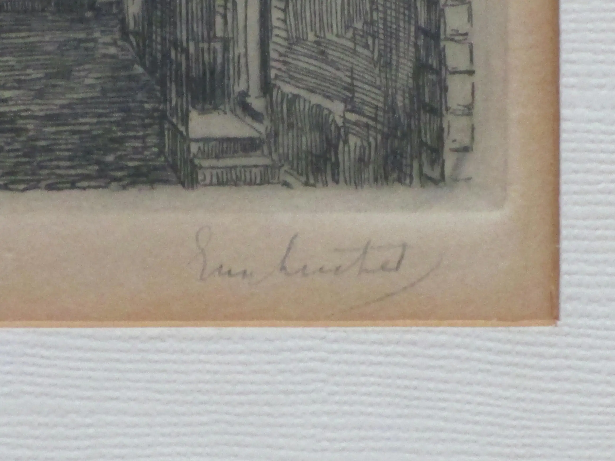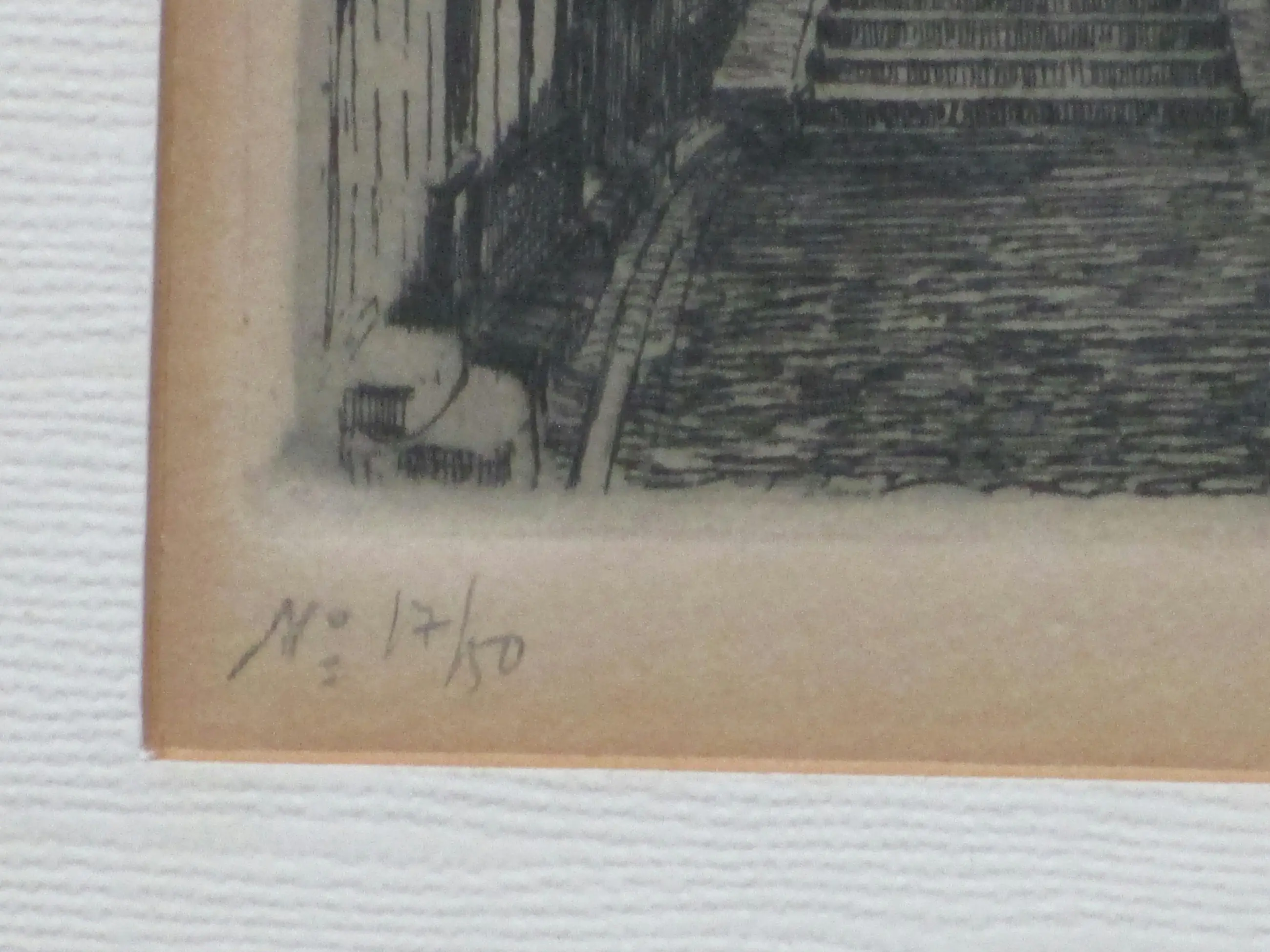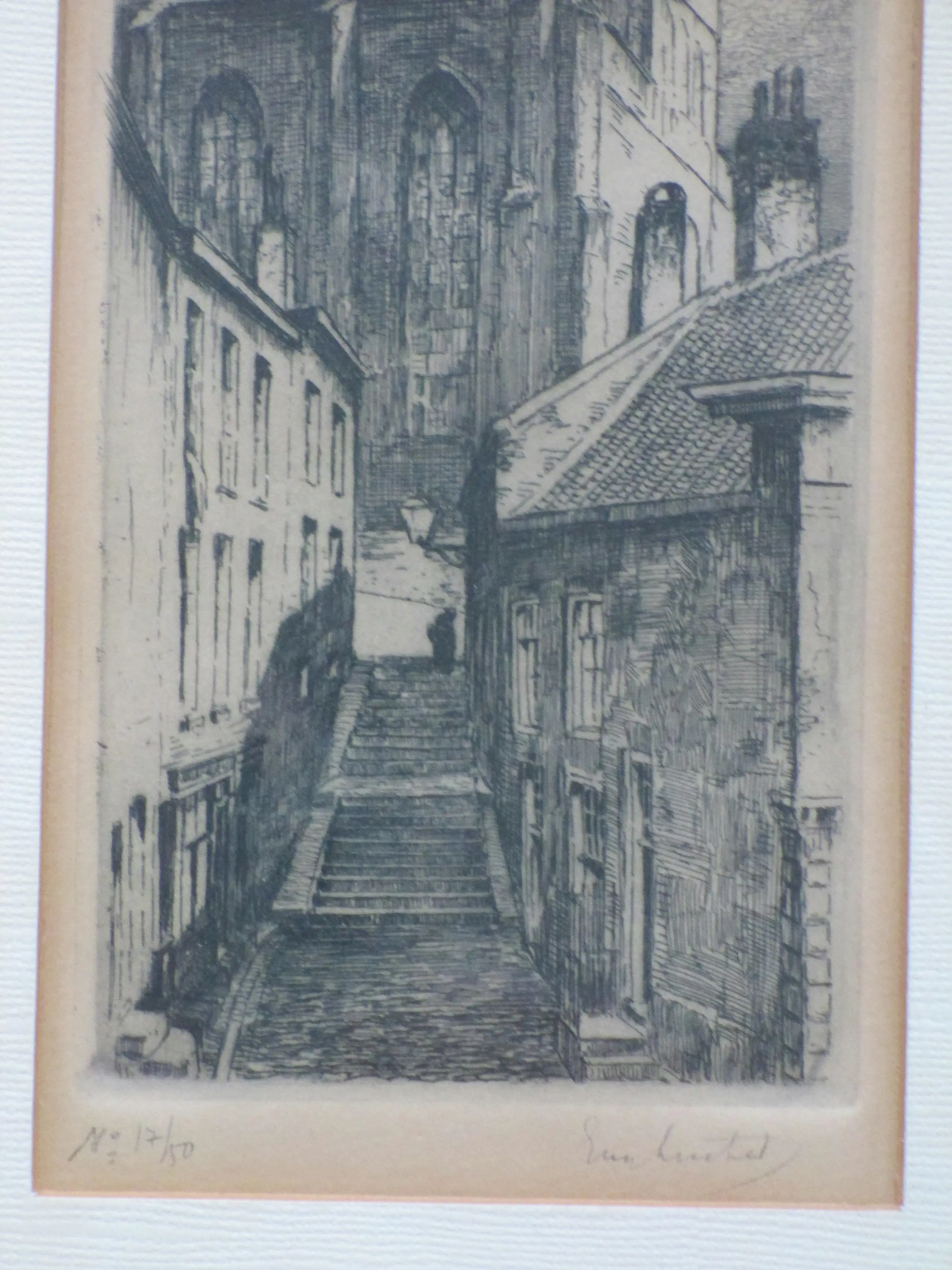 Fraaie Nijmeegse ets door Eugene Lucker Voorstelling van de Noordelijke Kerktrappen bij de Stevenskerk in Nijmegen Gelijst, beeldmaat 25.2x9.8, lijstmaat 42x23 Gesigneerd in potlood r.o.: 'Eug Lucker' Genummerd in potlood l.o.: 'No 17/50' Literatuur: Lemmens - Grafisch werk Eugène Lücker - nr.59 Authenticiteit volledig gegarandeerd