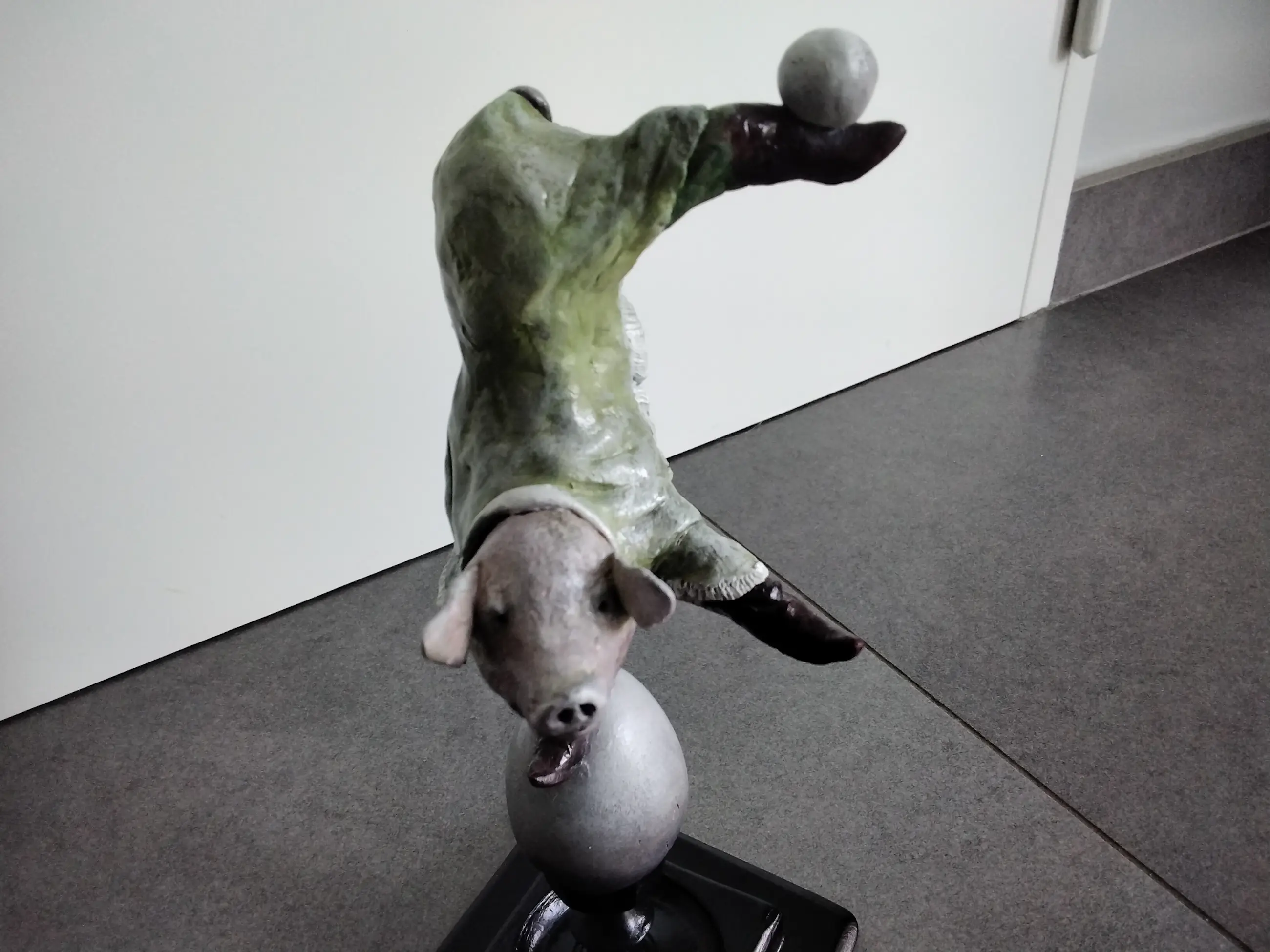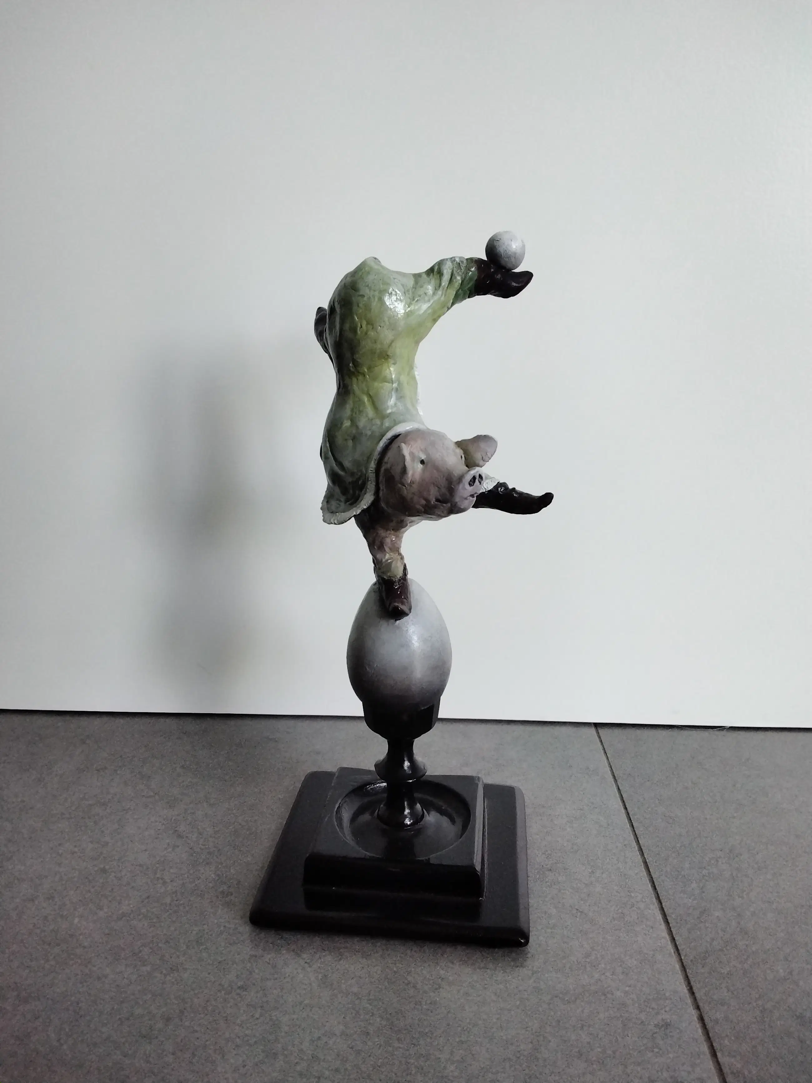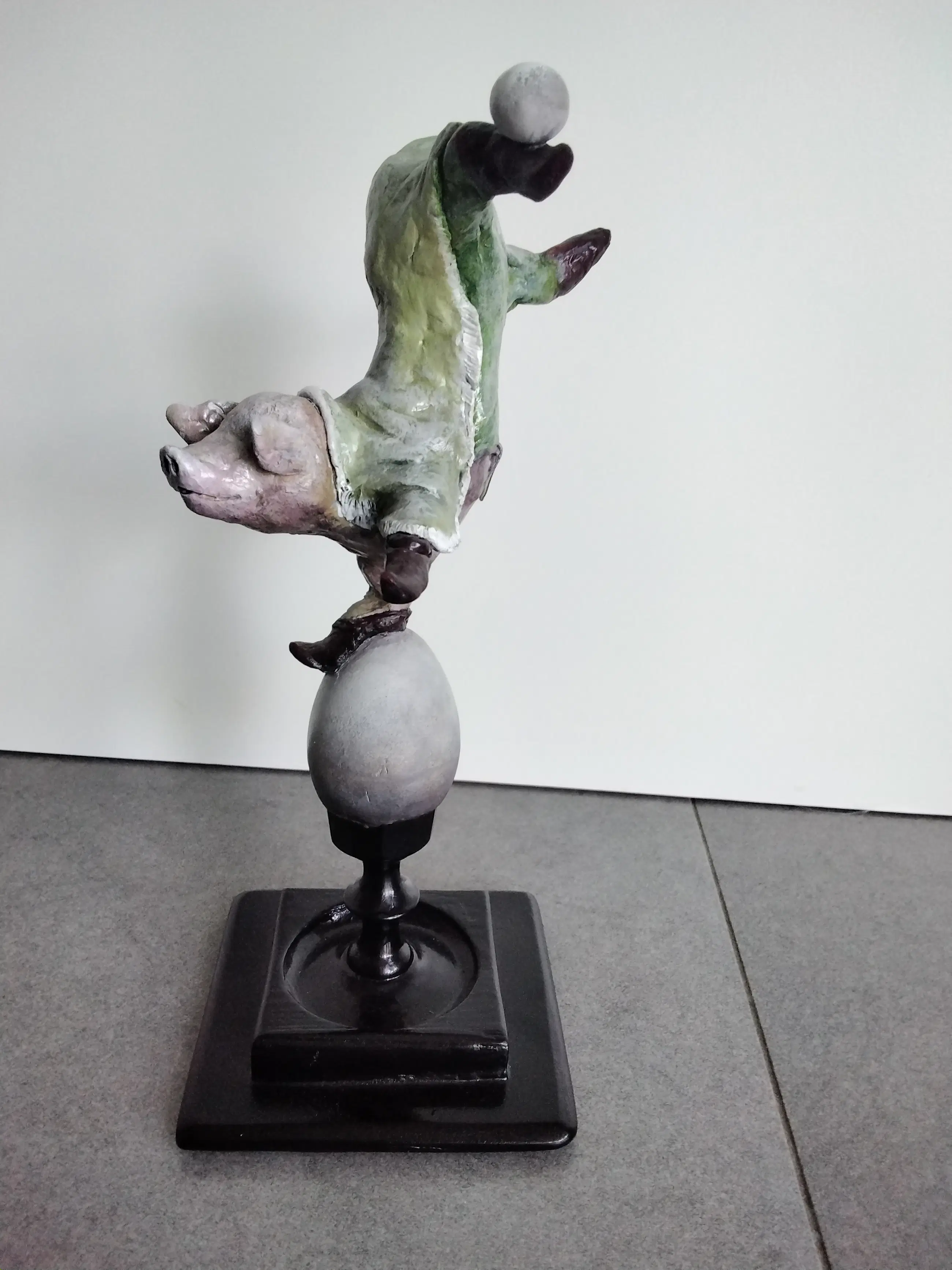 Keramiek varken met de hand gemaakt en beschilderd op een houten voet. Uniek exemplaar