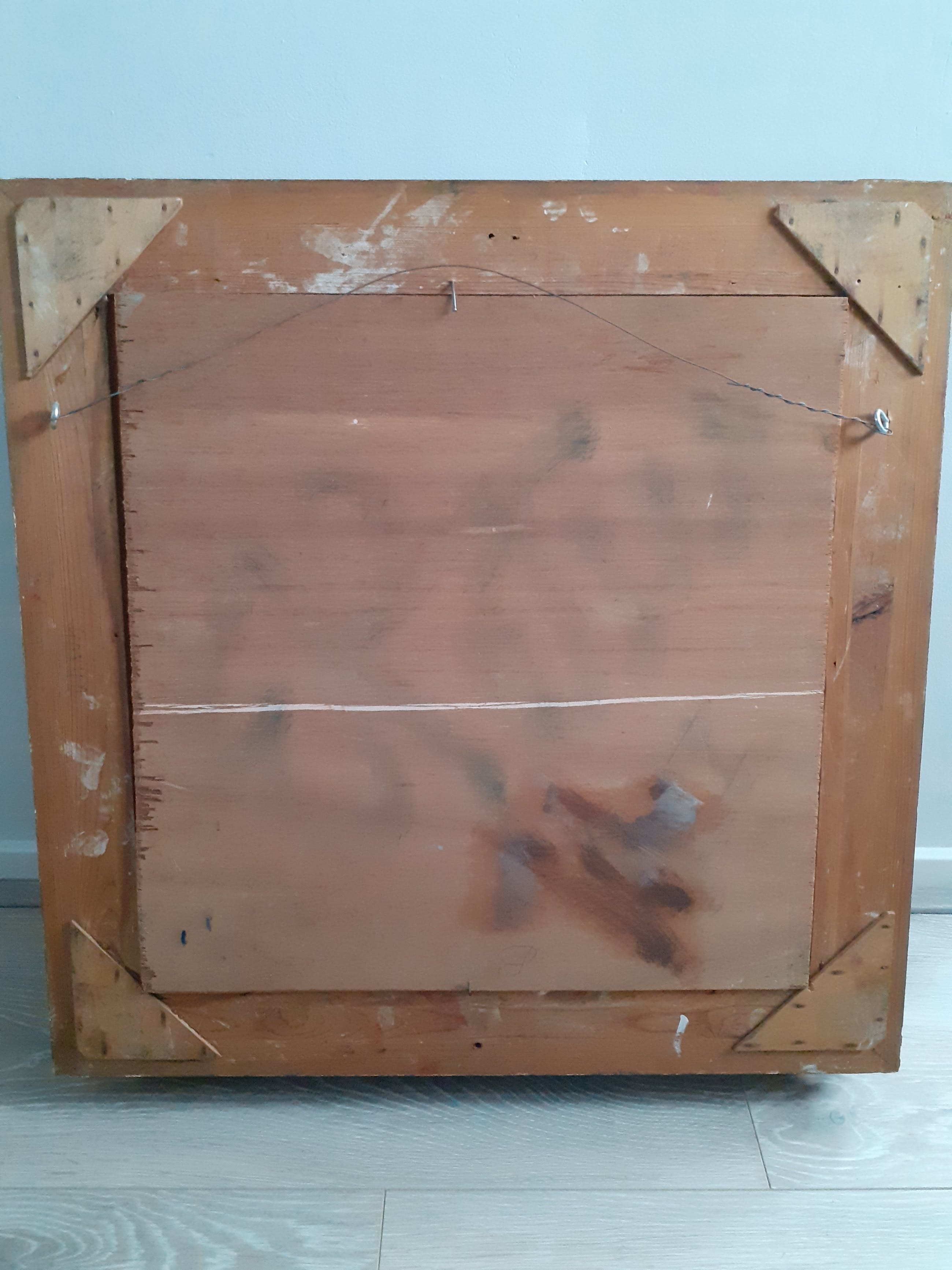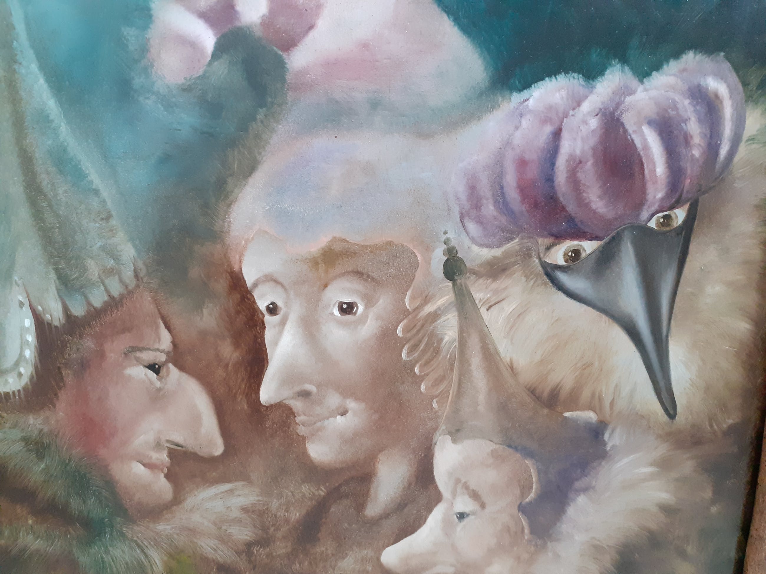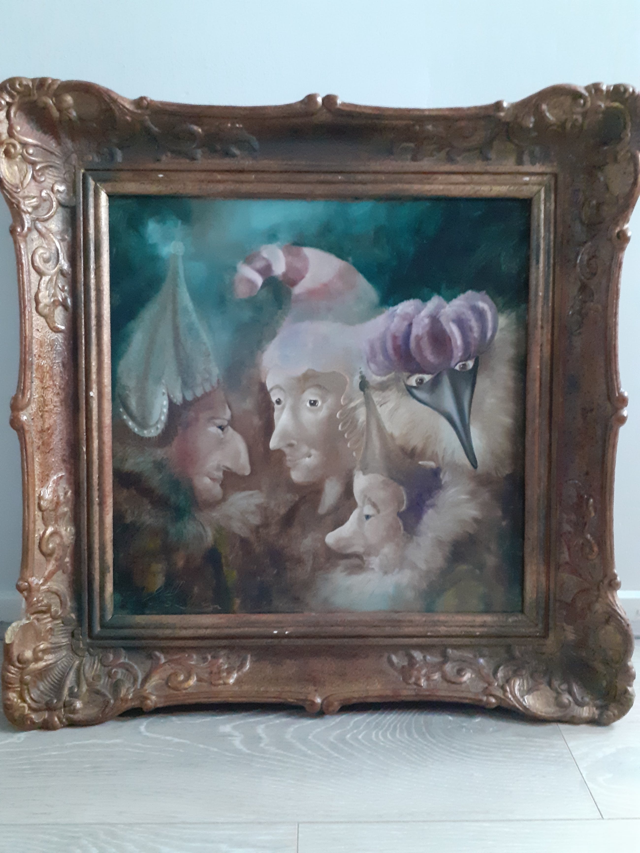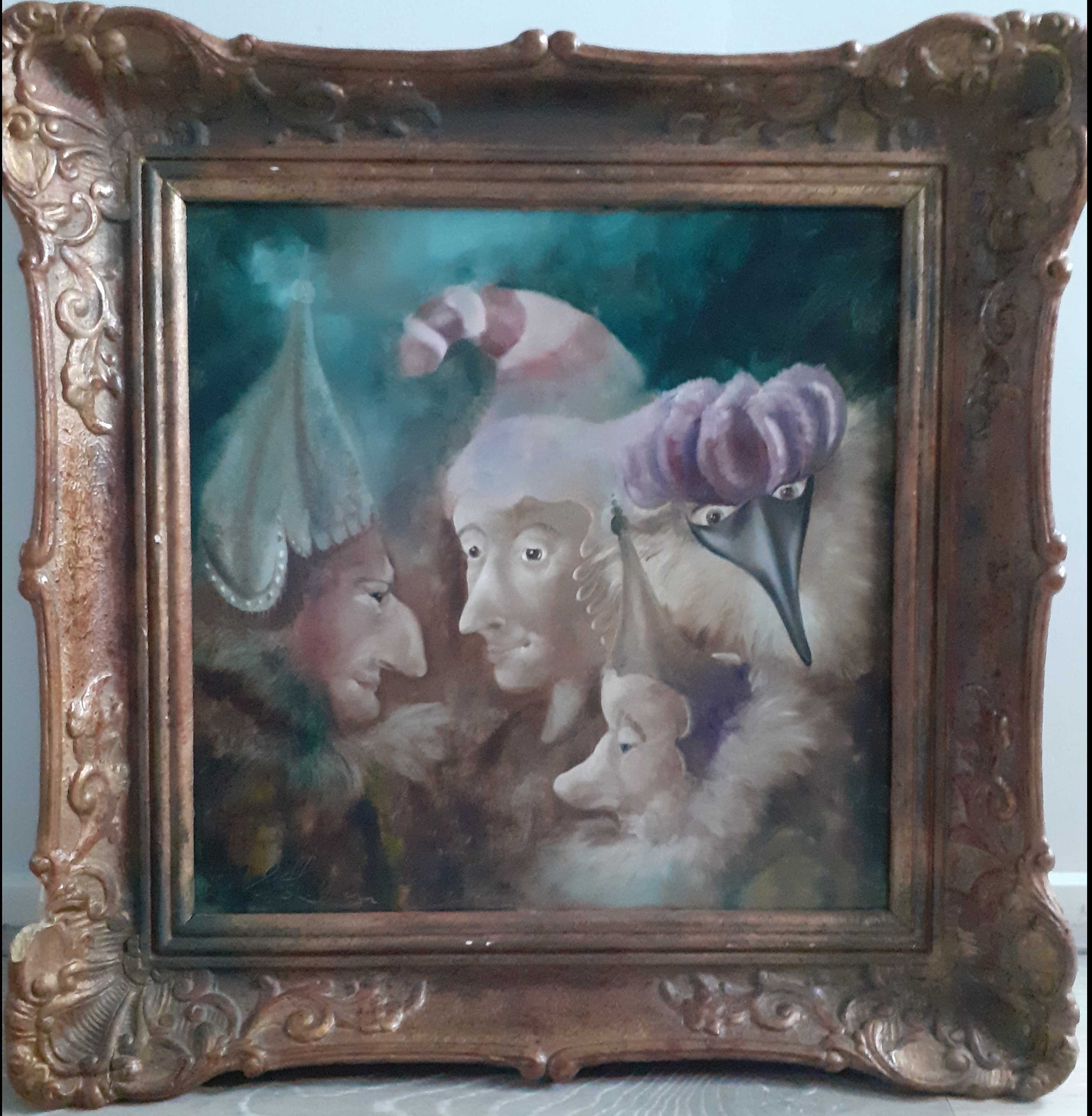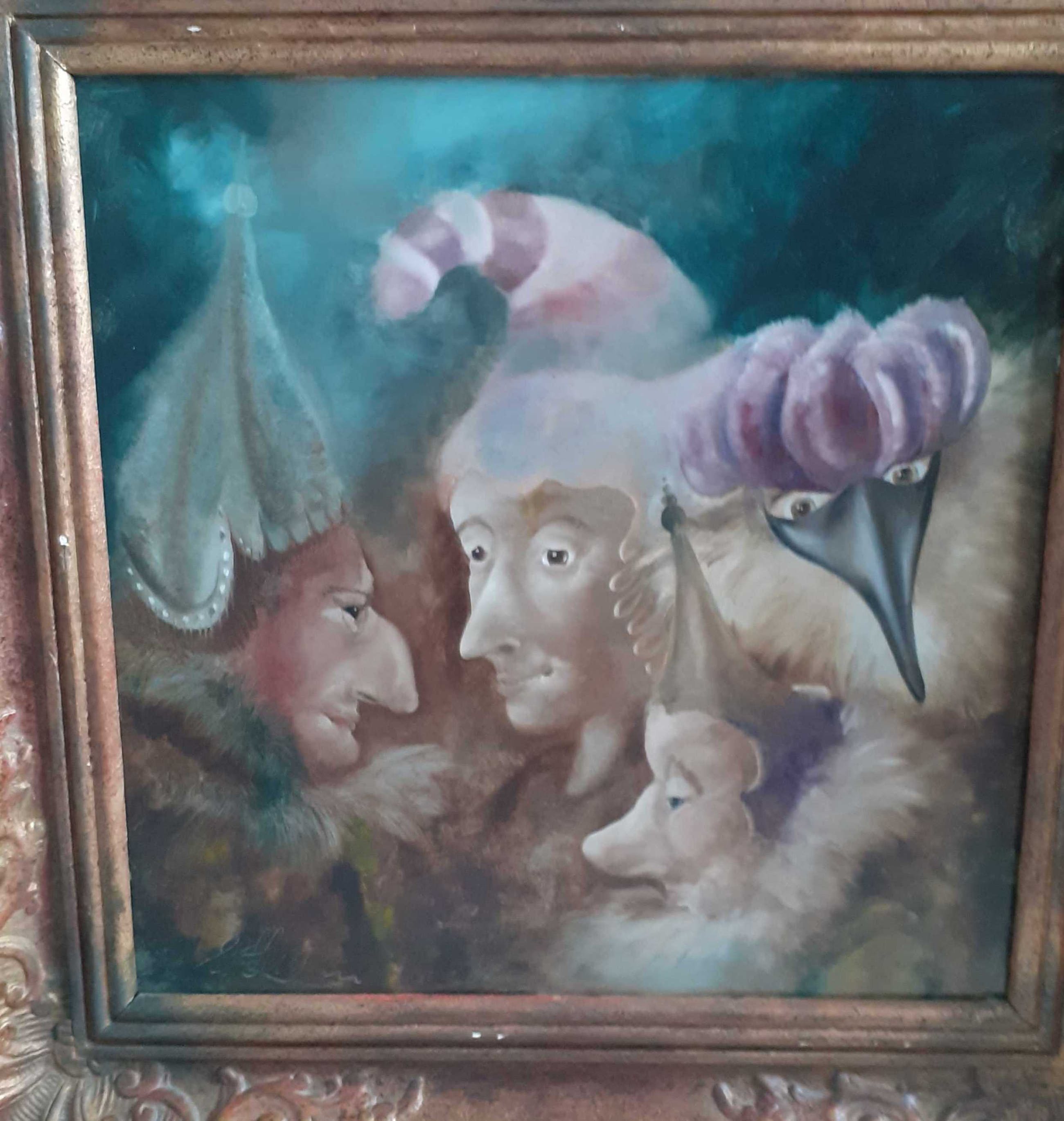 Surrealistisch kunstwerk. Olieverf op houten paneel, afmetingen paneel circa 40 x 40 cm. Rustieke lijst. Gesigneerd linksonder. Ik verkoop dit schilderij inclusief een boek over de kunstenaar, gelimiteerde oplage. Oorsprong van het kunstwerk bekend, verkregen uit familiebezit. Het kunstwerk is rond 1980 rechtstreeks bij de kunstenaar gekocht. Verzendkosten per Swift koerier 50% van tarief (€ 43,50).