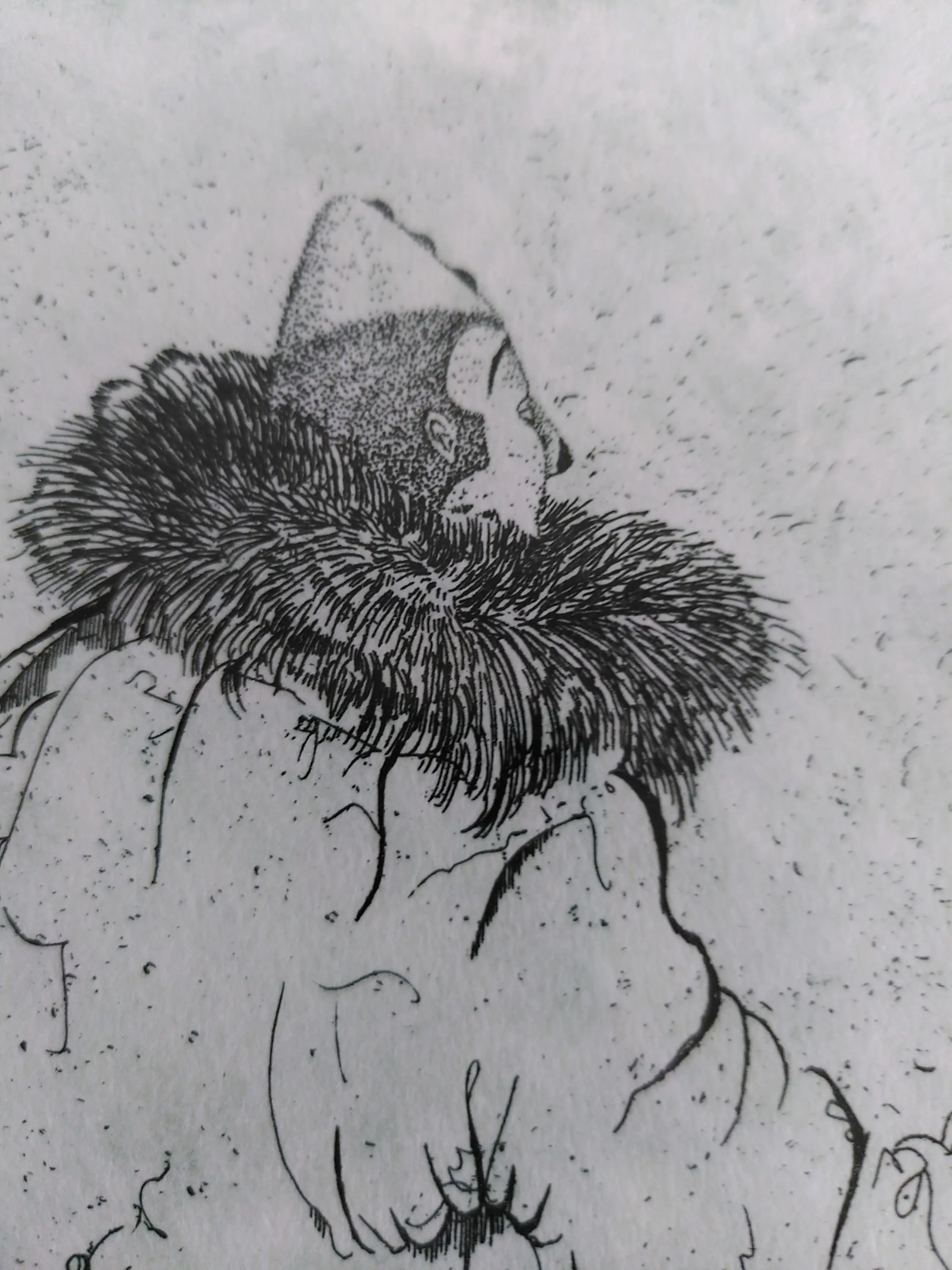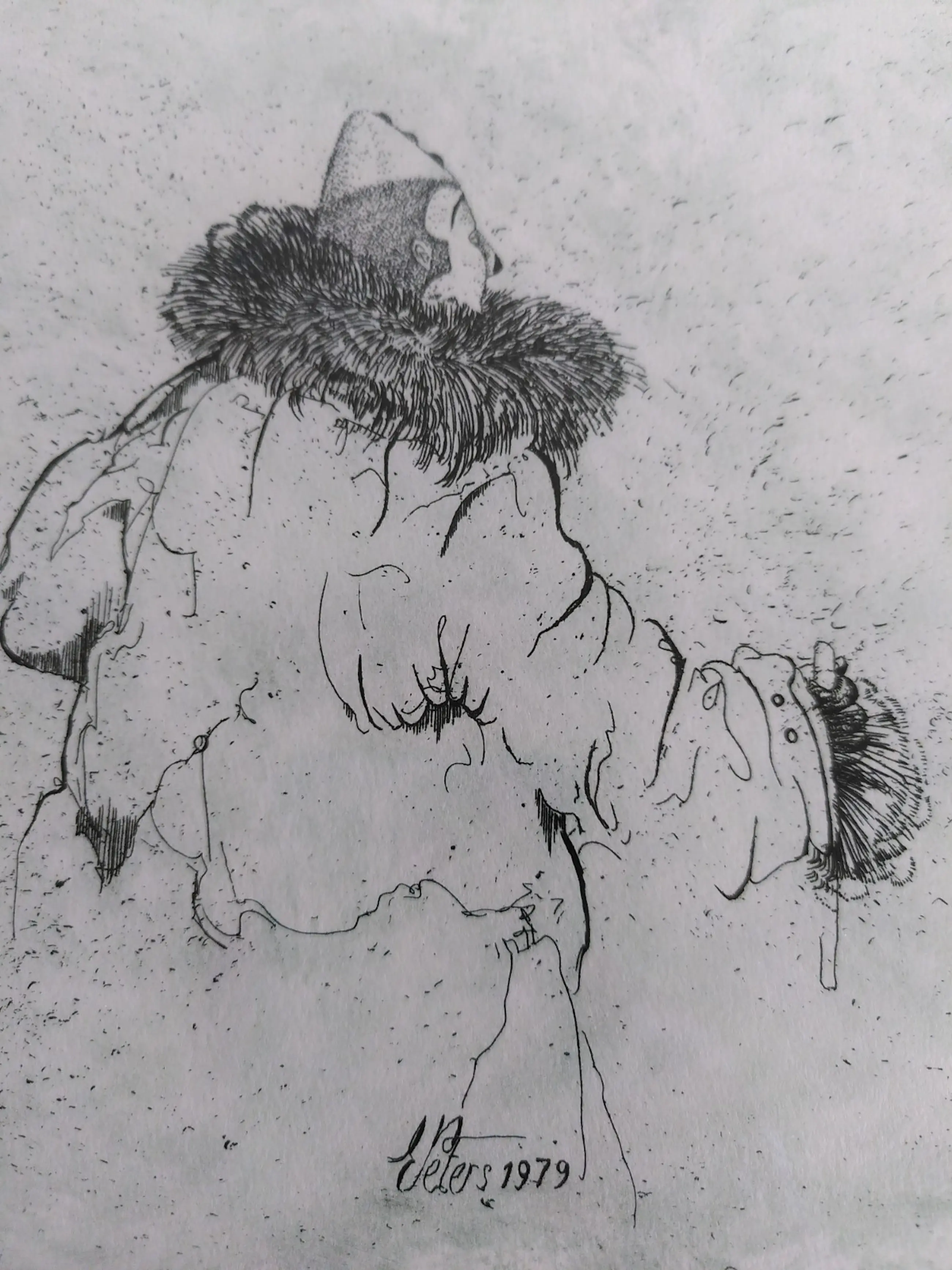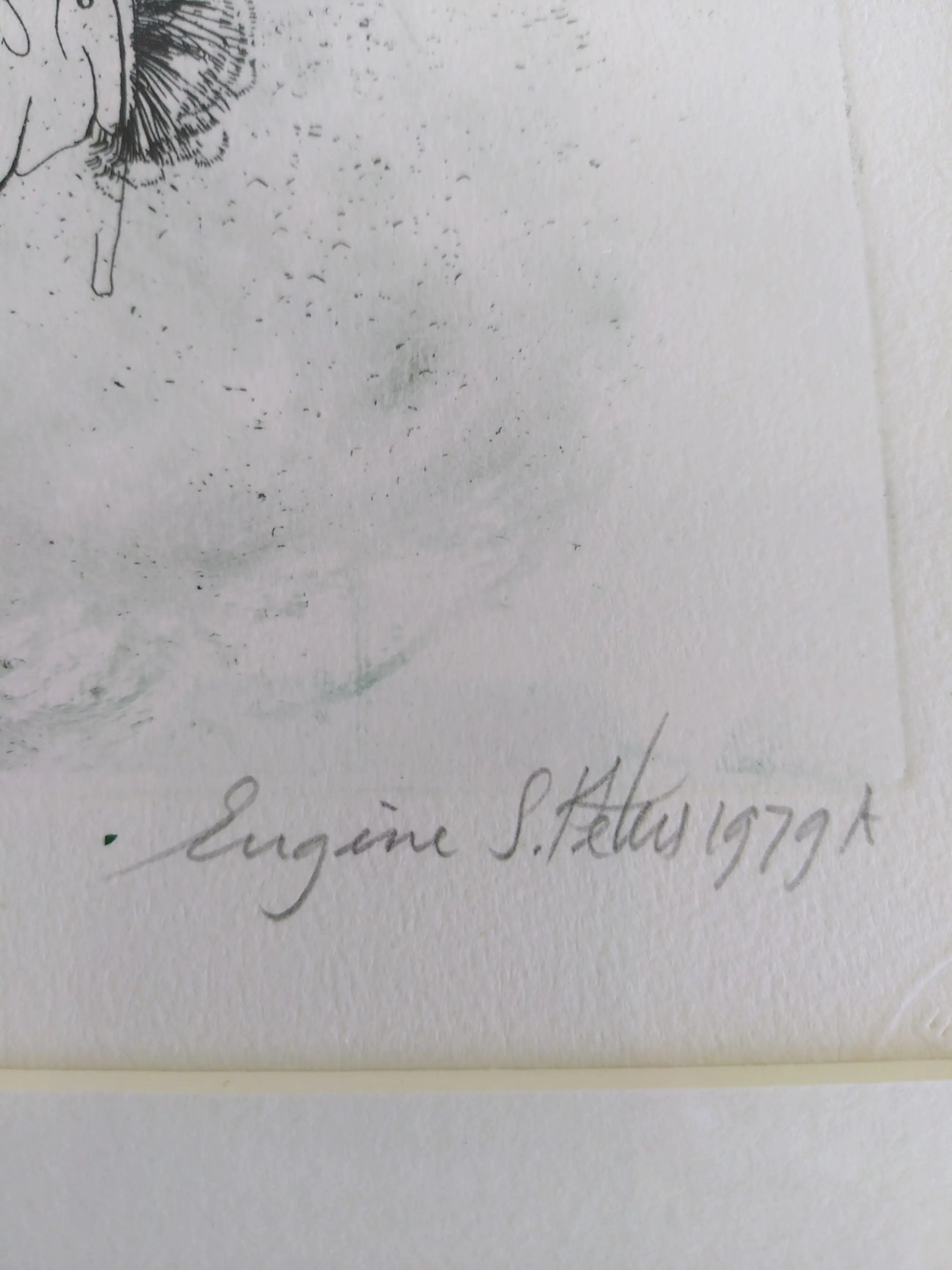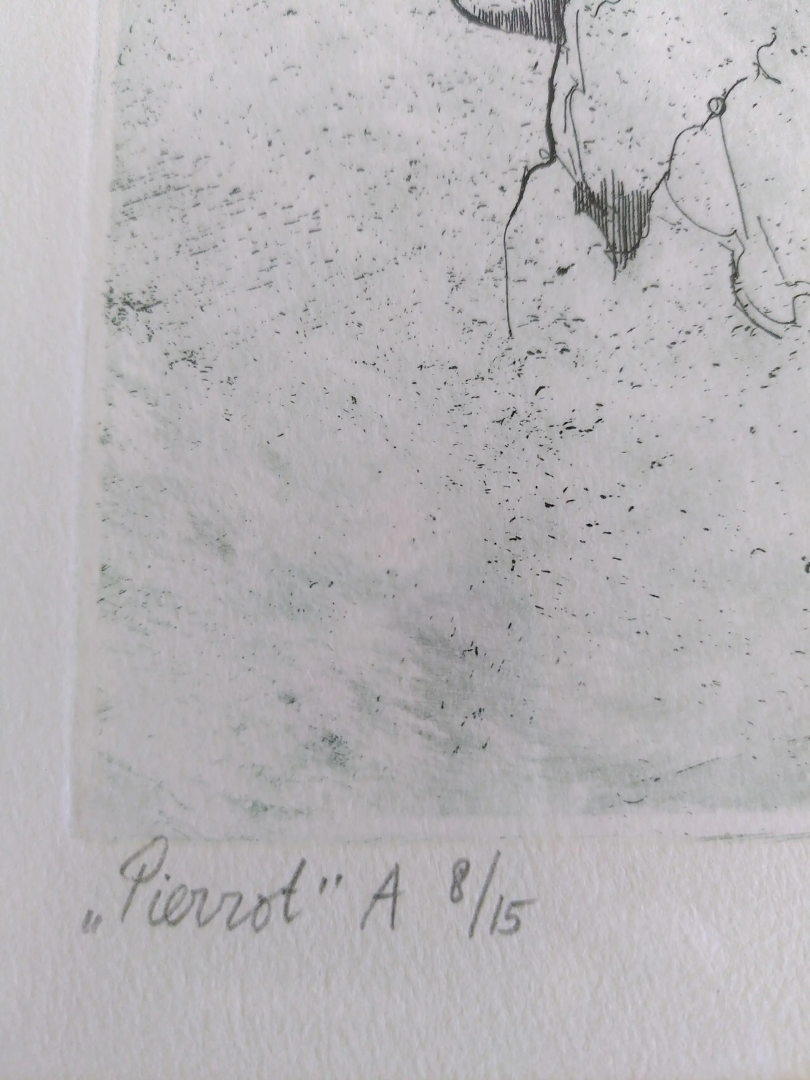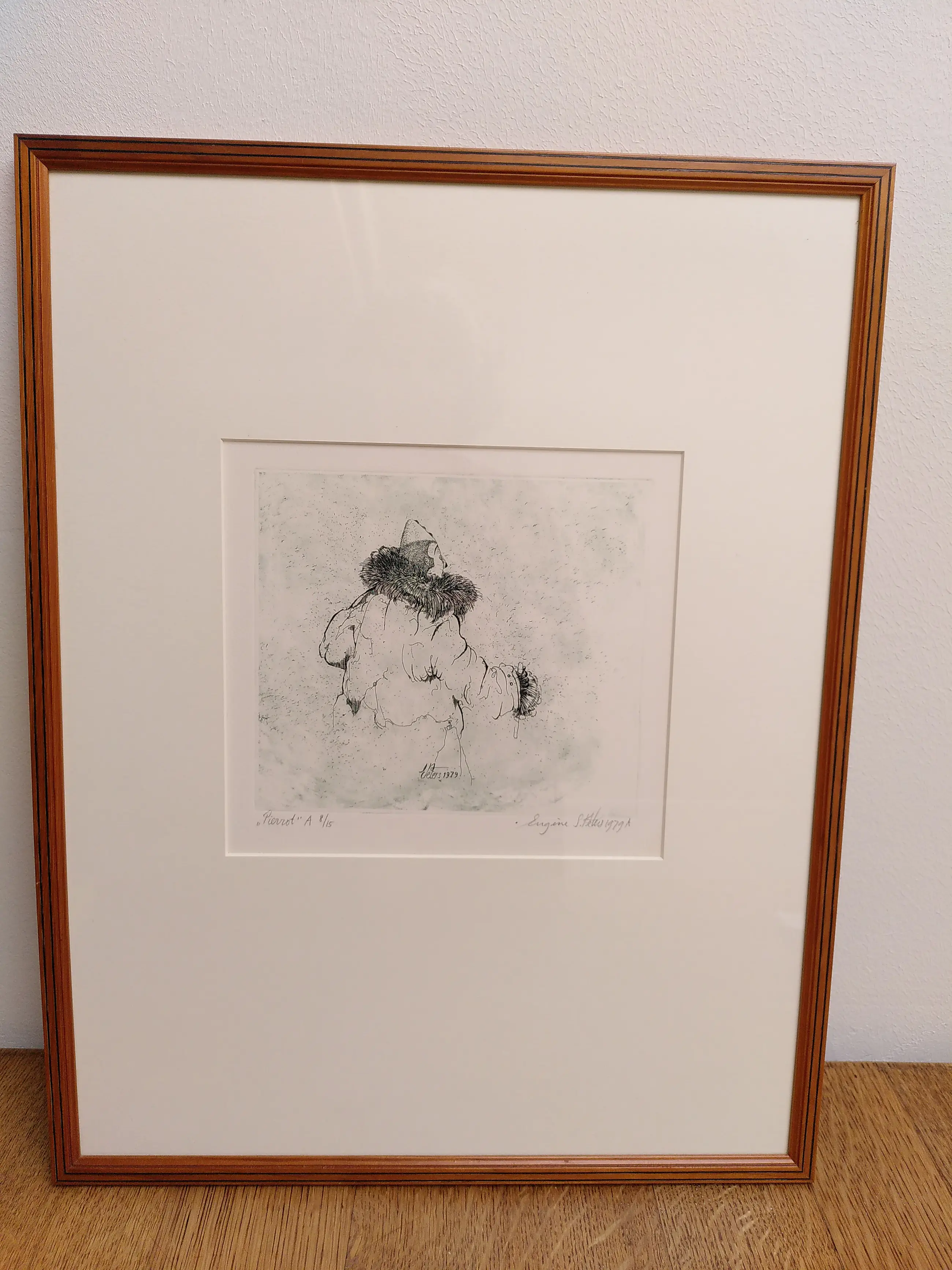 Grafische werk van Eugène Peters uit 1979 met de titel "Pierrot" A. Ingelijst met glas in uitstekende staat.