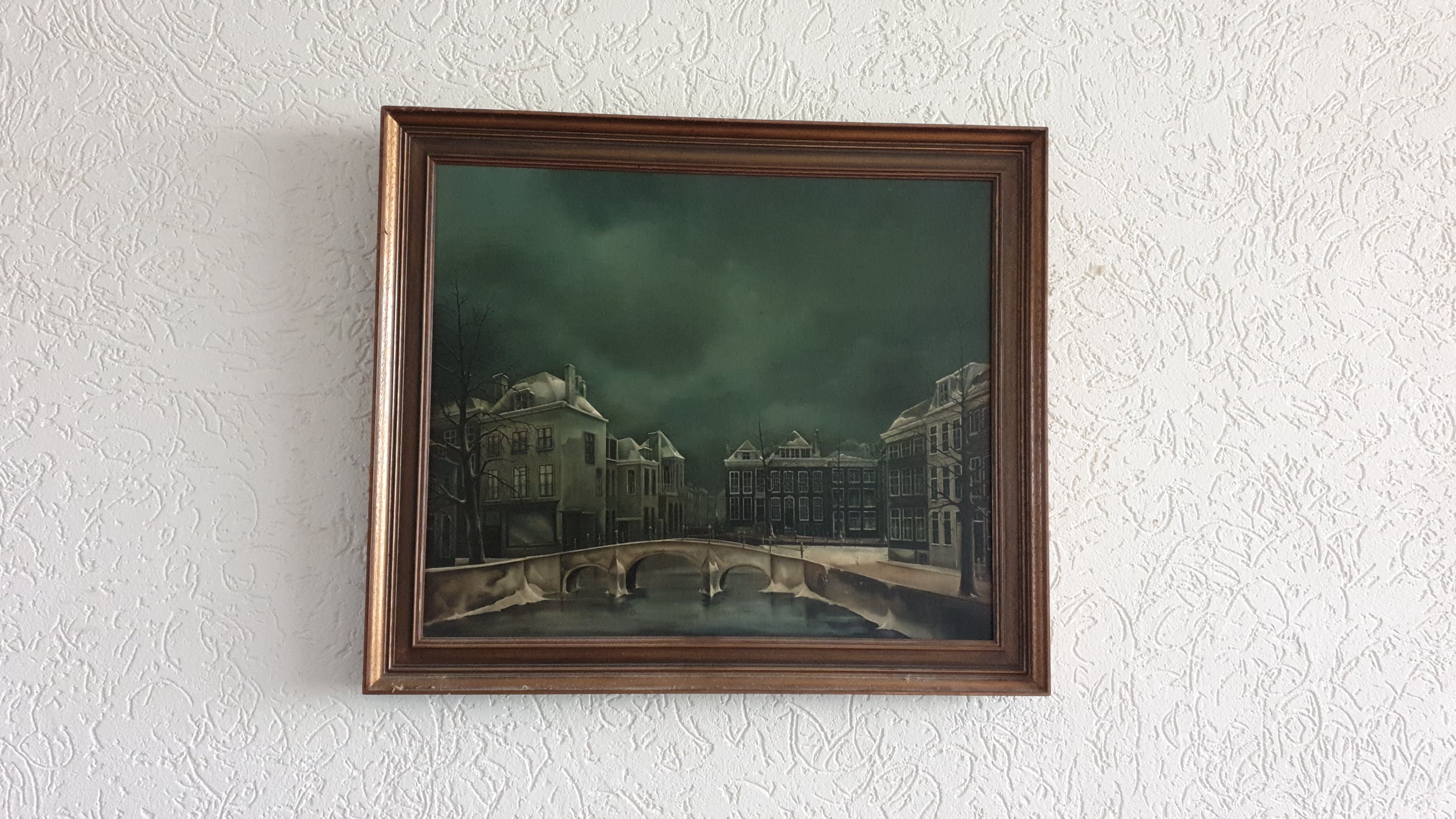Het schilderij is in opdracht voor mijn moeder geschilderd ivm het slaan van een eerste paal voor een bouwproject in Den Haag. Eugene heeft gekozen voor een winterbeeld zodat de huizen goed te zien zijn door de bomen. Aandacht voor details zelfs de scheuren in het ijs zijn geschilderd!