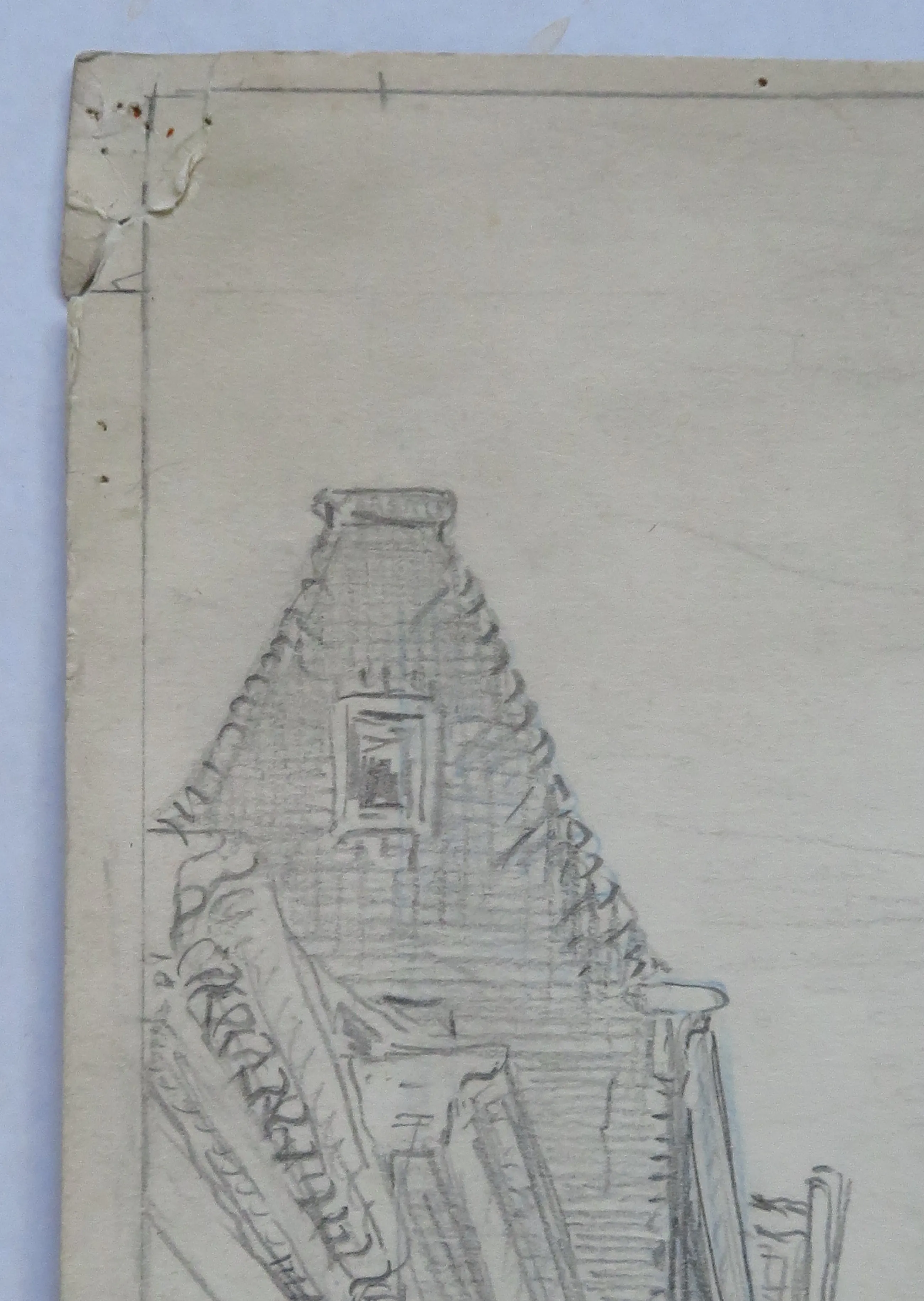 Er zit in de linker bovenhoek een scheurtje.Alle hoeken hebben gaatjes van punaises.