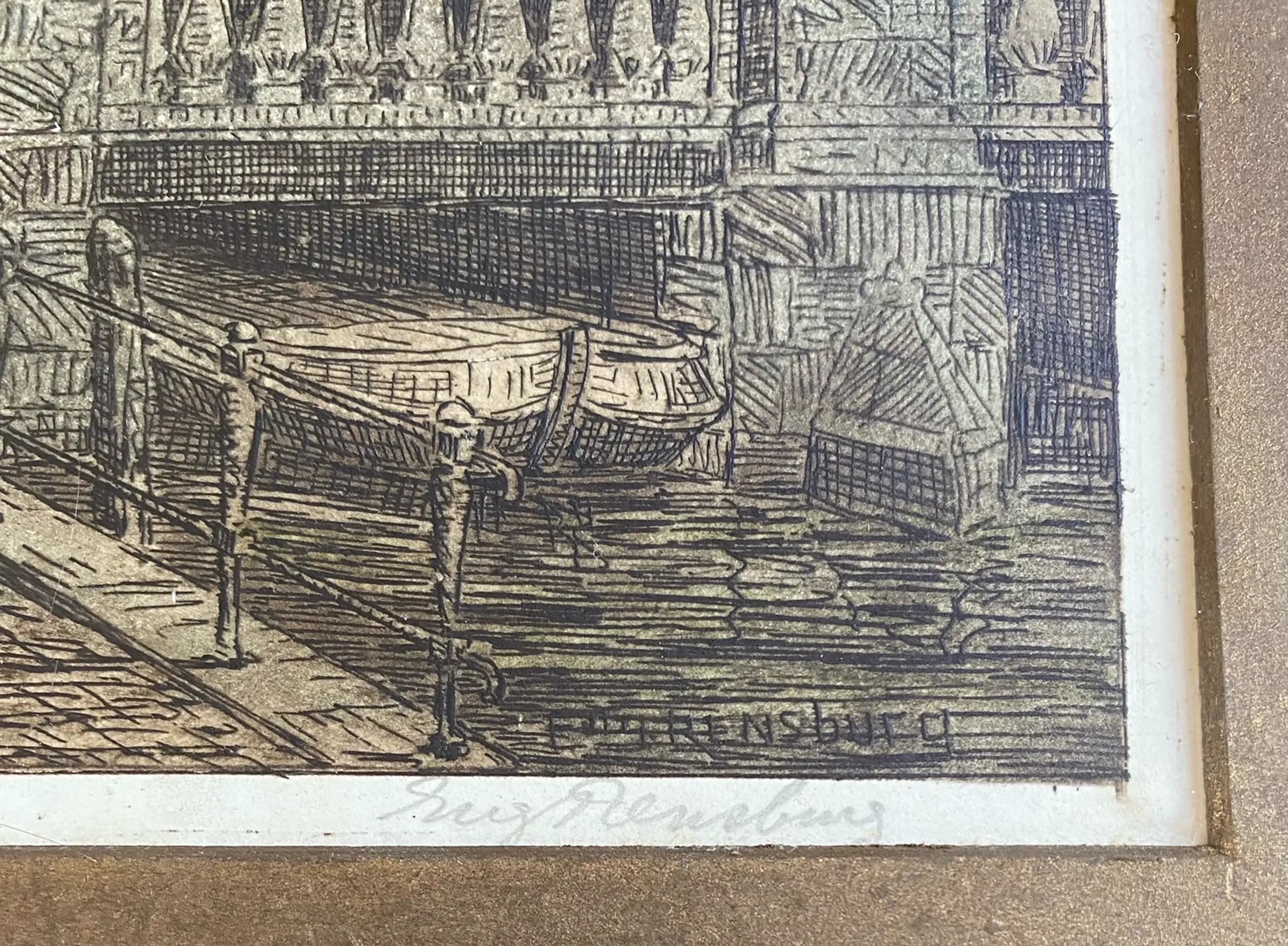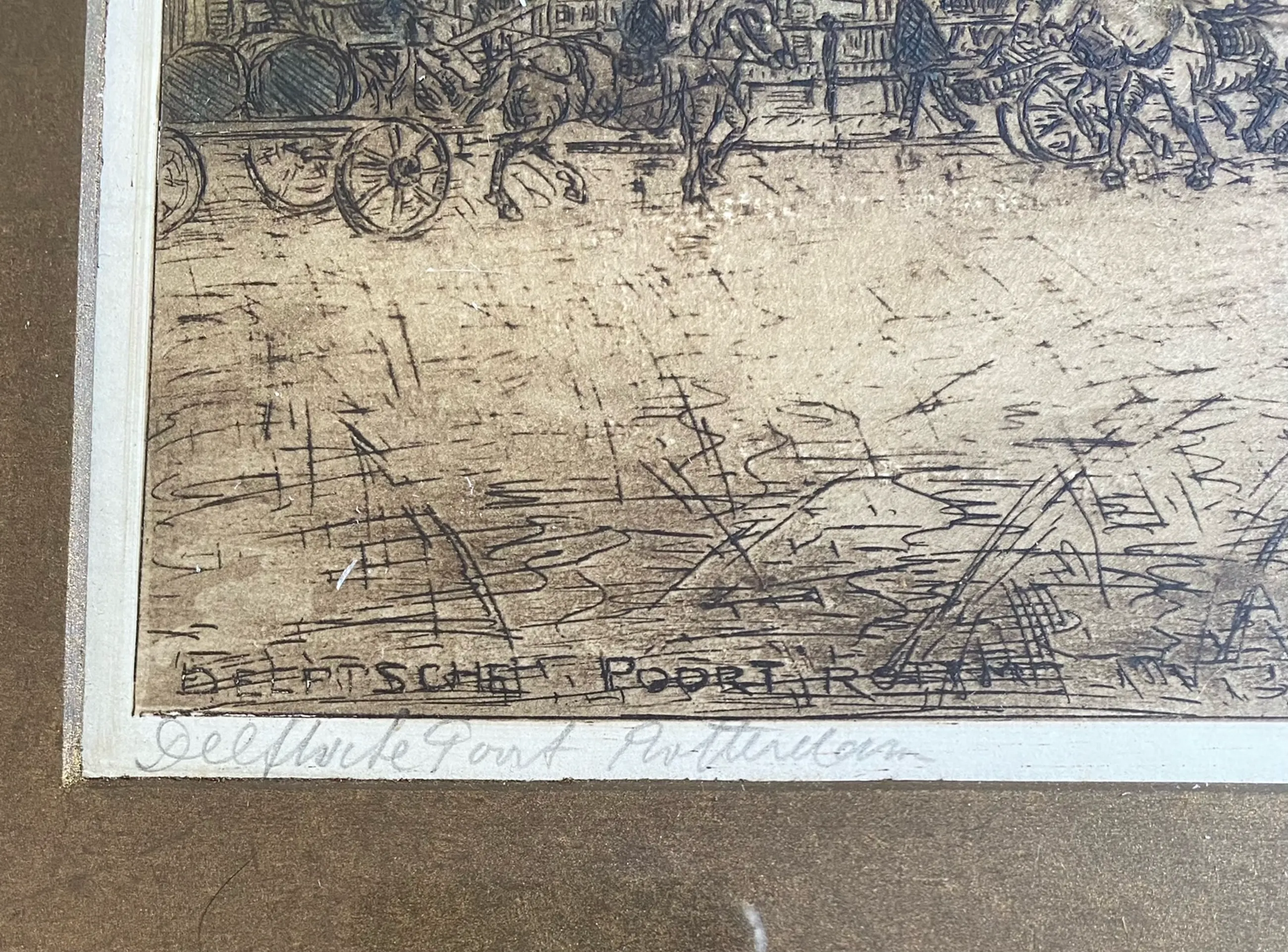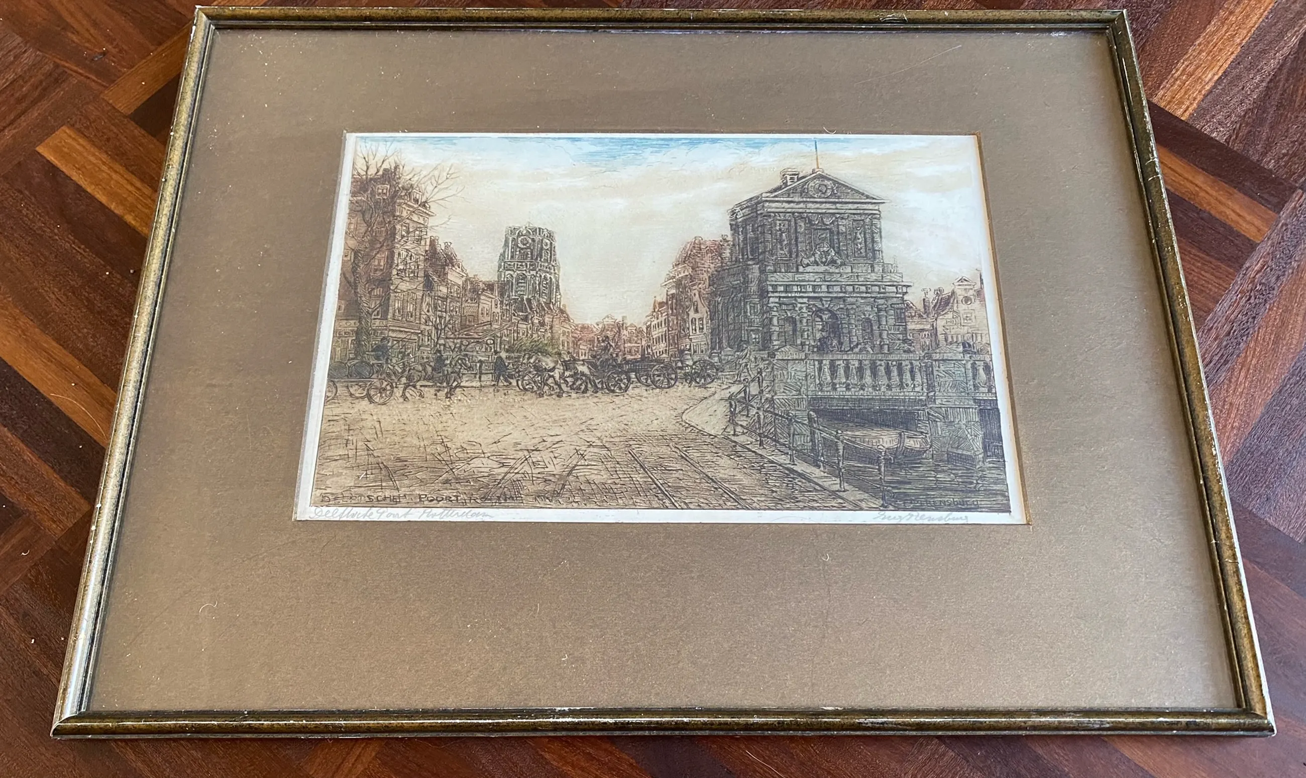 Mooi, kleurrijke ets van Eugene Rensburg. Delftsche Poort in Rotterdam. Eerste kwart 20e eeuw. Gesigneerd en ingelijst. Zie foto's.
