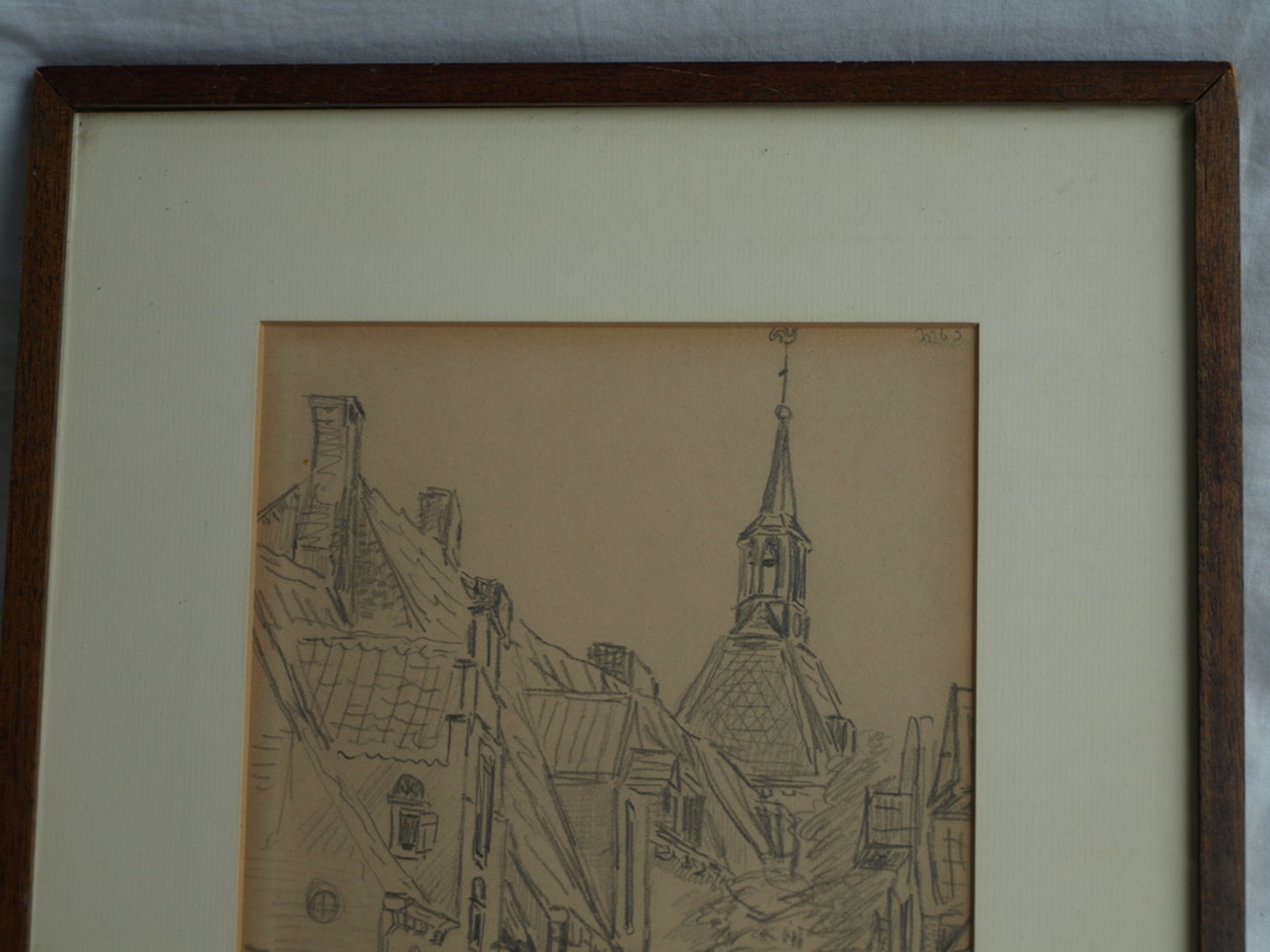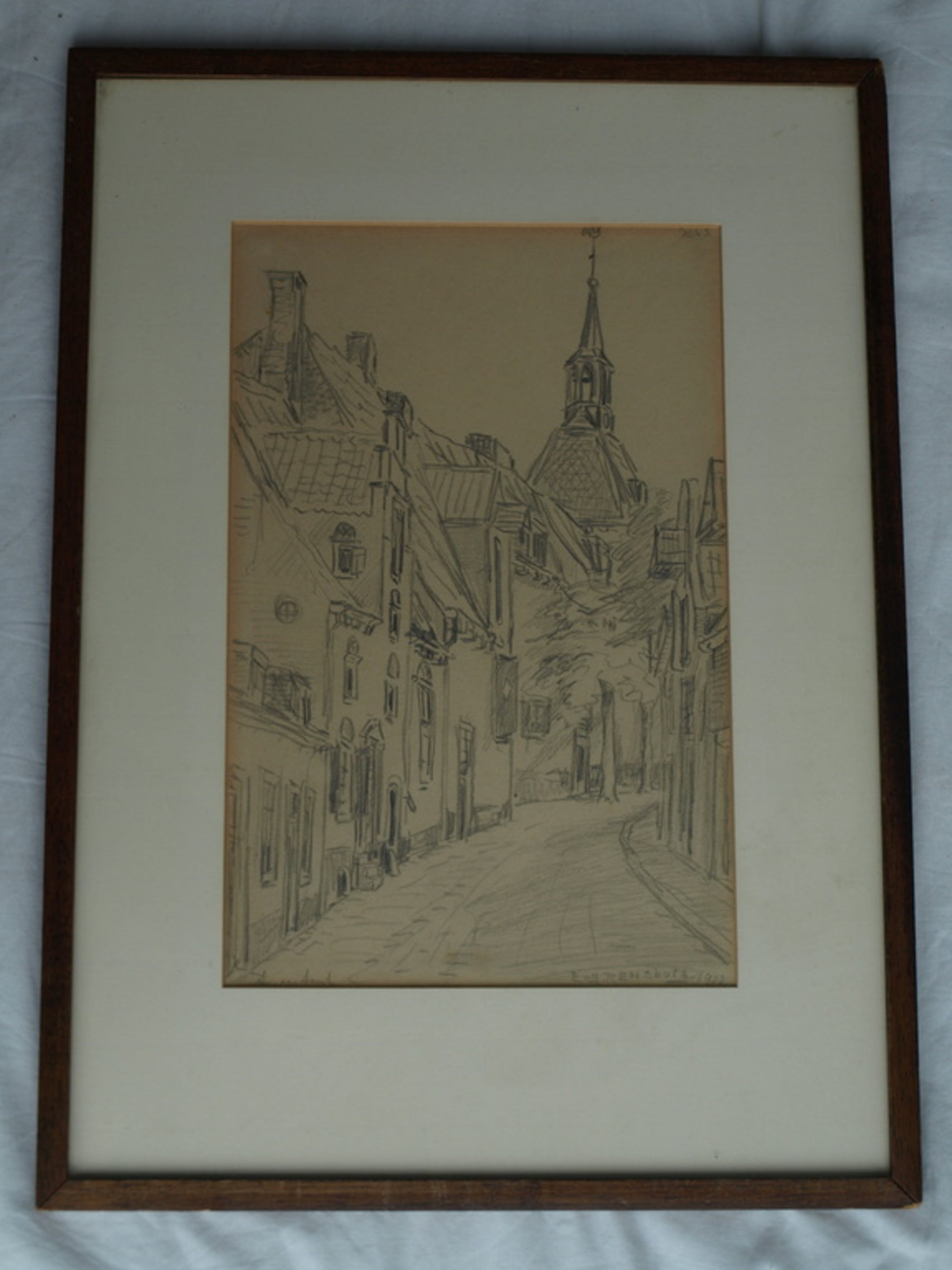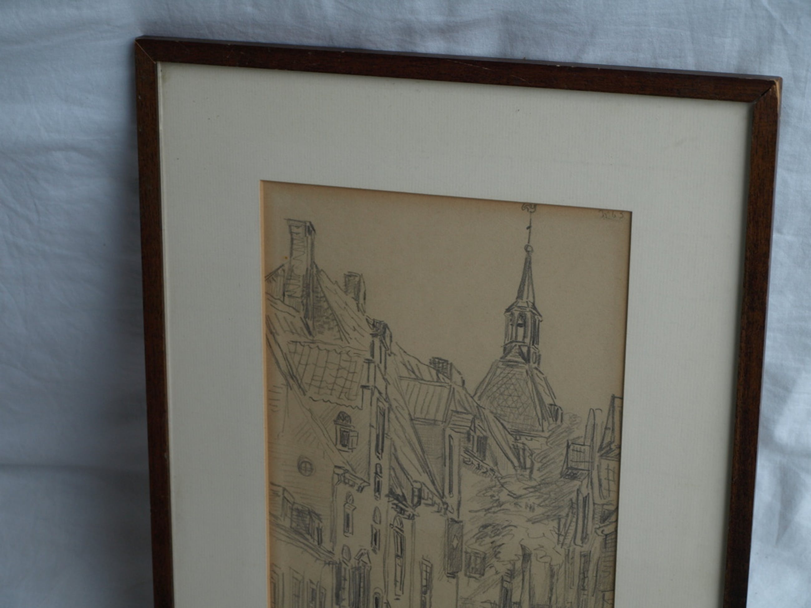 Conditie: Het papier van de tekening is wat ‘vergeeld’. De lijst heeft slijtplekjes.