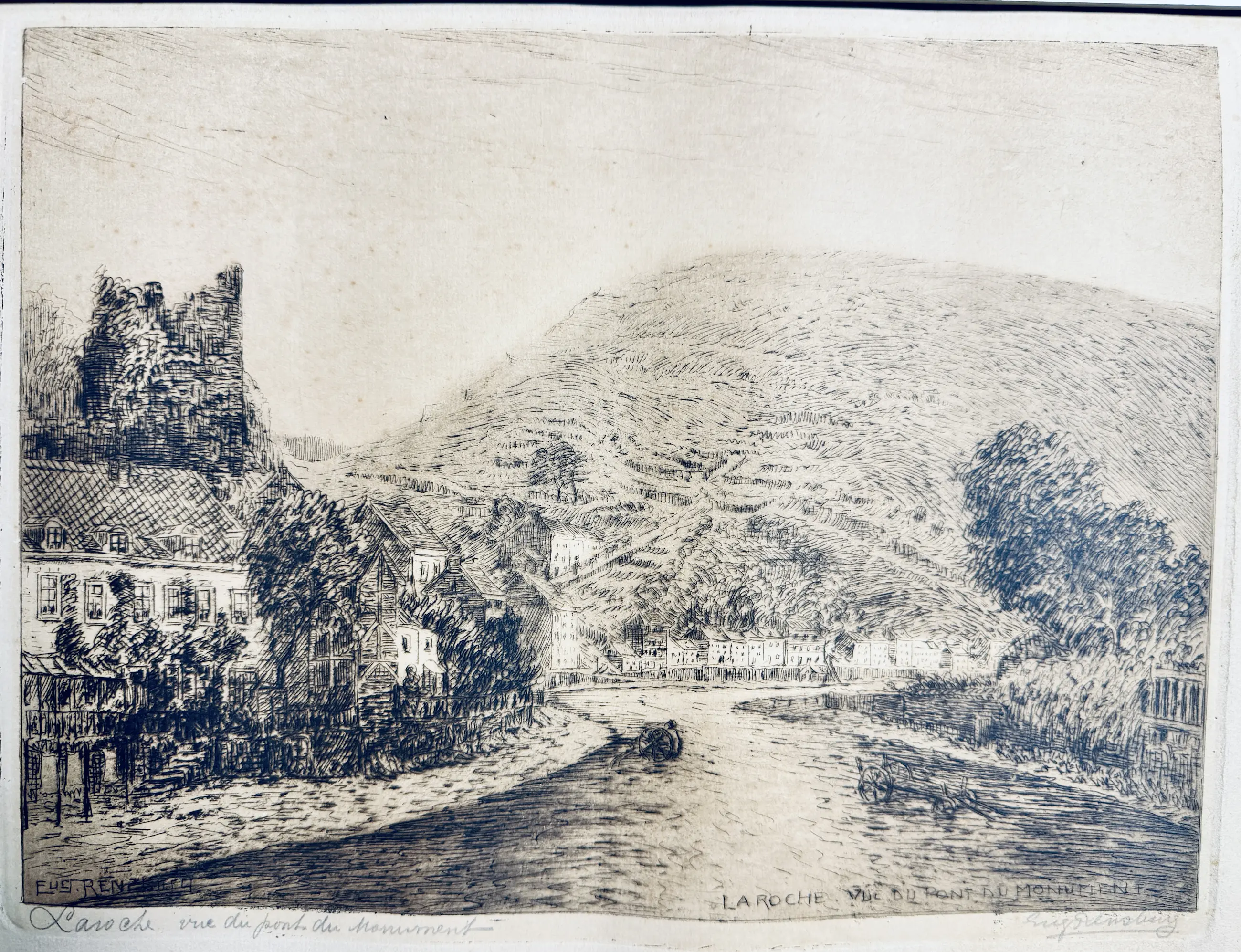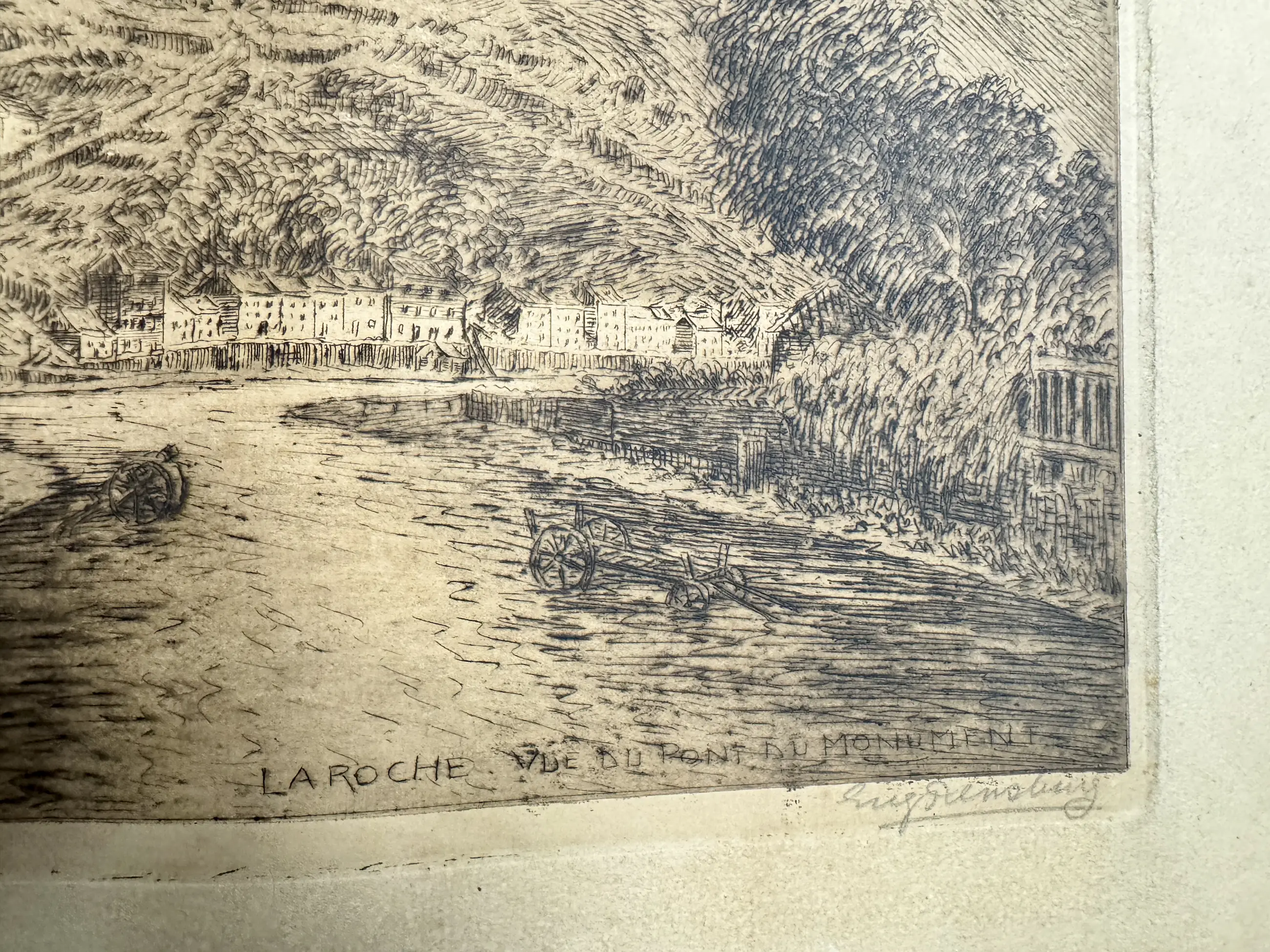 Sfeervolle, fijn uitgewerkte ets met zicht op Laroche (La Roche-en-Ardenne, België), getiteld “Vue du Pont du Monument”. De voorstelling toont een rivierlandschap met brug en bebouwing langs de oever, tegen een heuvelachtig decor. Links zijn huizen met karakteristieke gevels zichtbaar; op de achtergrond rijst het Ardense landschap op met subtiele arceringen die diepte en atmosfeer creëren.