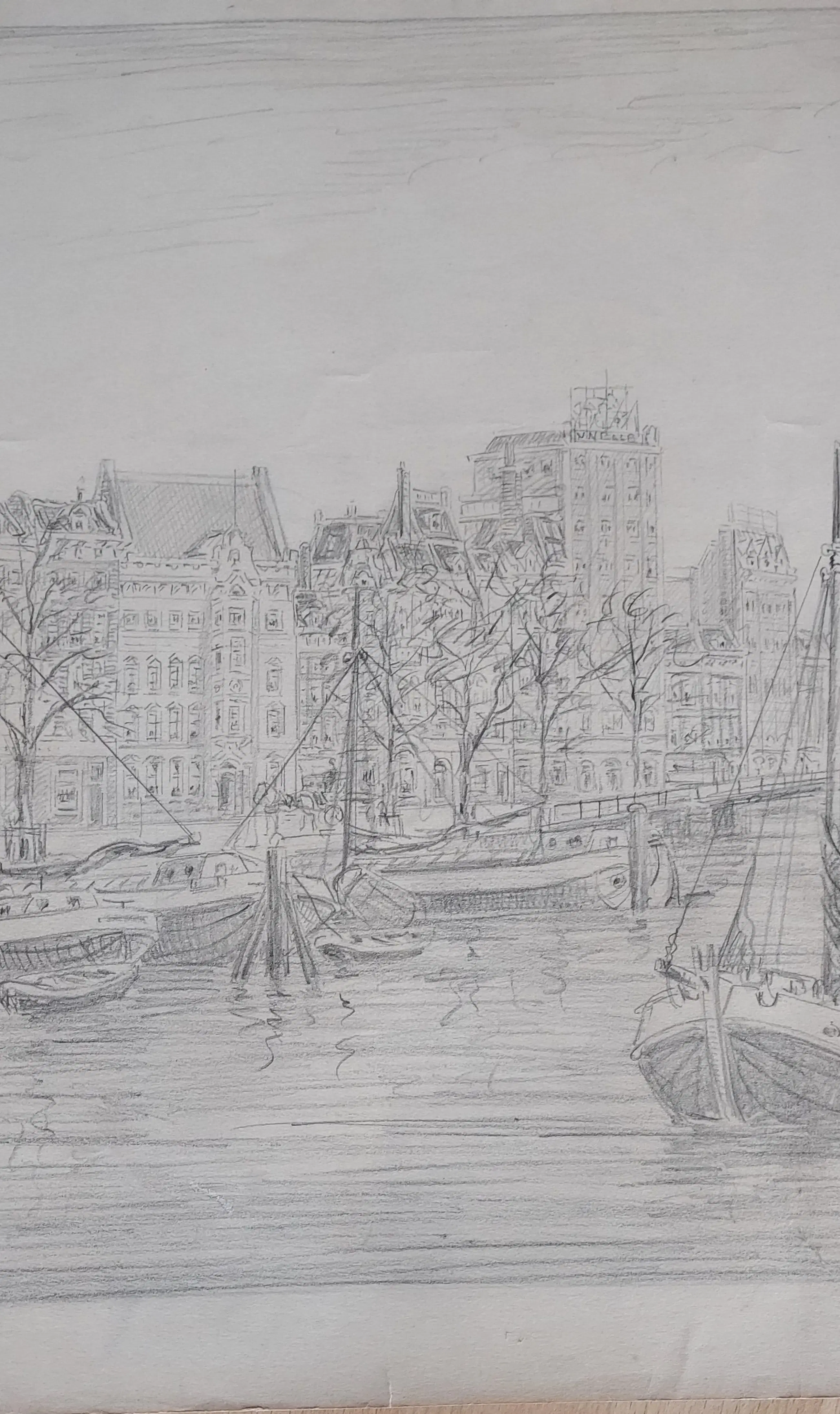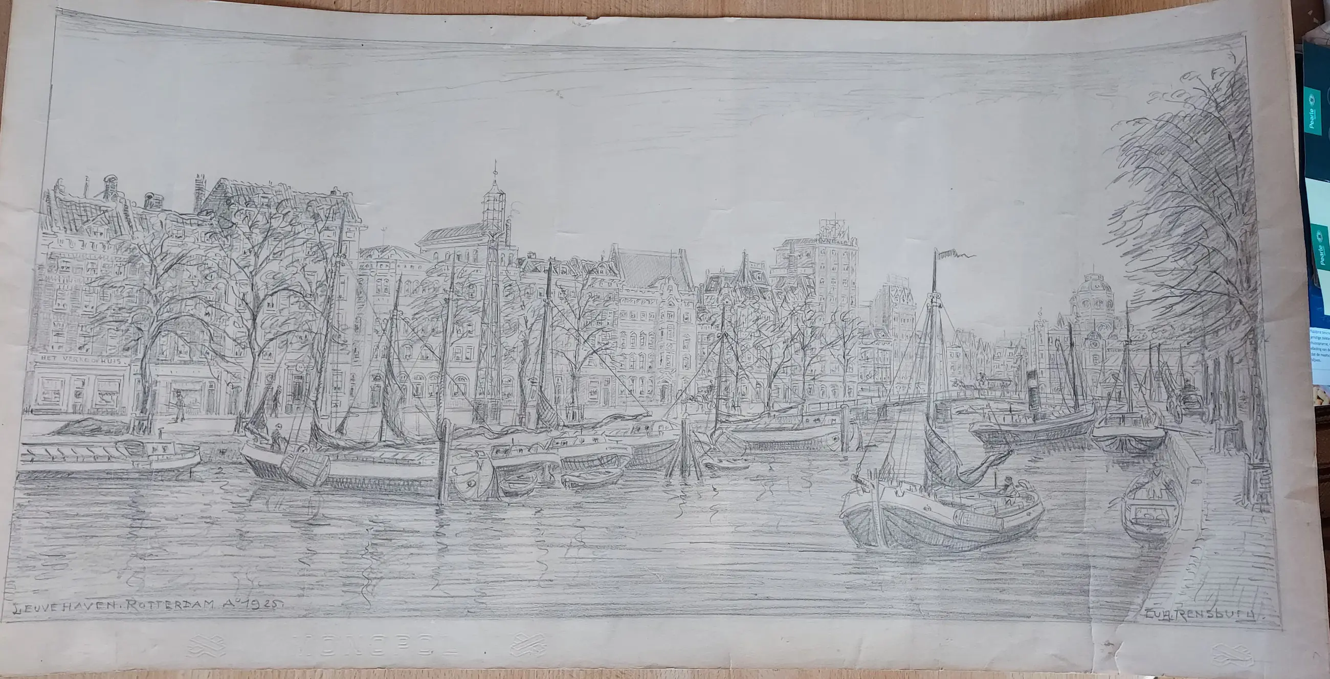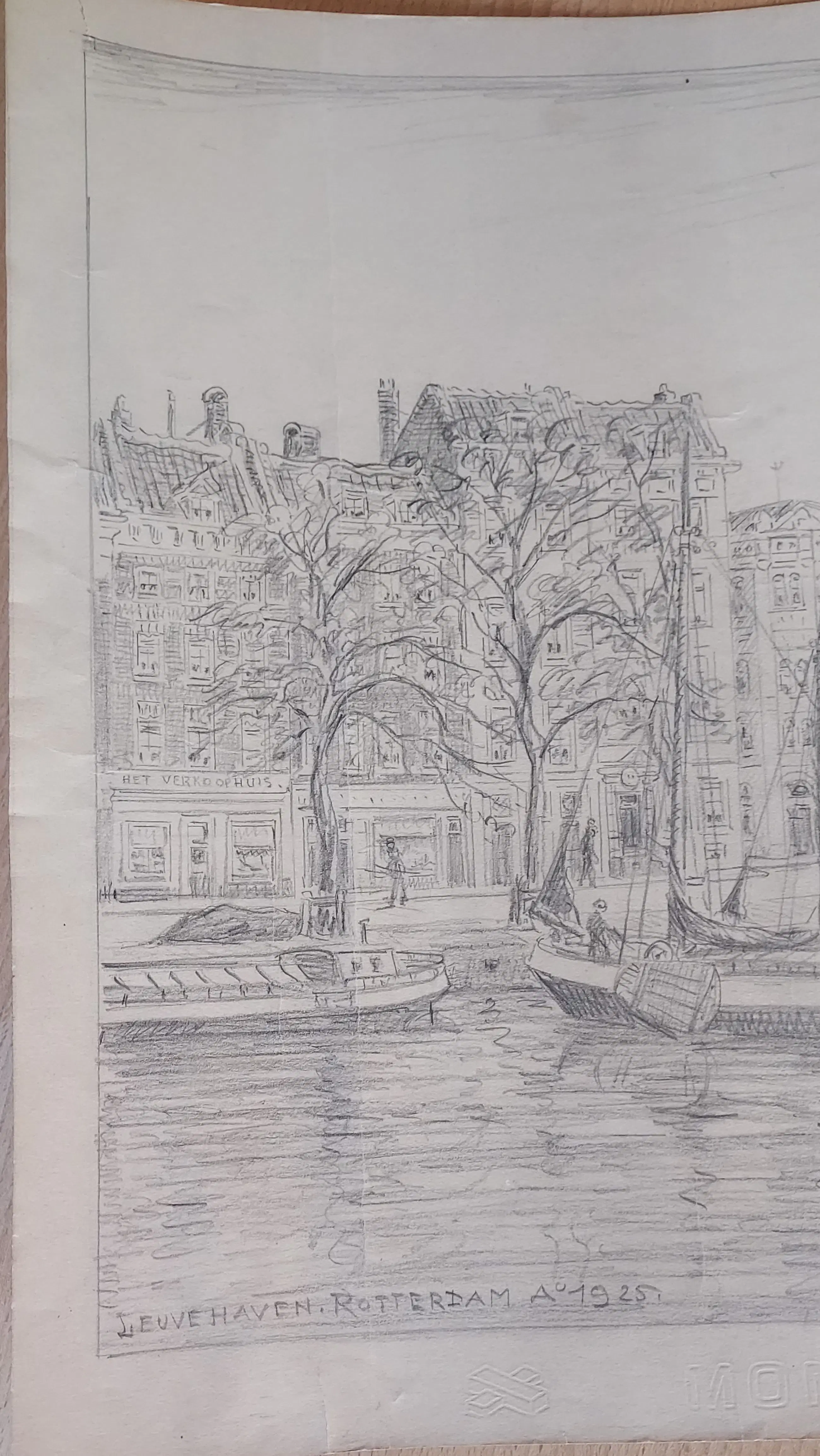 Gedetailleerde Potloodtekening door eug. Rensburg Leuvehaven Rotterdam 1925
