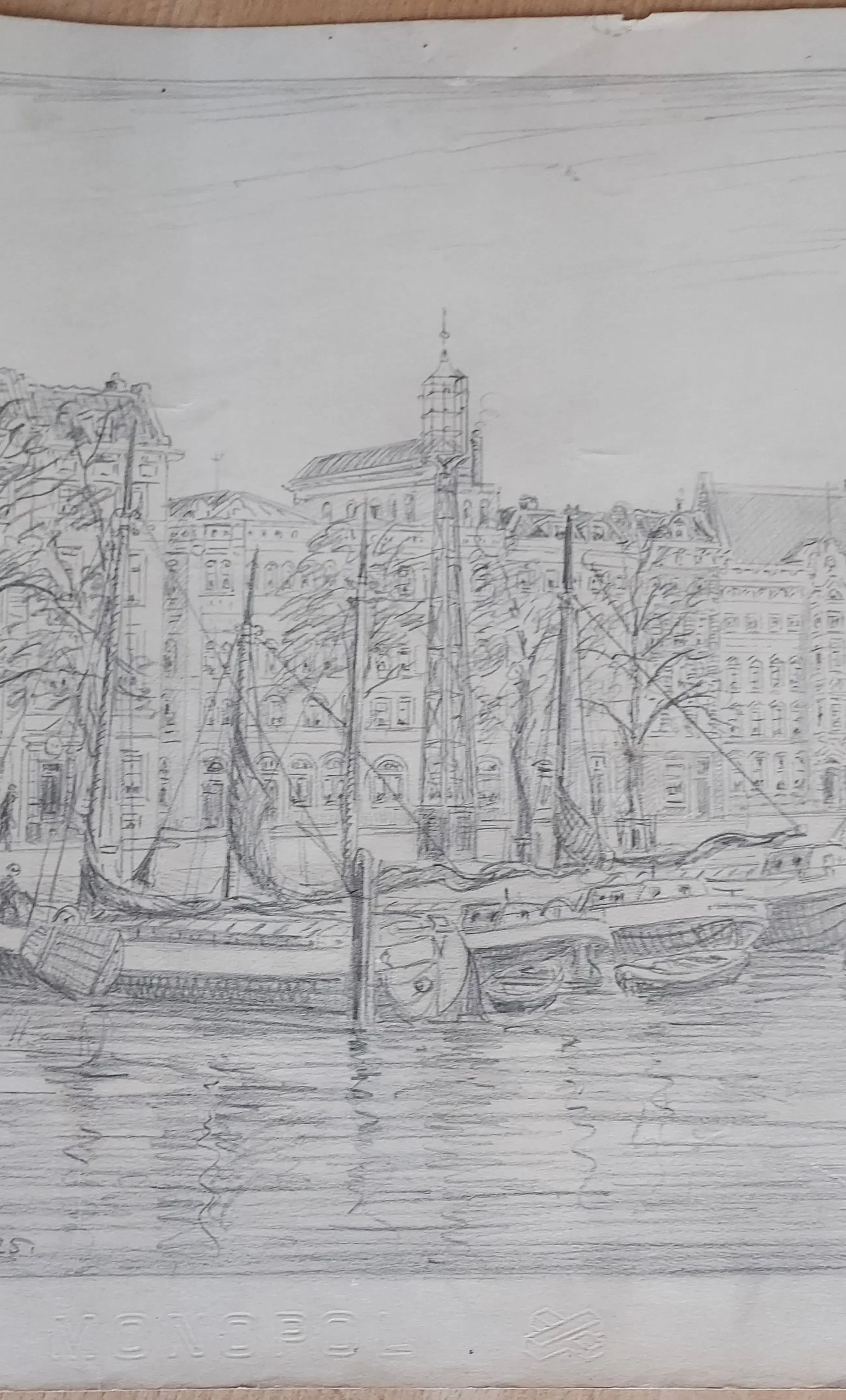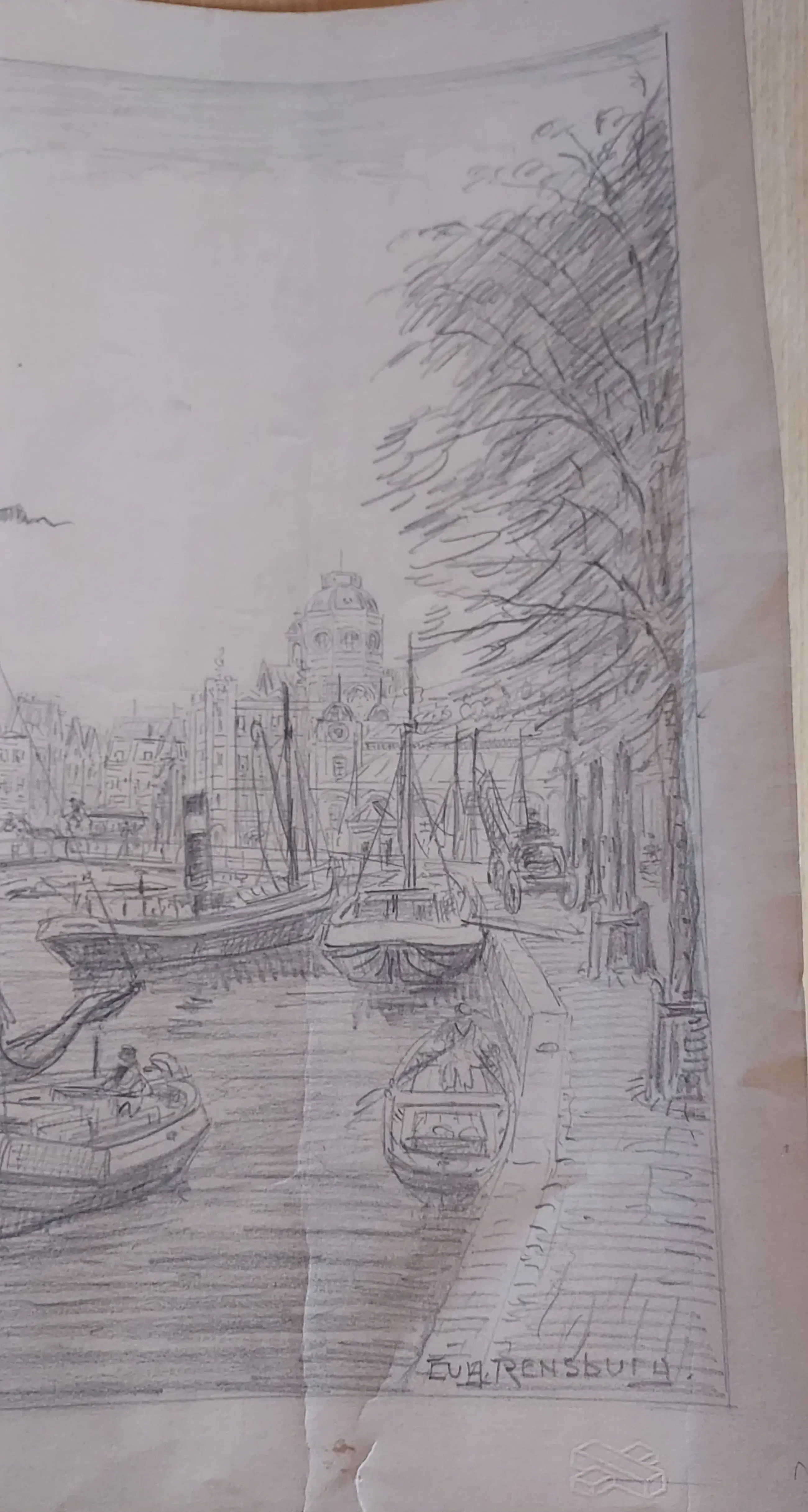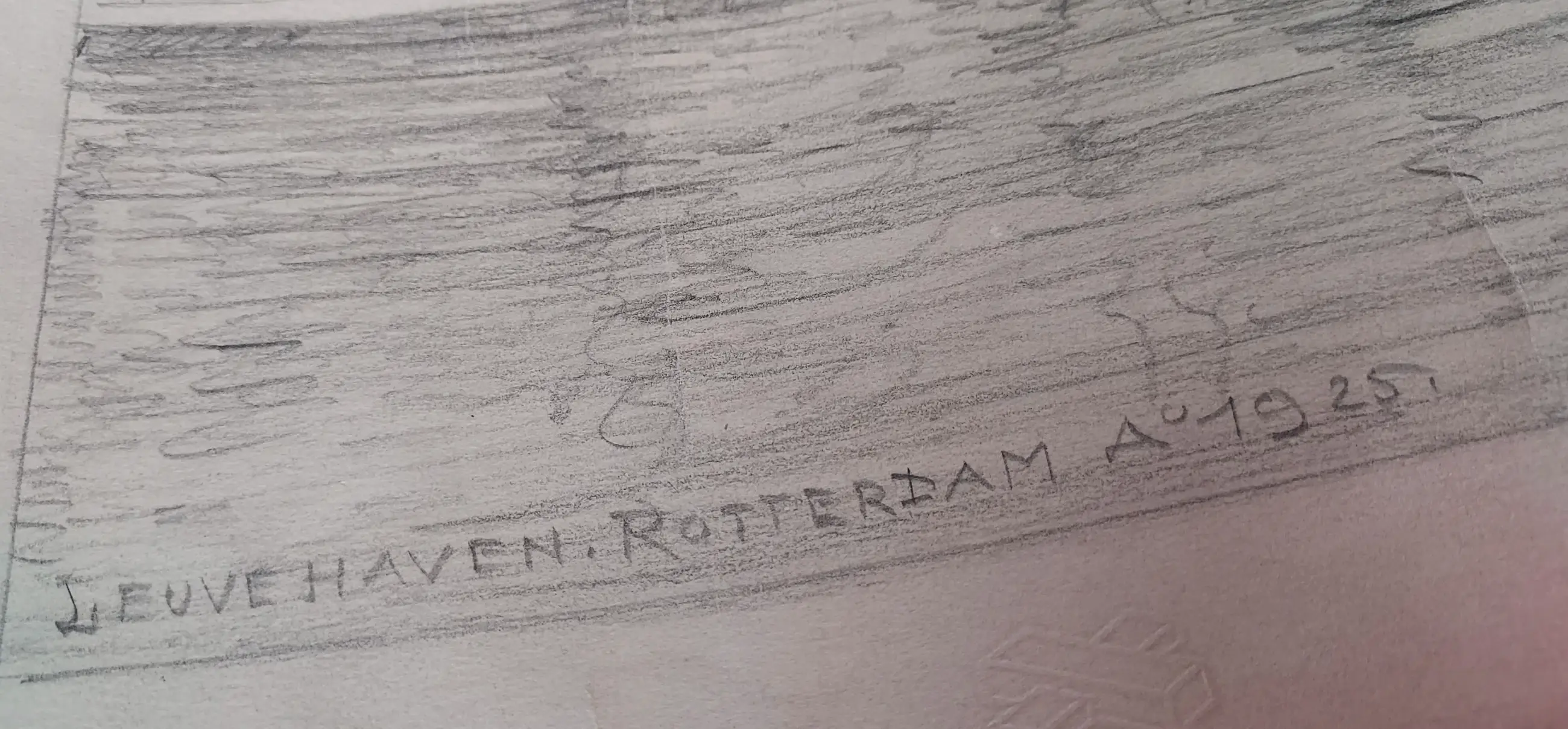 Gedetailleerde Potloodtekening door eug. Rensburg Leuvehaven Rotterdam 1925
