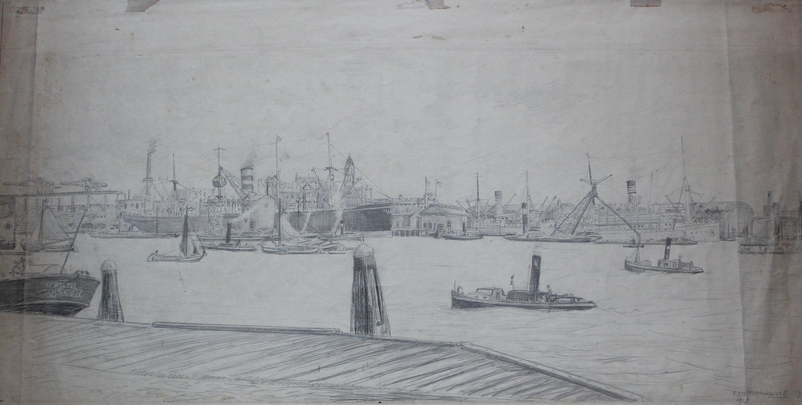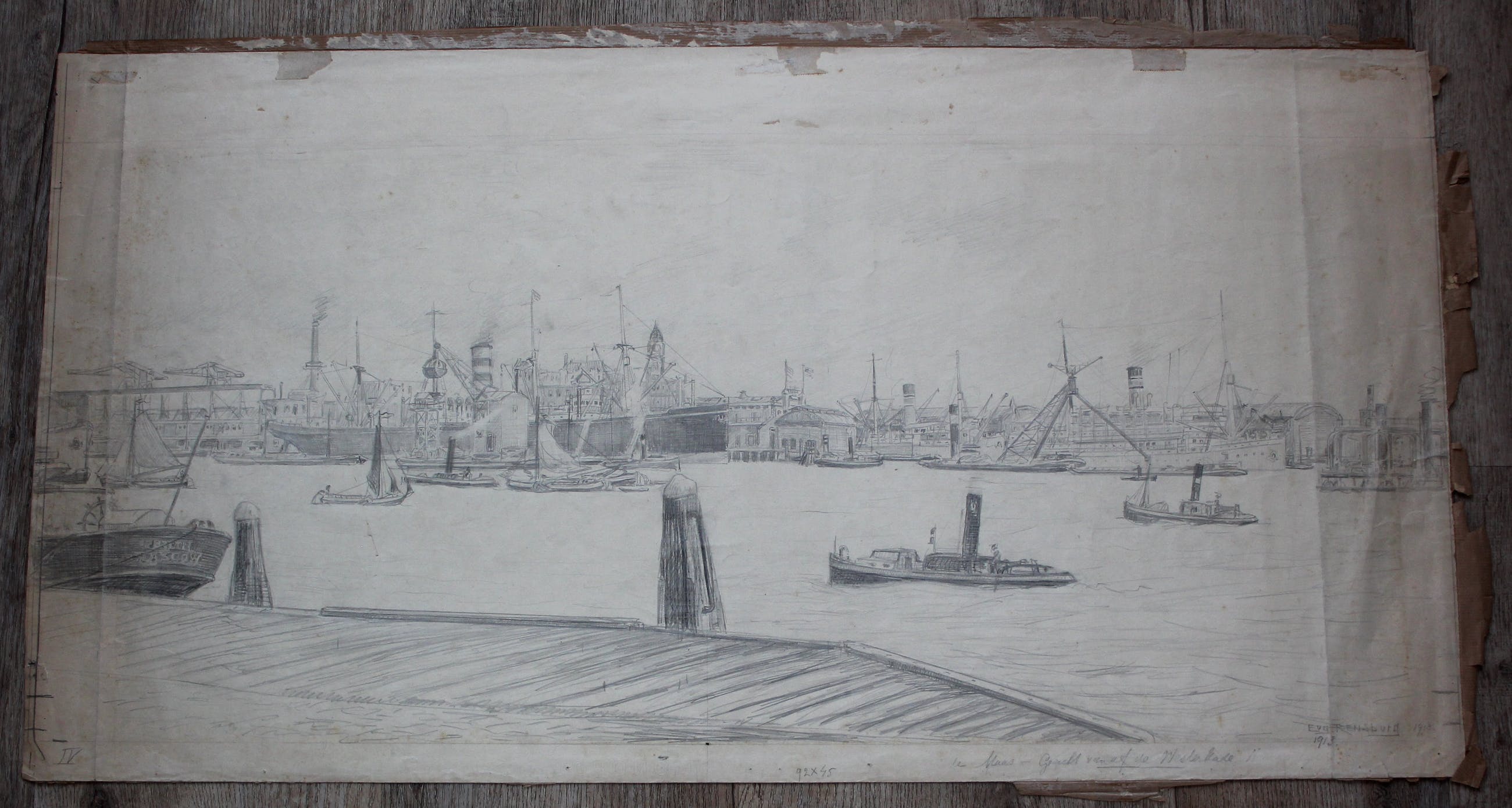 Potlood tekening van Eugene Rensburg. Titel: de Maas - gracht vanaf de Westerkade. Jaar: 1913. Afmetingen blad: H51 x b93cm. Het werk is rechts onderin gesigneerd door de kunstenaar. De authenticiteit van het aangeboden werk wordt volledig gegarandeerd. Een certificaat van echtheid kan, op aanvraag, worden gemaild.