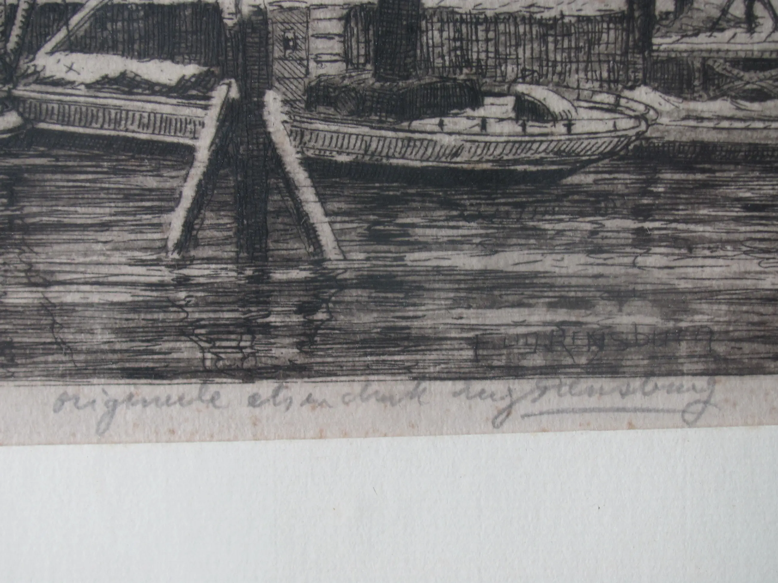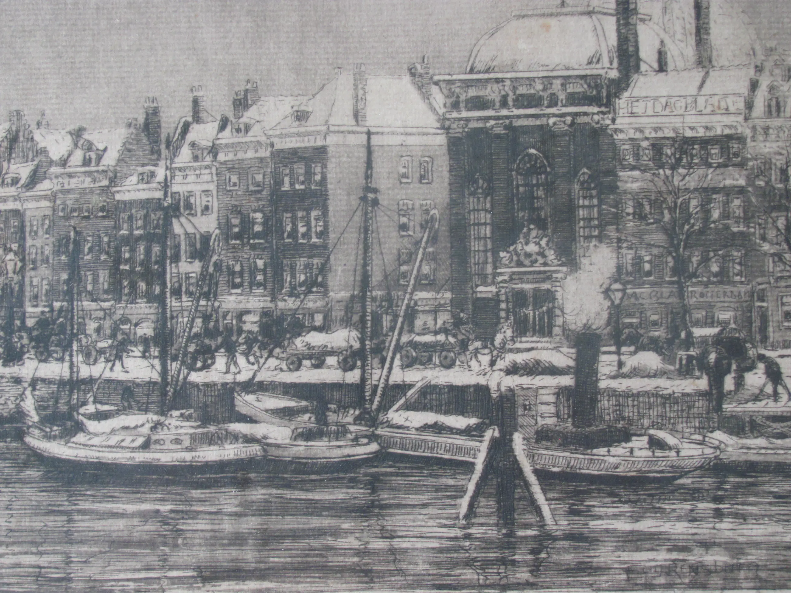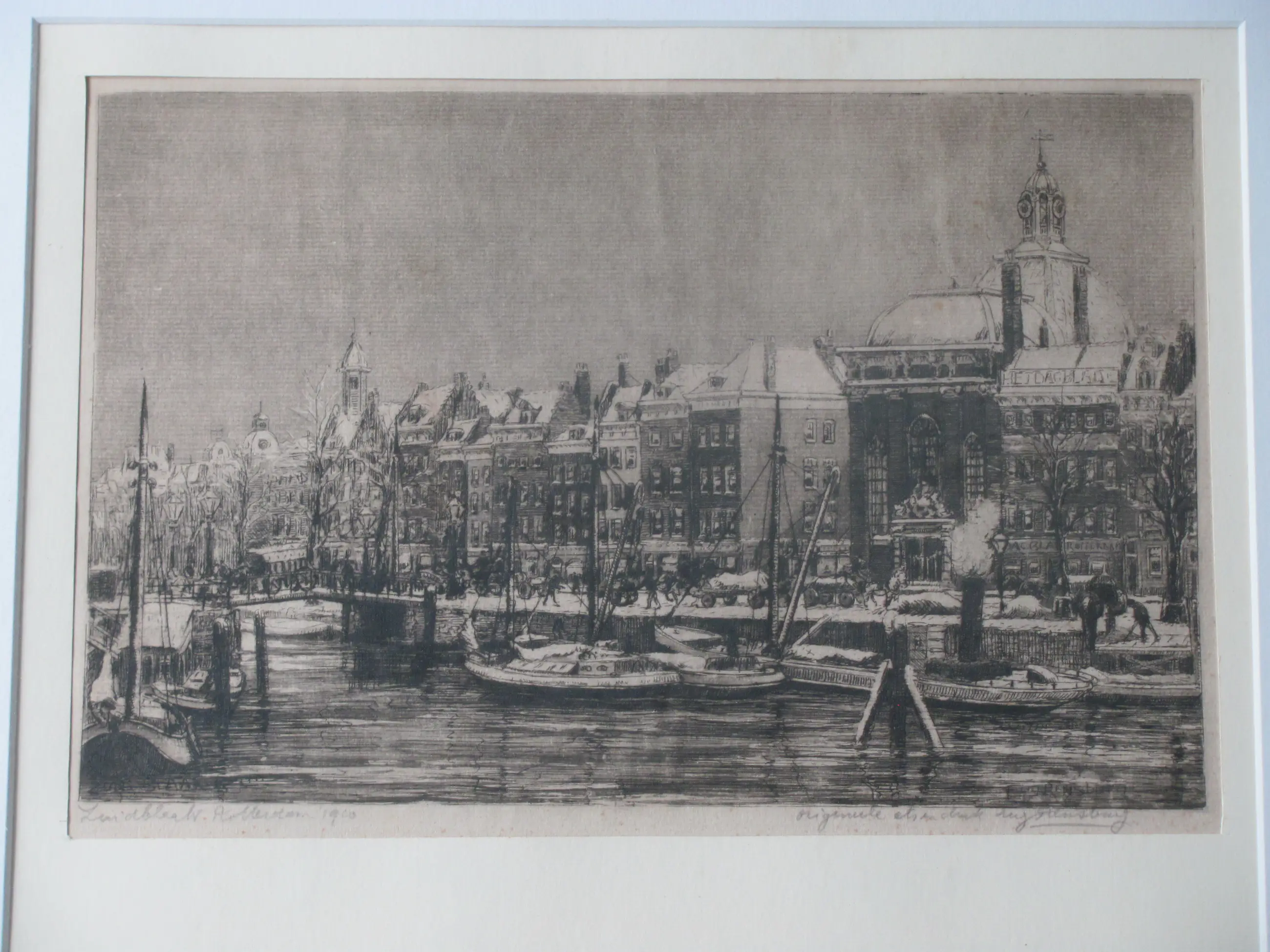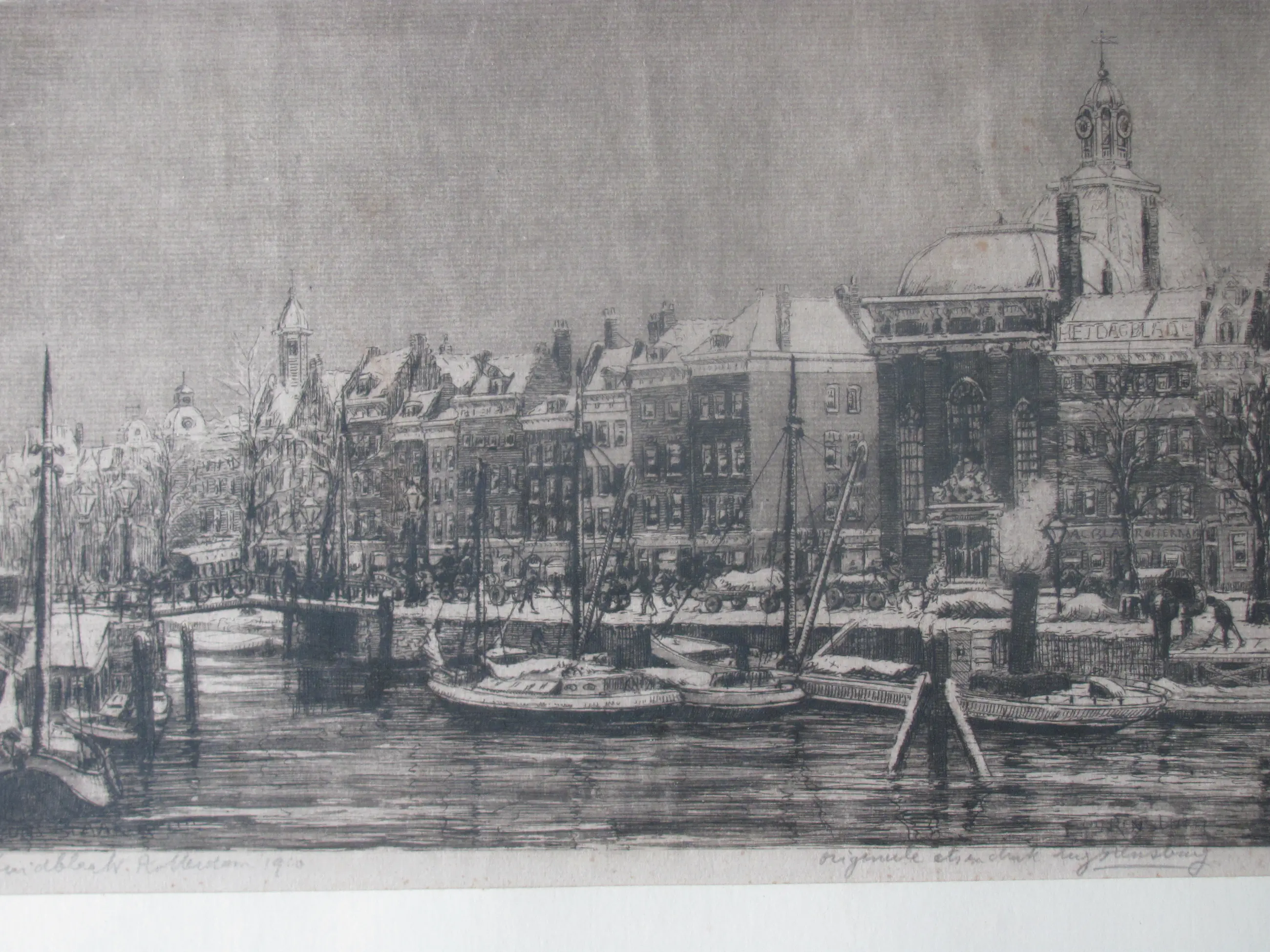 Ets van Eug. Rensburg van de Zuidblaak in Rotterdam in 1920. Linksonder met potlood getiteld en gedateerd. Rechtsonder met potlood gesigneerd en voorzien van tekst in potlood "originele ets" en ook in de plaat gesigneerd. Afbeelding van vooraan afgemeerde boten in het water. Rechts op de achtergrond de koepel van de Lutherse kerk.