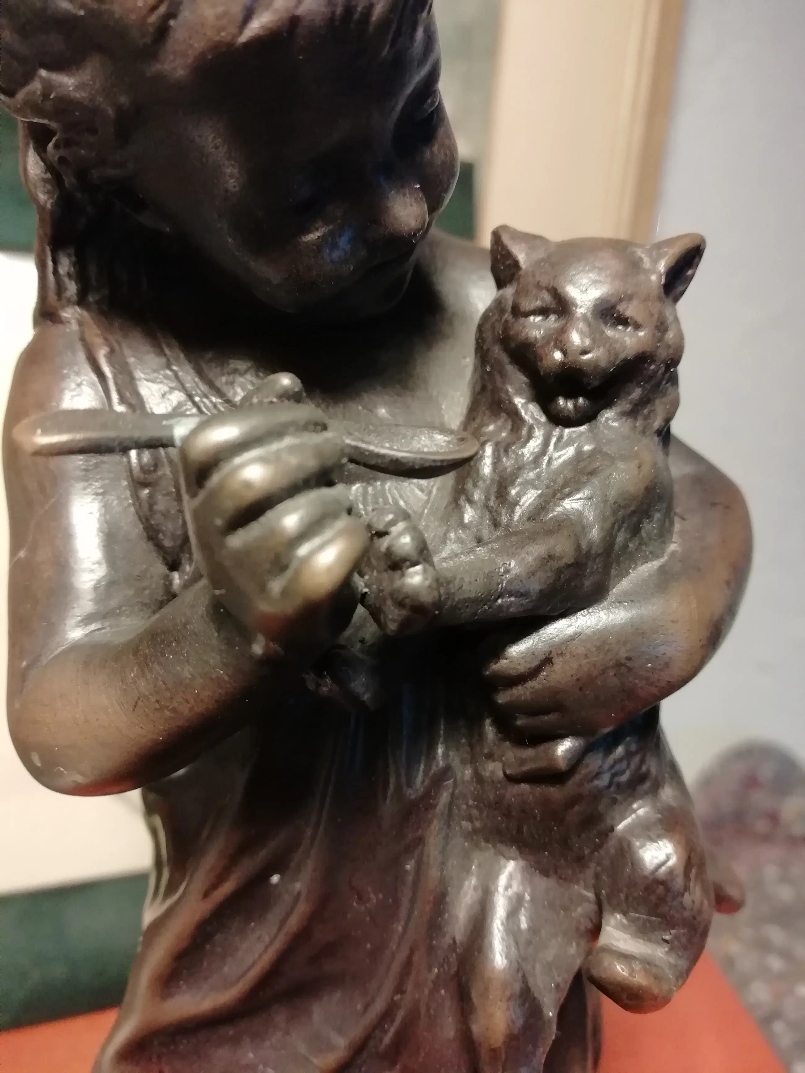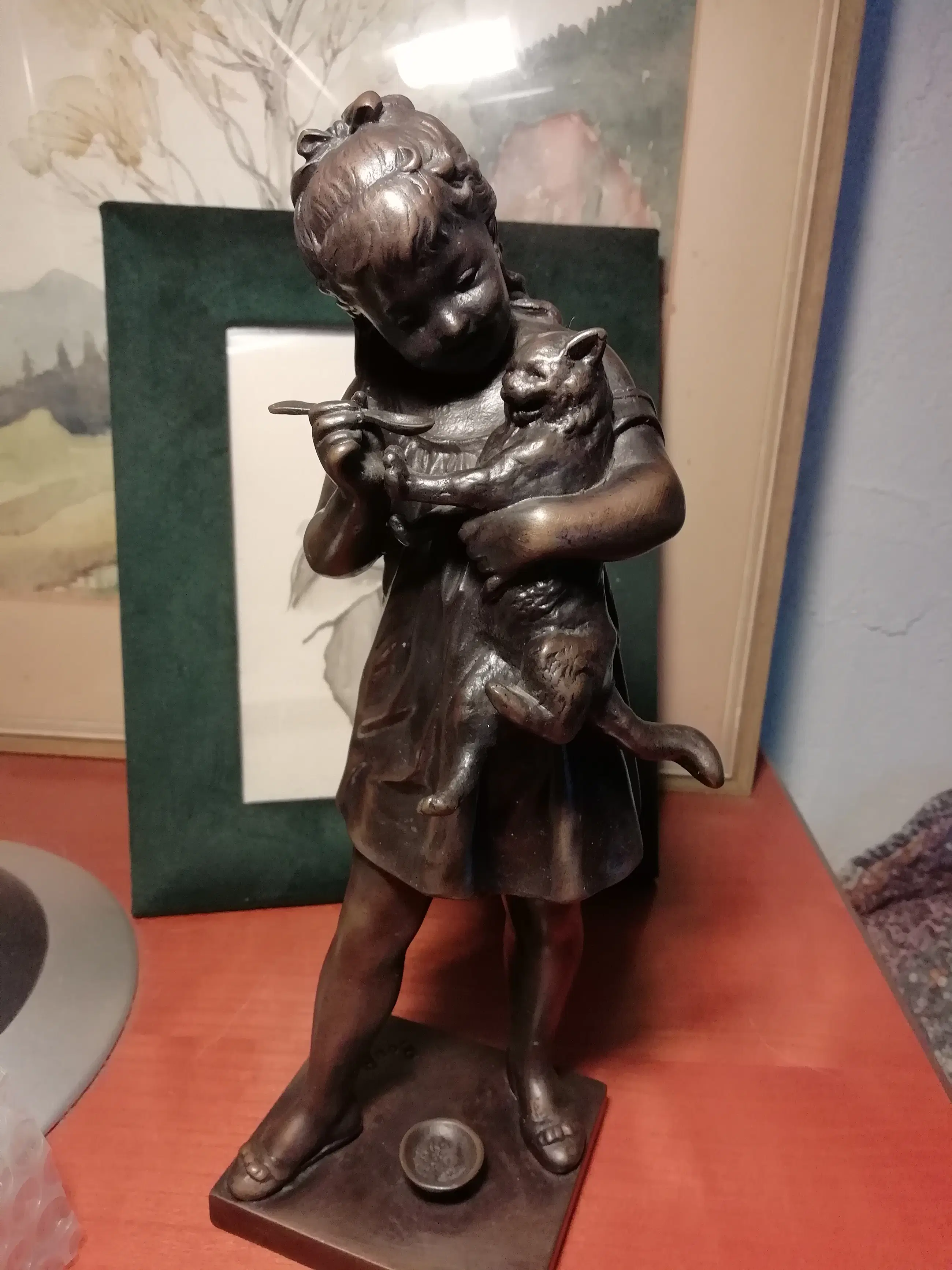 Prachtig bronzen beeld van een kind dat met een kat speelt. De afmetingen zijn bij benadering.