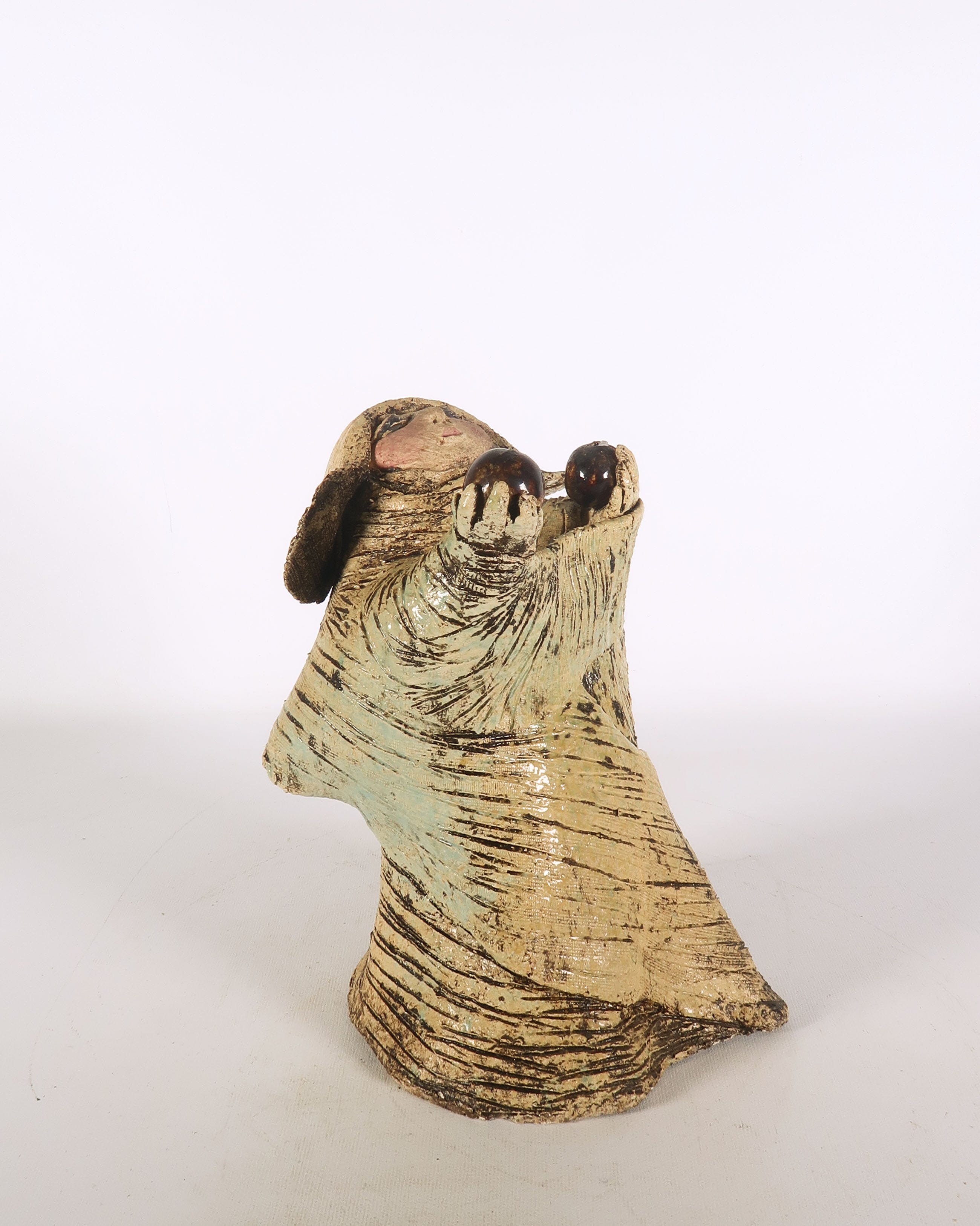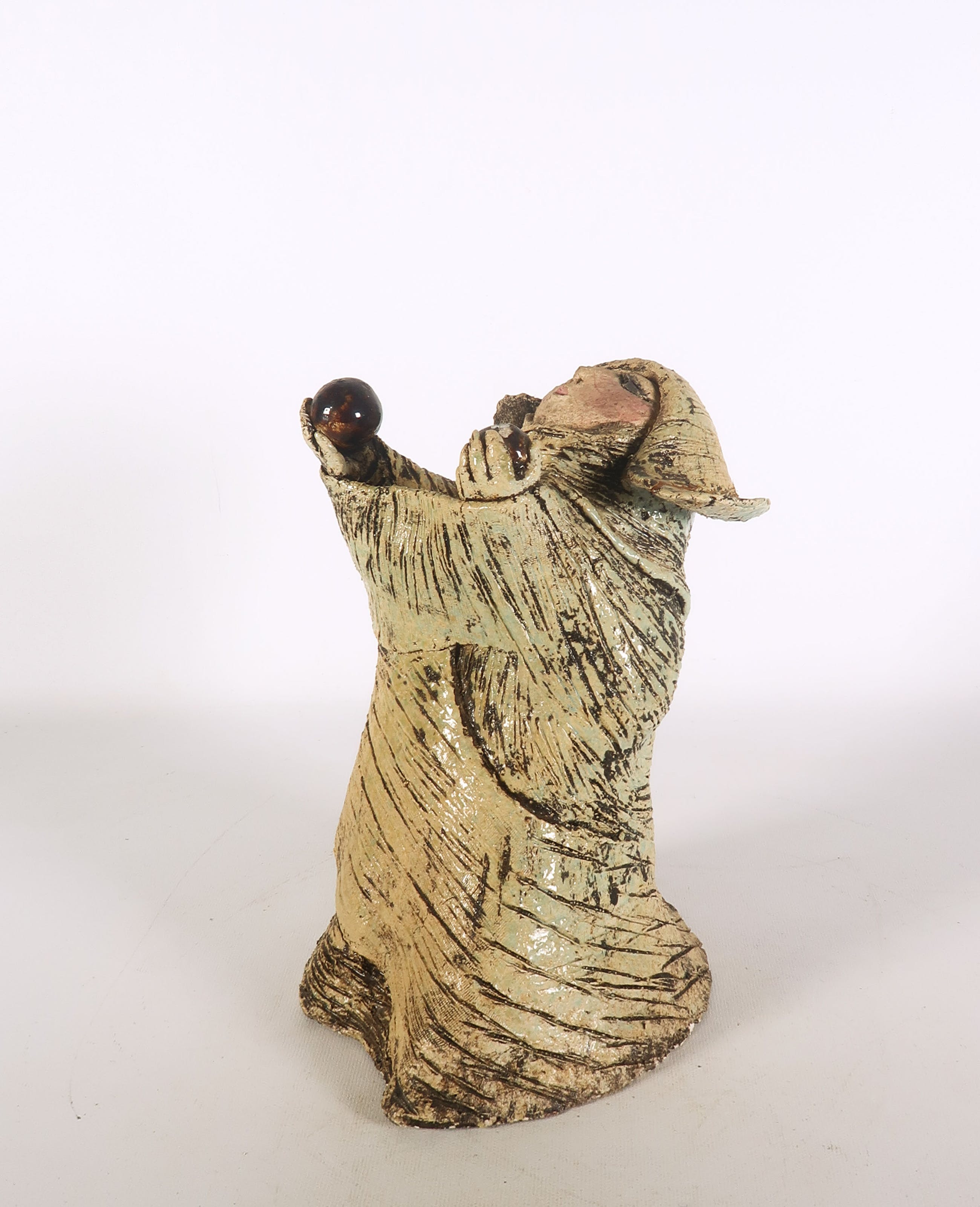 | Enkele lichte beschadigingen langs de rand van de jurk. Tevens is een bal met stok afgebroken van de linkerhand van de pop. | |||